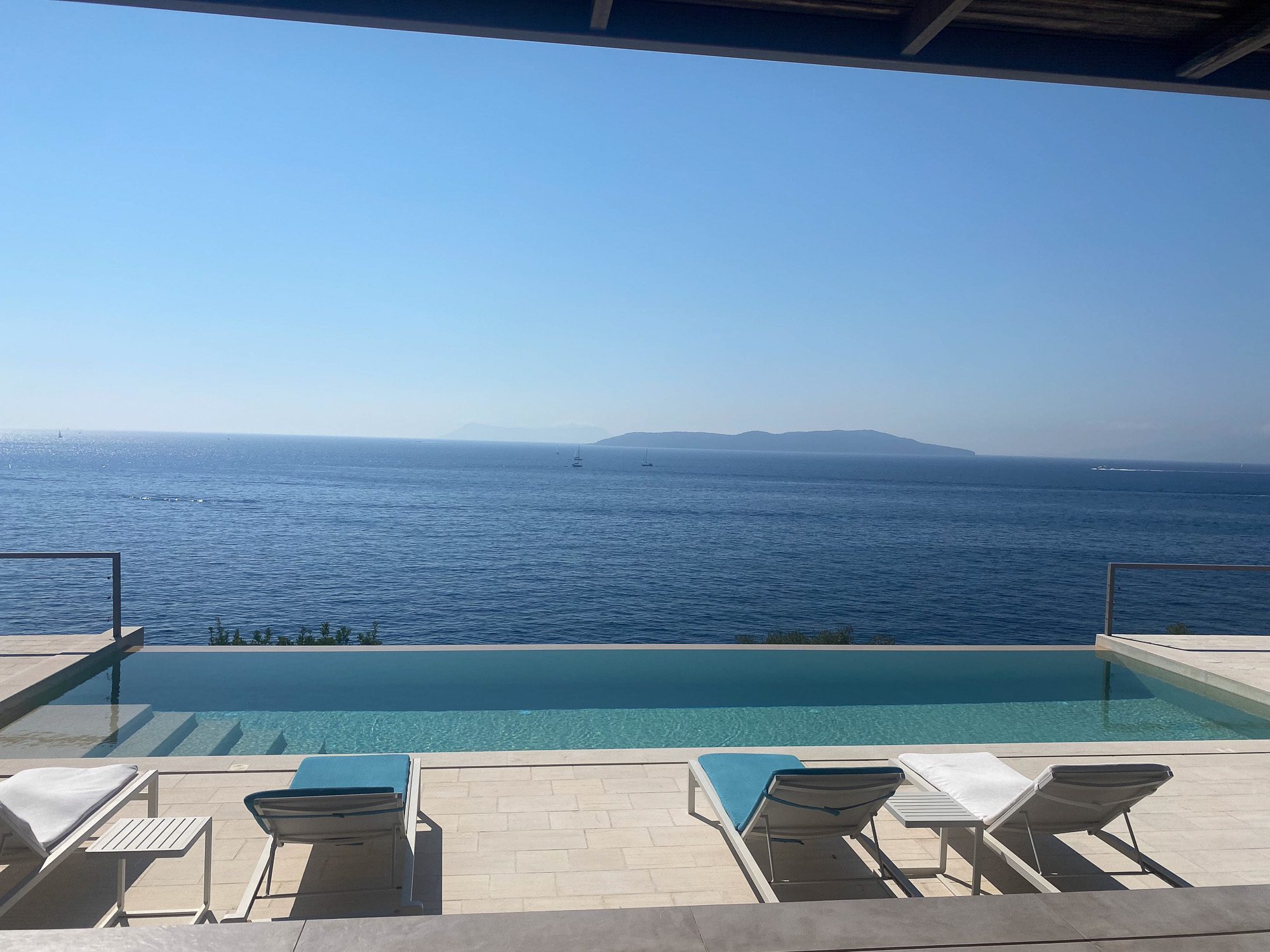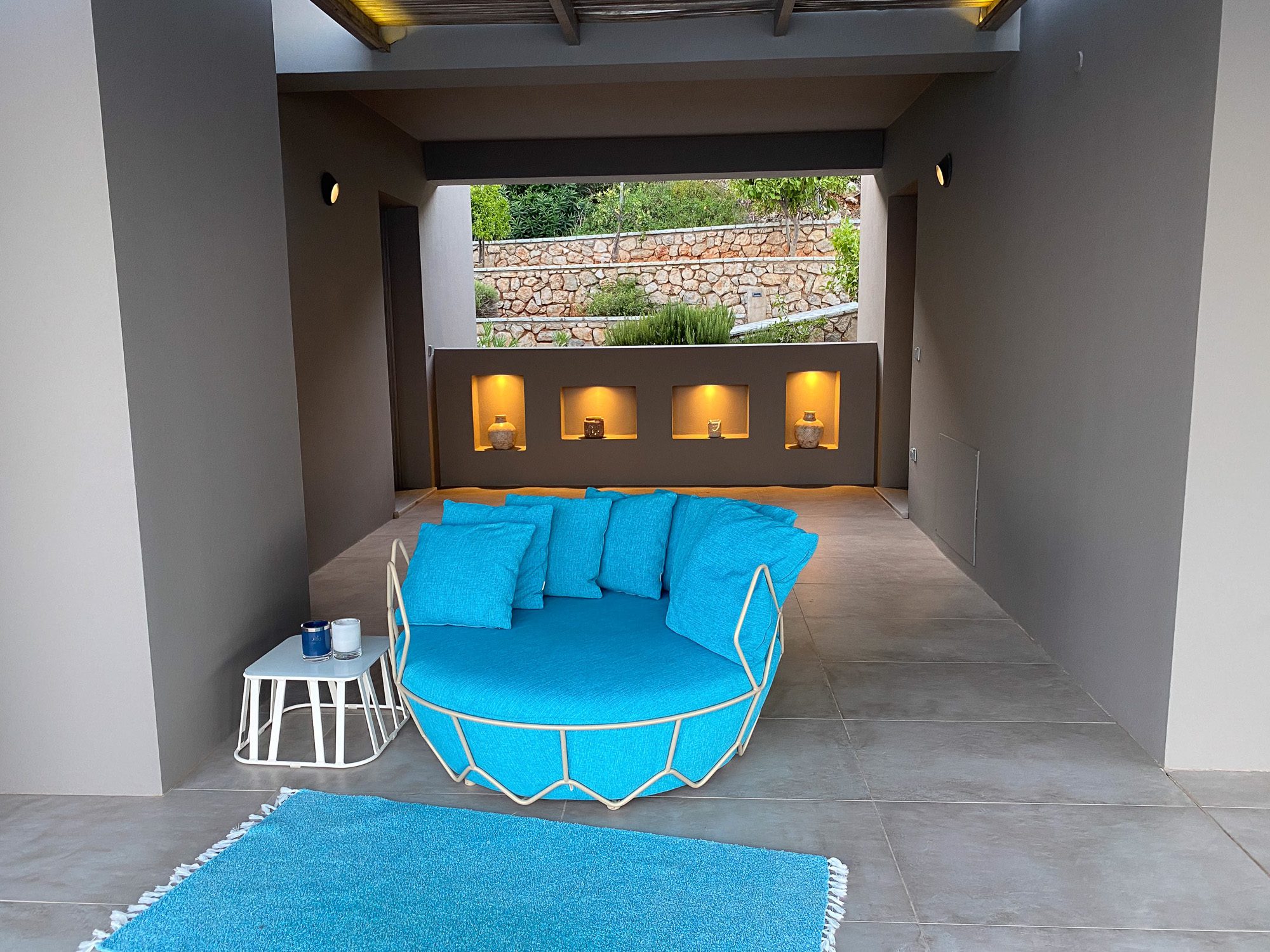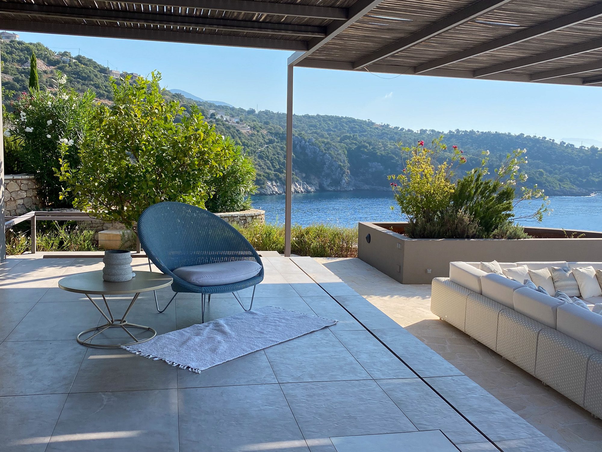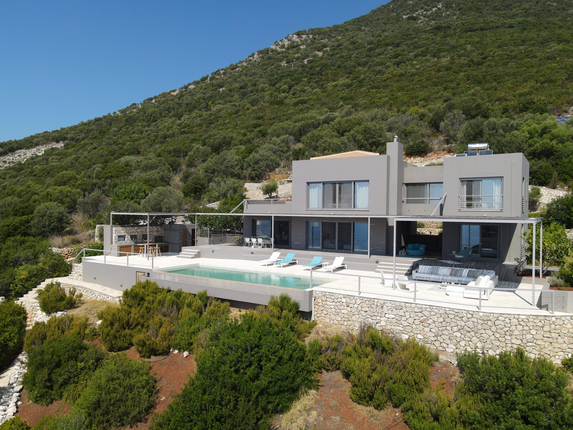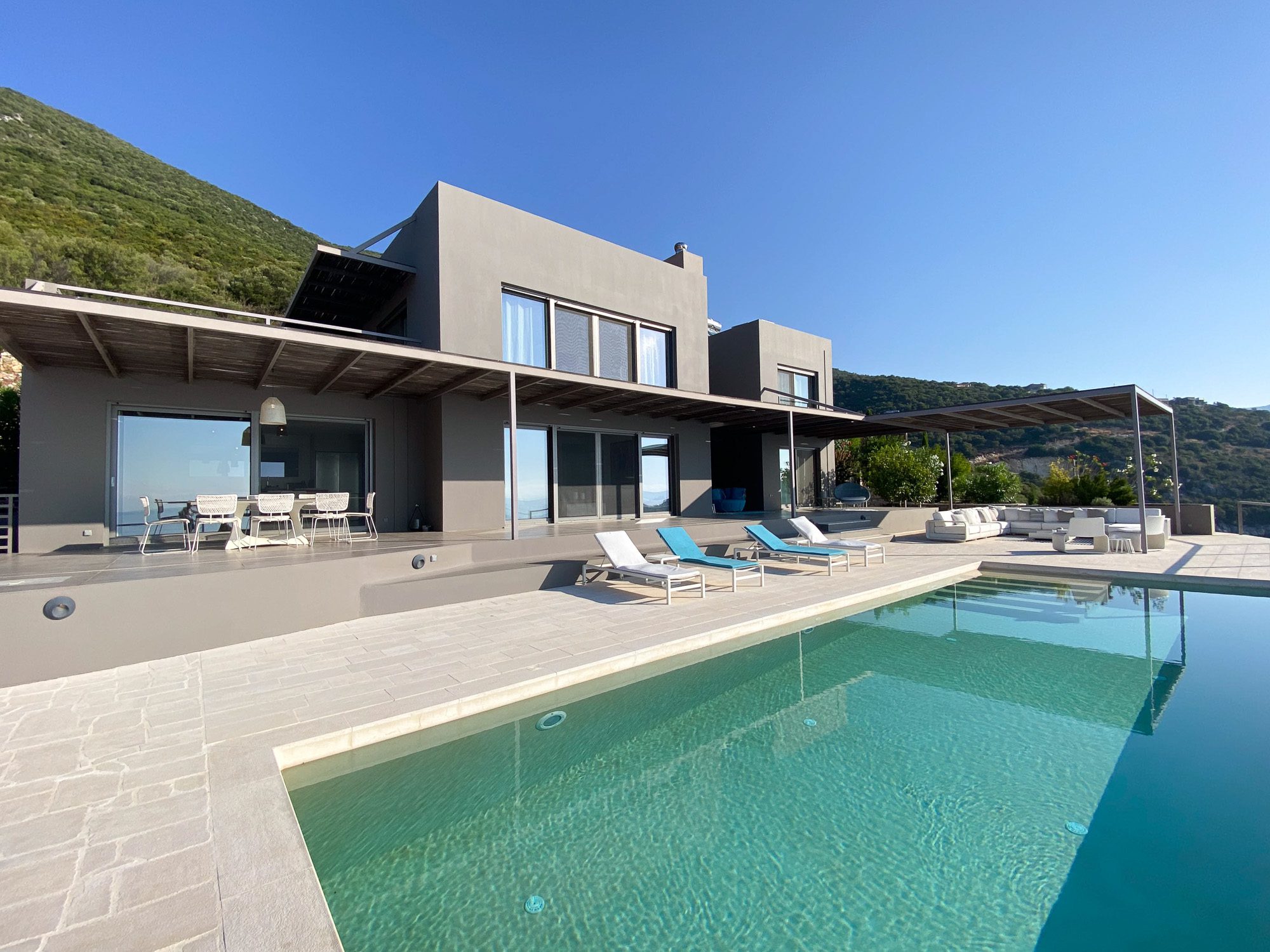 The multi-level terraces, facing out to sea, offer views of Kefalonia and Ithaca. Immediately outside the house is a covered al fresco dining area with steps down to the pool terrace, which features an enticing infinity pool, sun loungers, and an outdoor bar. On a higher terrace, there's a sizeable outdoor lounge with big, comfy cushioned sofas.