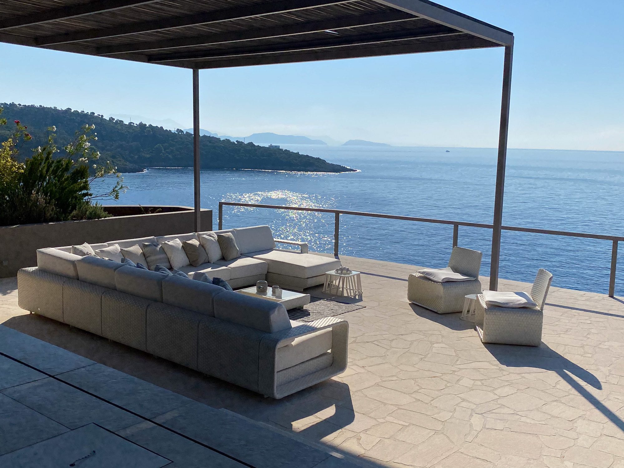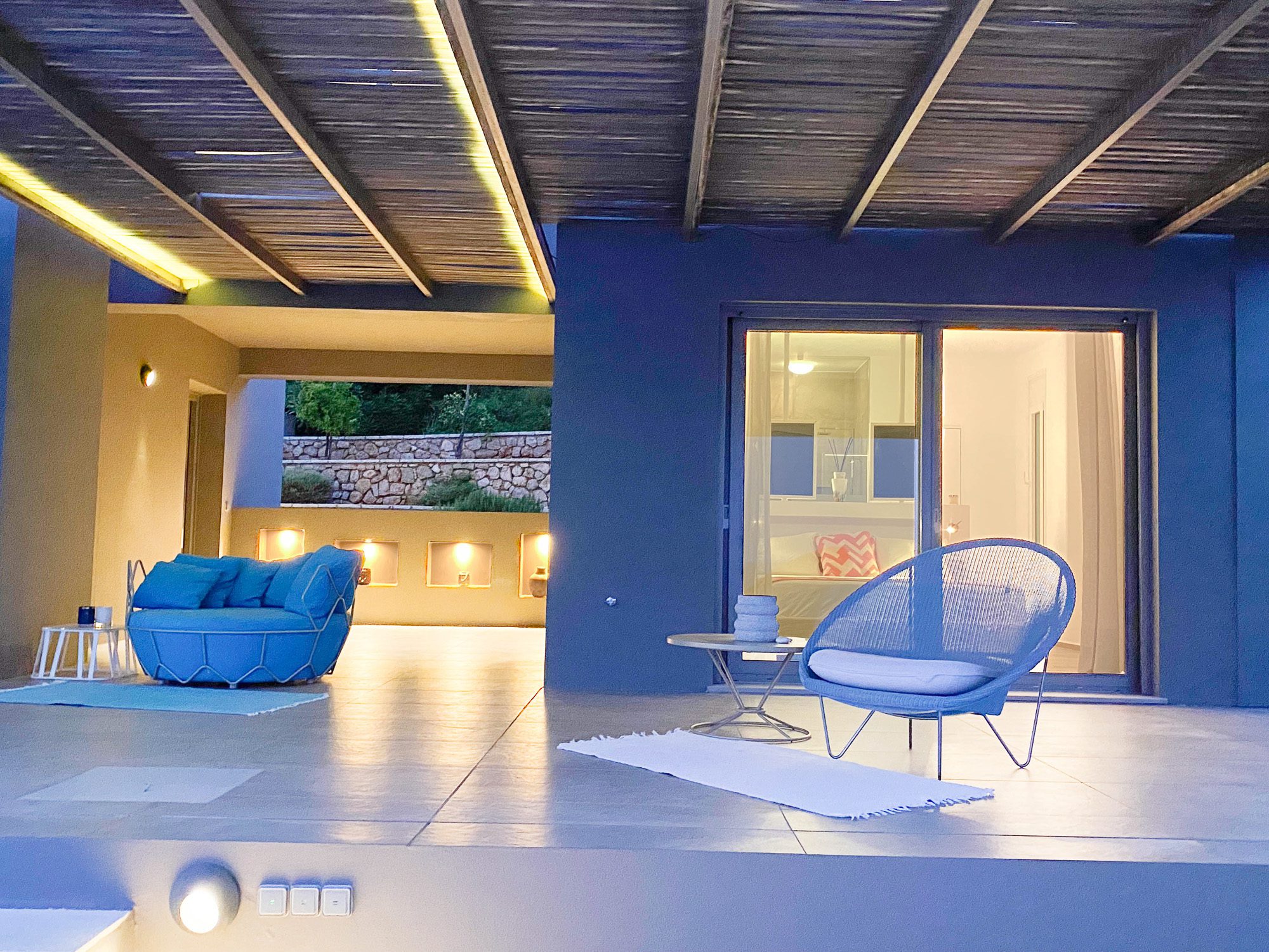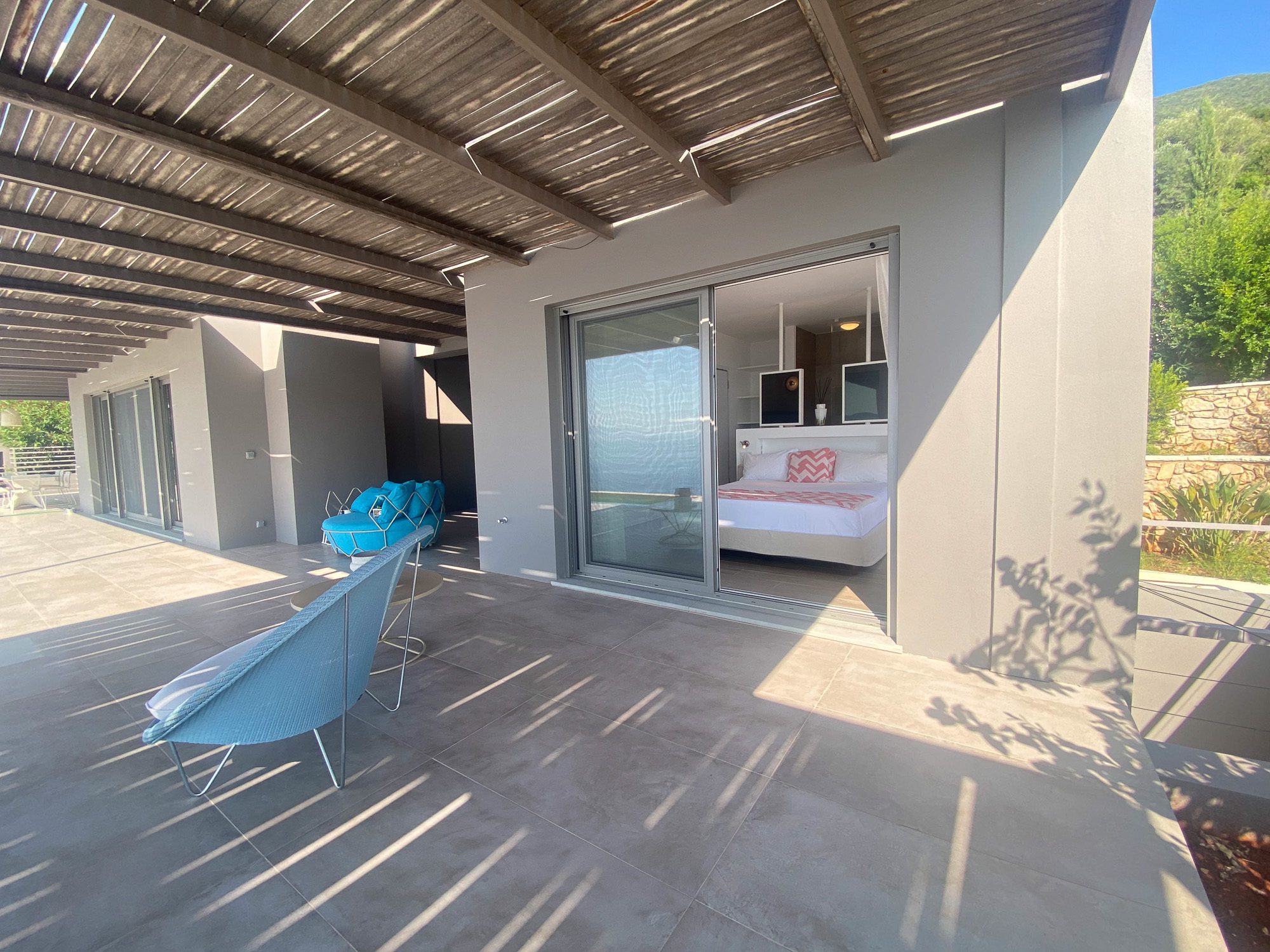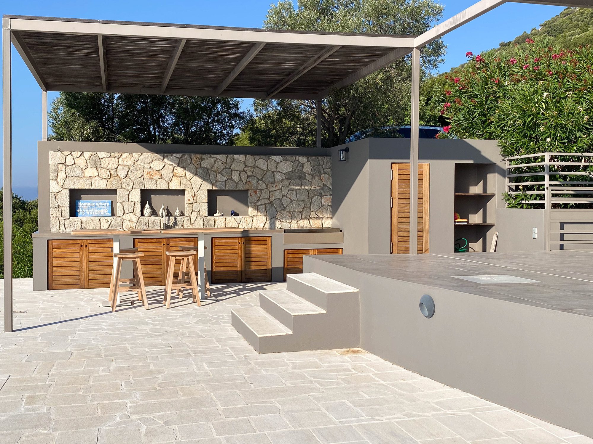 The multi-level terraces, facing out to sea, offer views of Kefalonia and Ithaca. Immediately outside the house is a covered al fresco dining area with steps down to the pool terrace, which features an enticing infinity pool, sun loungers, and an outdoor bar. On a higher terrace, there's a sizeable outdoor lounge with big, comfy cushioned sofas.