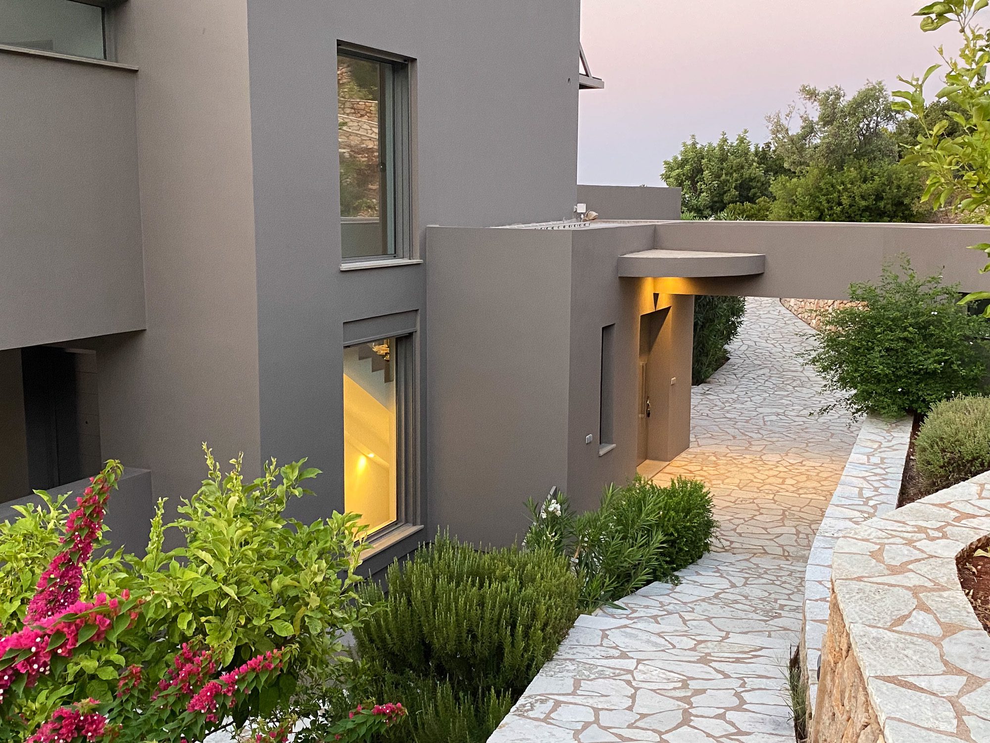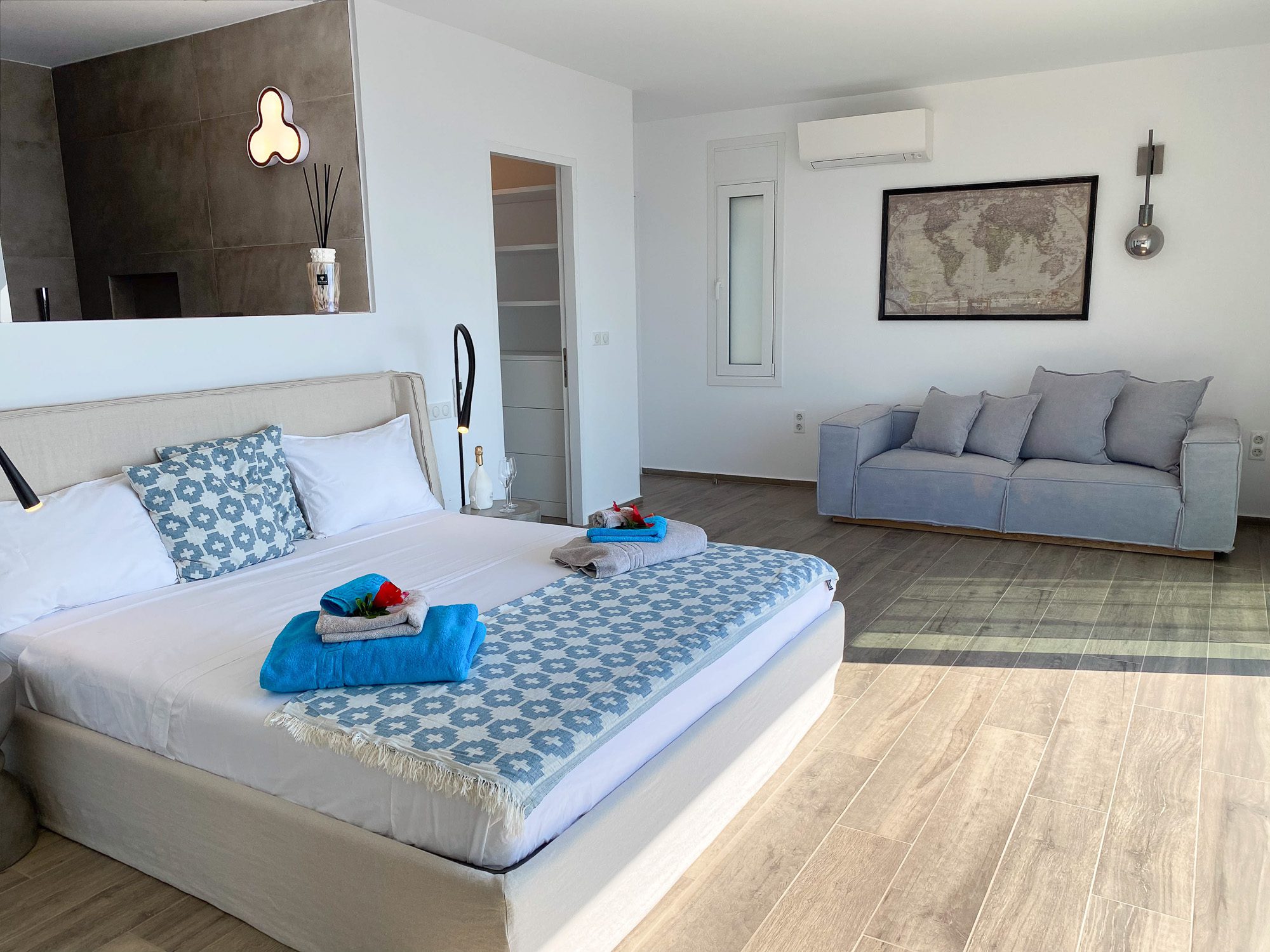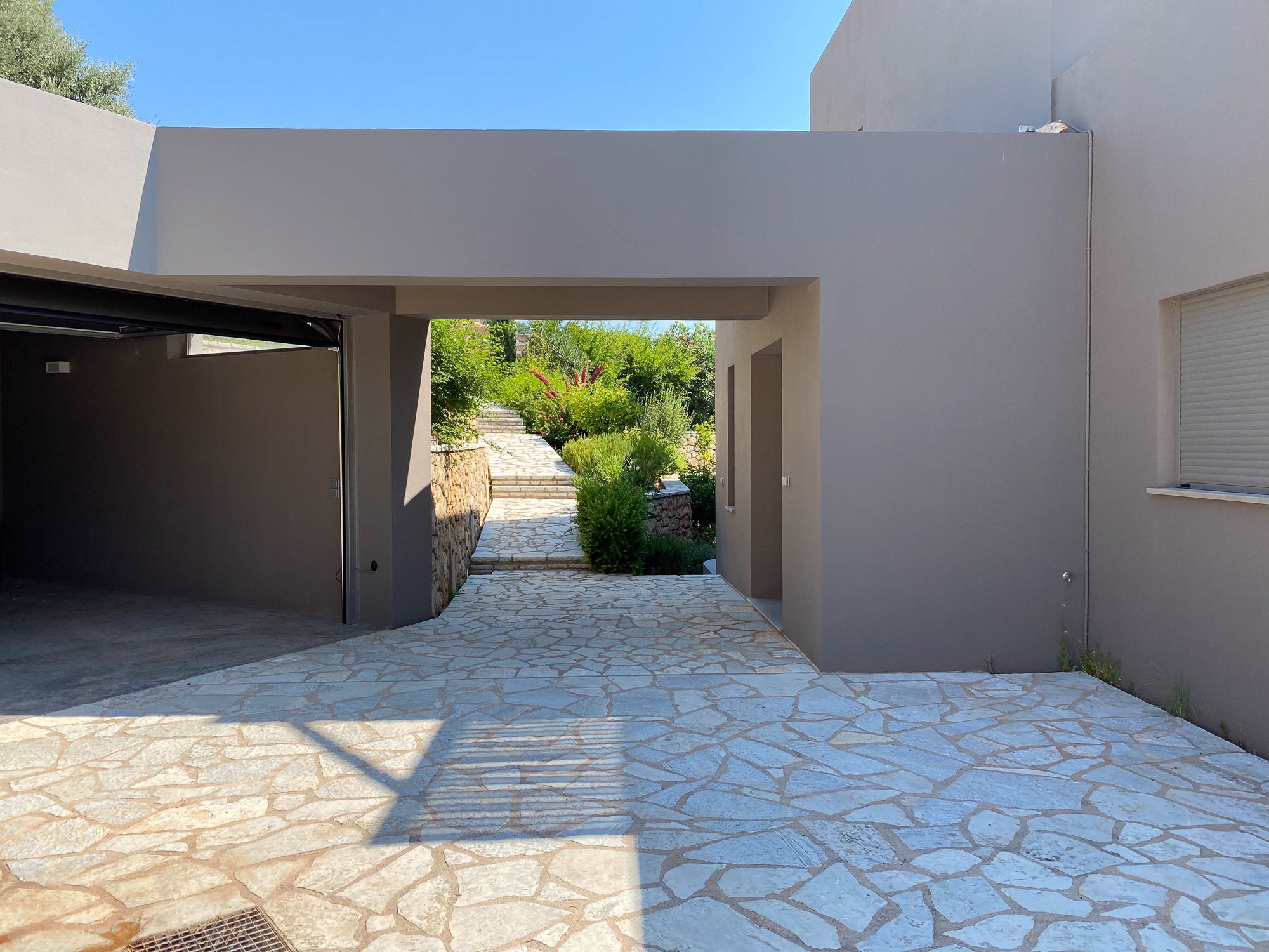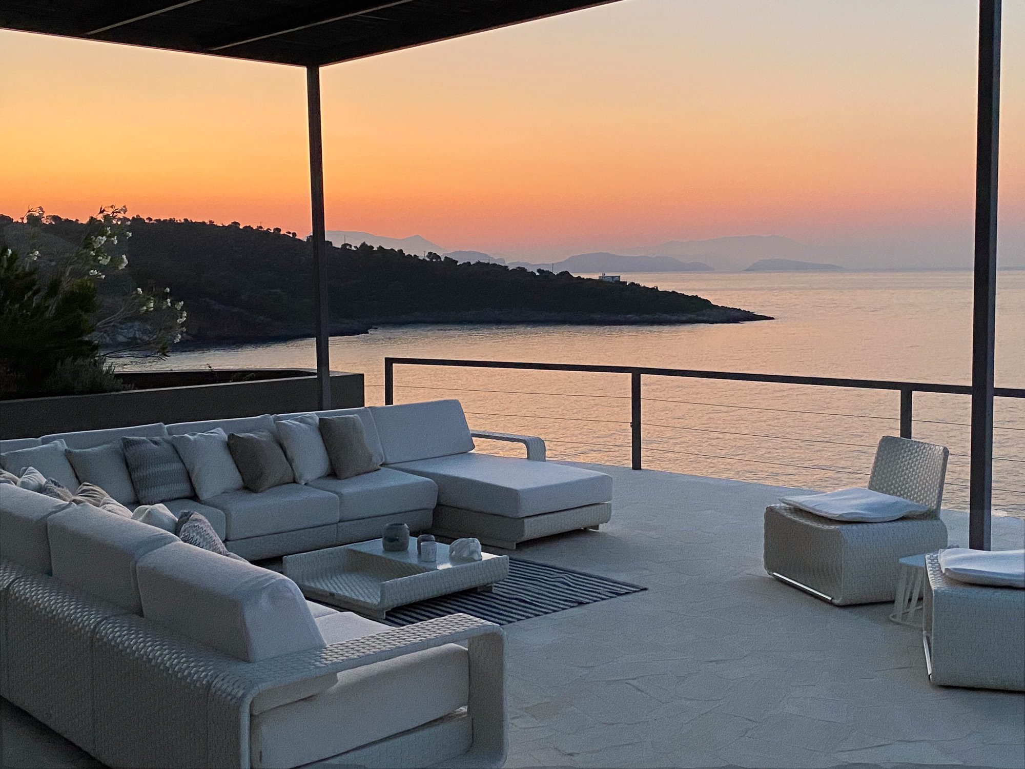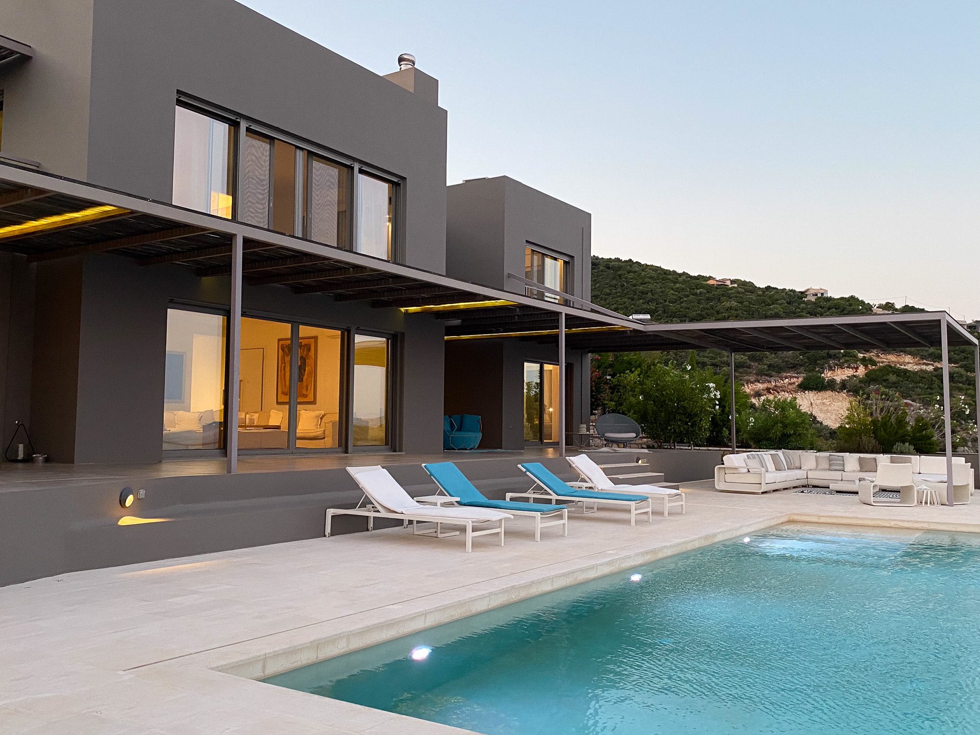 The multi-level terraces, facing out to sea, offer views of Kefalonia and Ithaca. Immediately outside the house is a covered al fresco dining area with steps down to the pool terrace, which features an enticing infinity pool, sun loungers, and an outdoor bar. On a higher terrace, there's a sizeable outdoor lounge with big, comfy cushioned sofas.