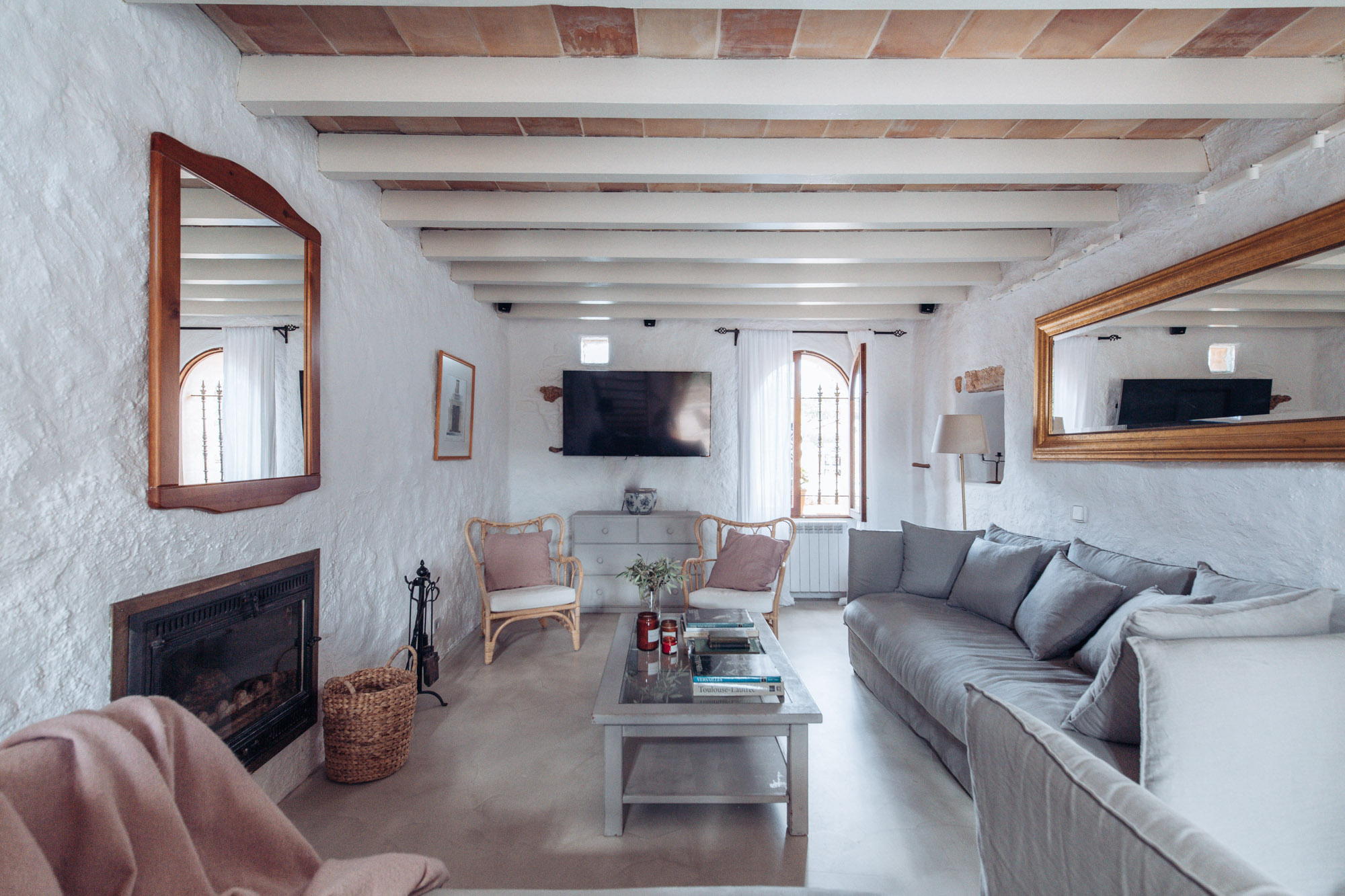 Each bedroom oozes character, with beautiful, vintage furniture that stands out against pastel walls and floors. Four of the bedrooms have ensuite facilities, and there are large windows that welcome peaceful countryside views. Two of the bedrooms have their own separate entrance, with no internal access, with their own terrace. The kitchen is the heart of the home—personally designed by the owners themselves, who love to cook big family meals here. Cosy living spaces are plentiful, with a fully stocked library, an open fireplace, and a dedicated yoga and board game area.