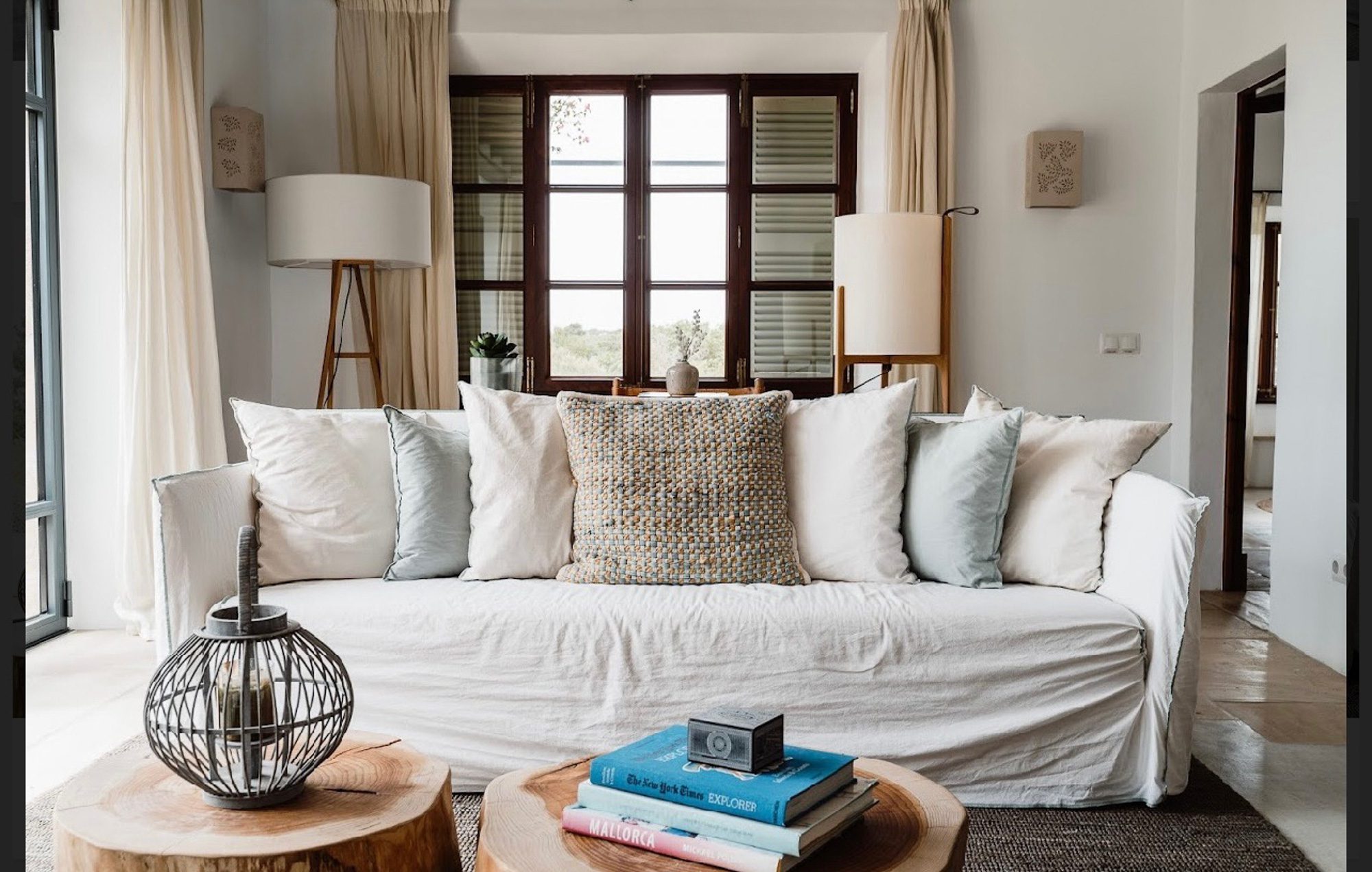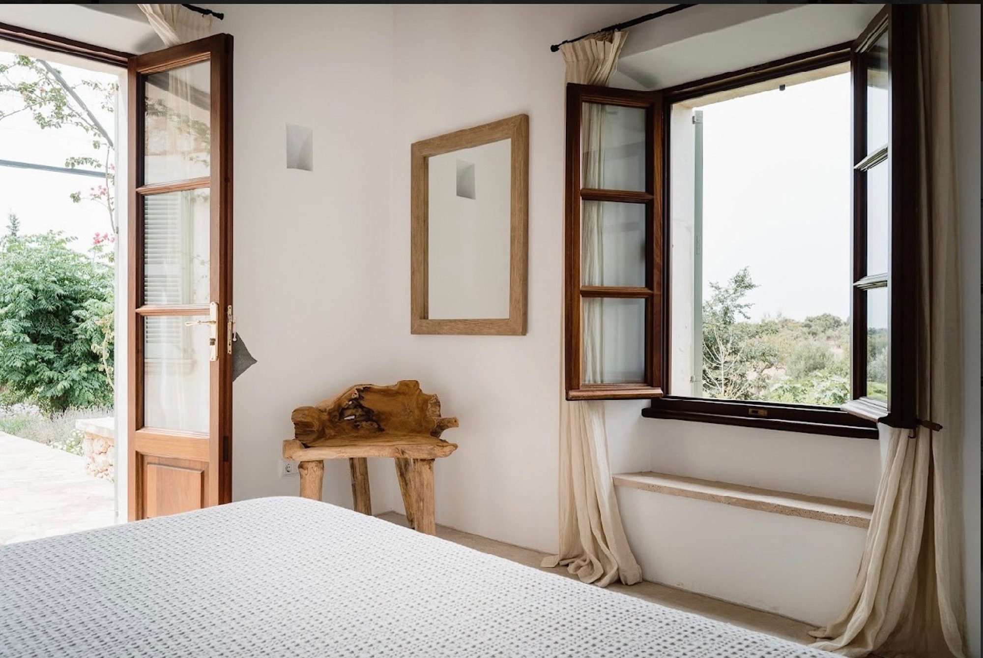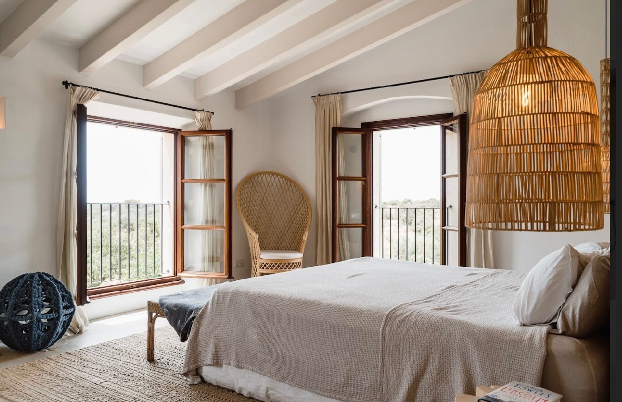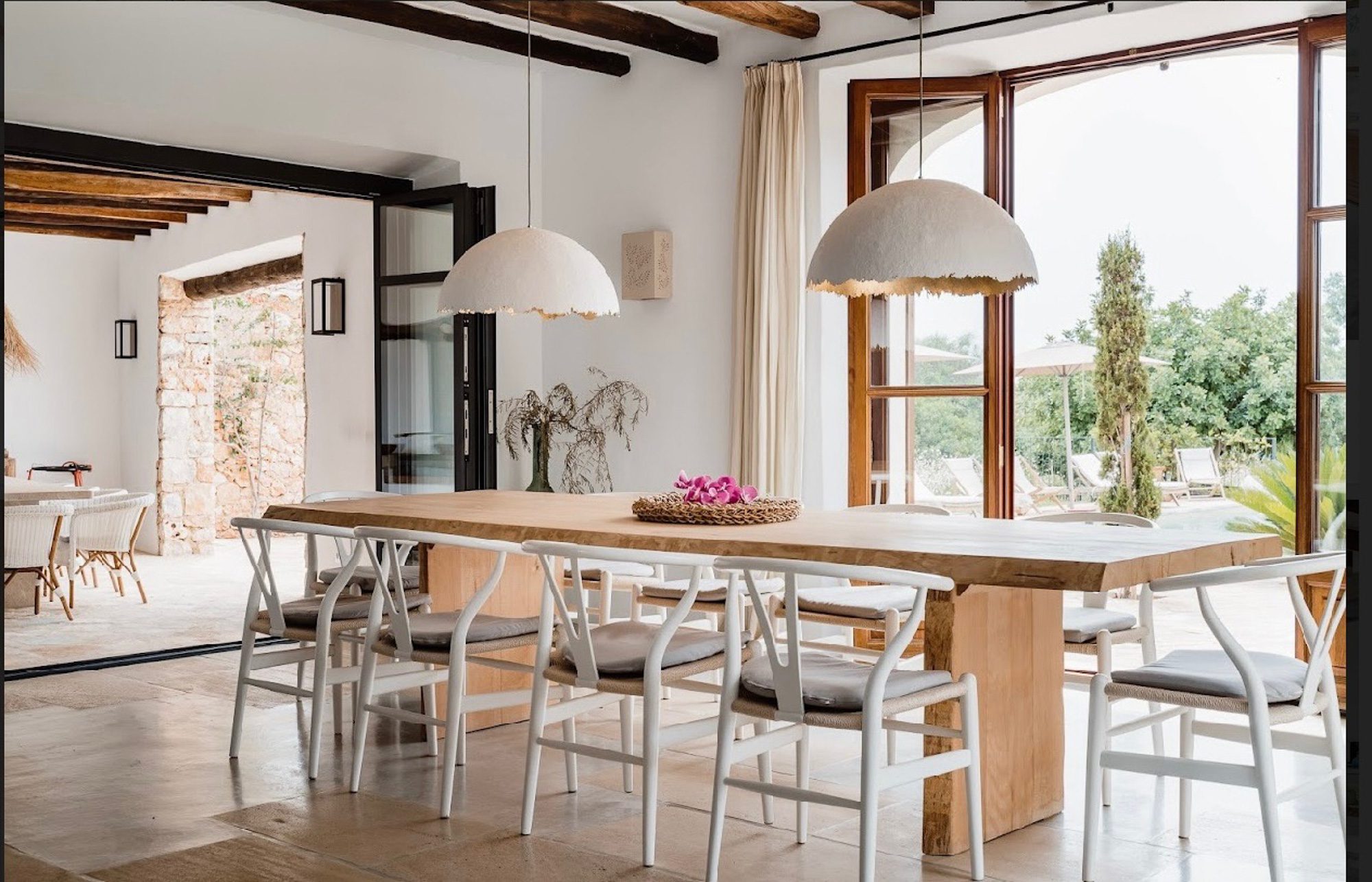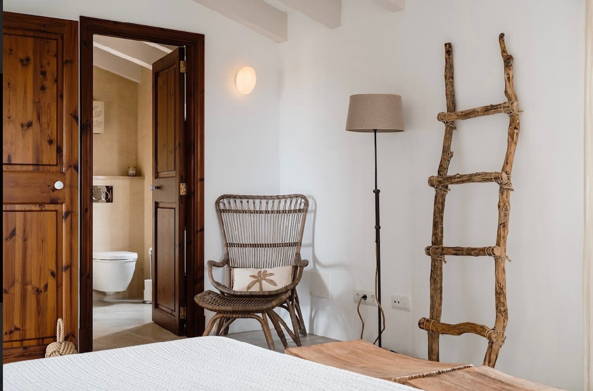 The south-facing garden and extensive grounds merge seamlessly into the fields beyond, thus extending the sense of space. From the first floor of the house, you can see the sea; the nearest sandy beaches are a short drive away at the edge of the Mondrago National Park.