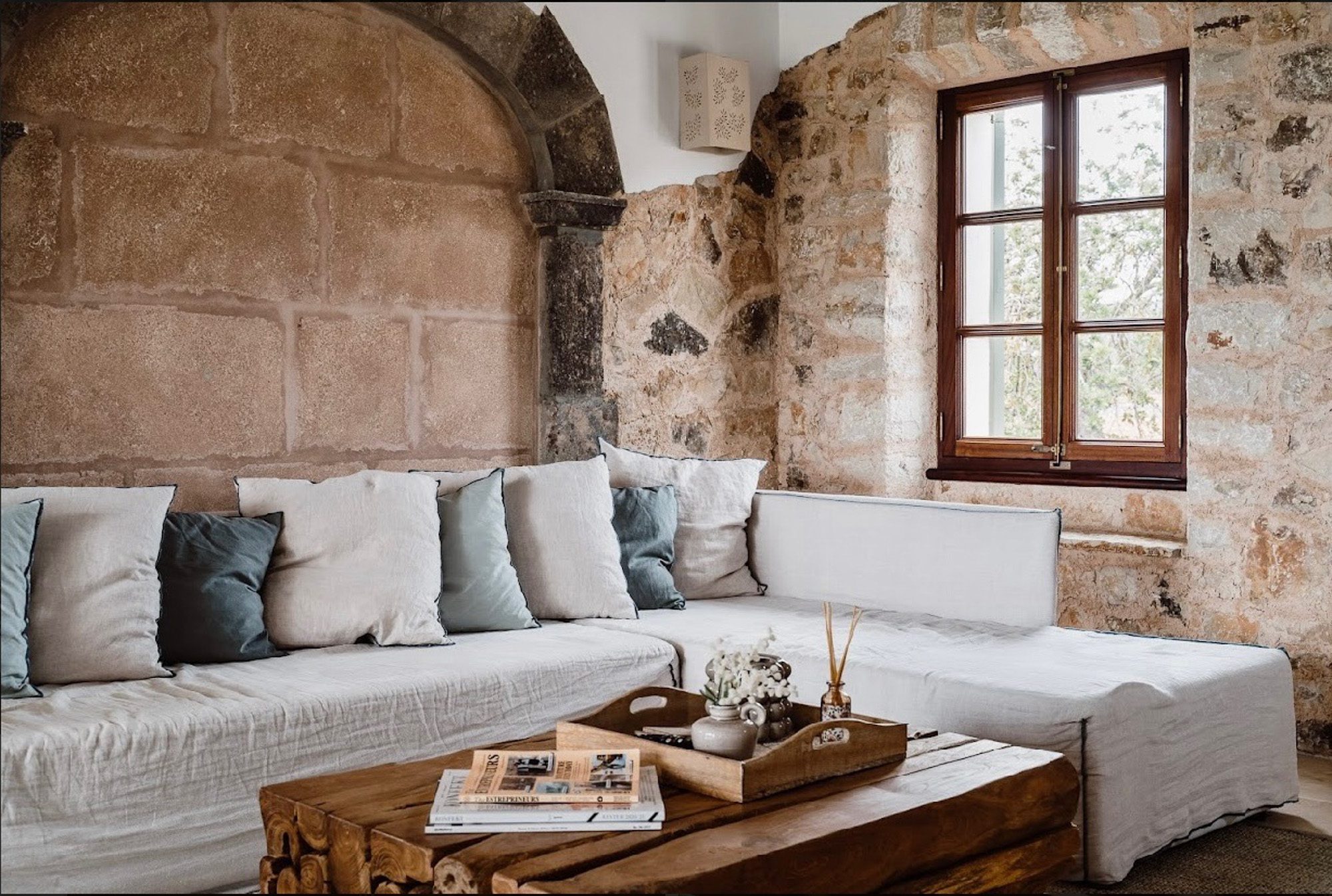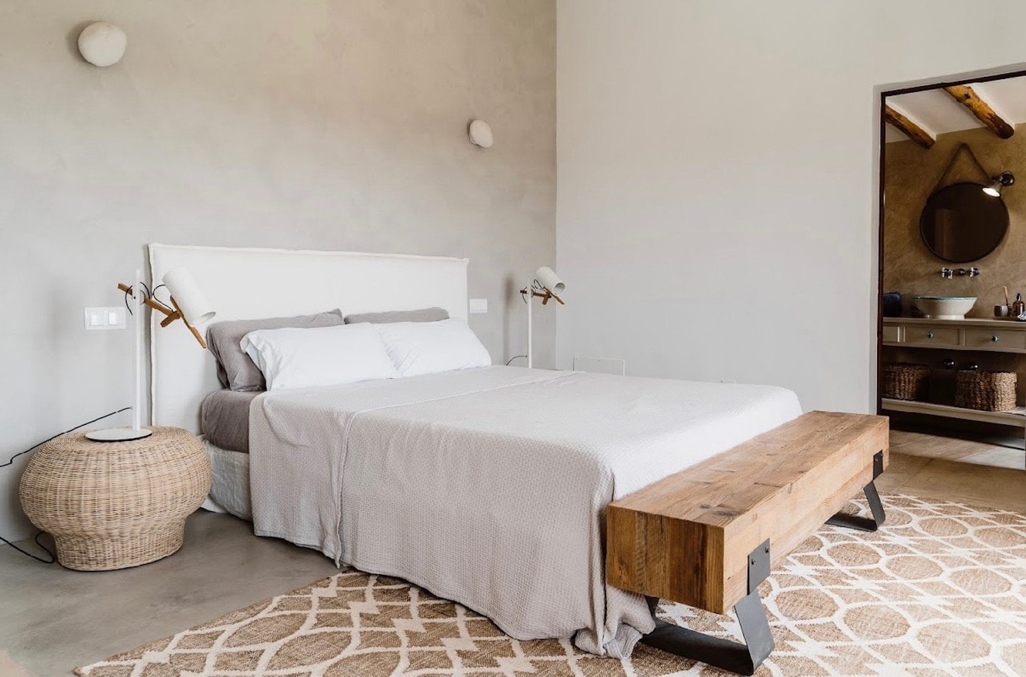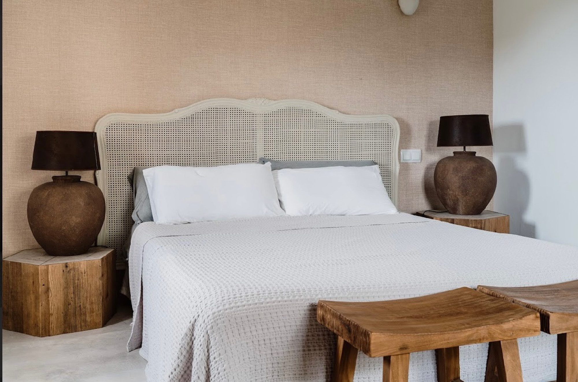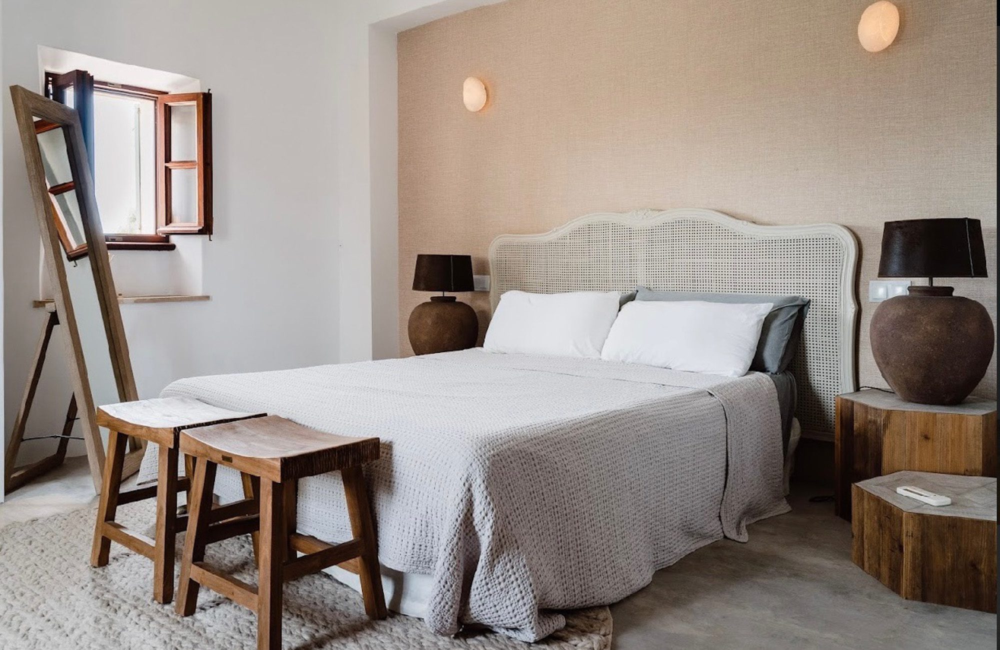 Natural stone walls, cool flagstone floors and wooden beams are paired with funky furnishings such as tree-trunk tables, driftwood pieces, abstract art and thick-weave rugs in natural dyes. All the bedrooms, finished in a neutral palette, are calm and spacious. Three, including the master, are on the first floor, and two are on the ground floor. One is a children’s room with bunk beds; the other has French doors opening to its own garden pergola. The living room has sofas and a hanging swing chair; the dining room seats up to 10 and has large doors opening to the terrace; there’s filtered water on tap in the kitchen.