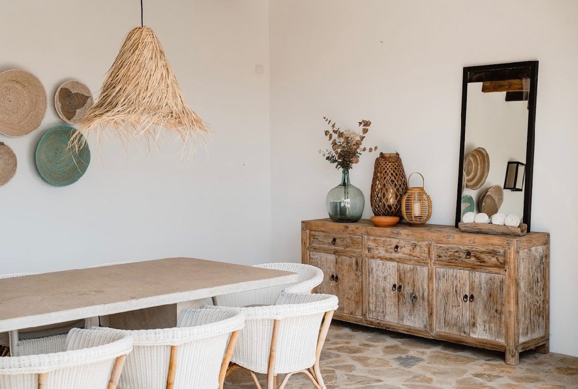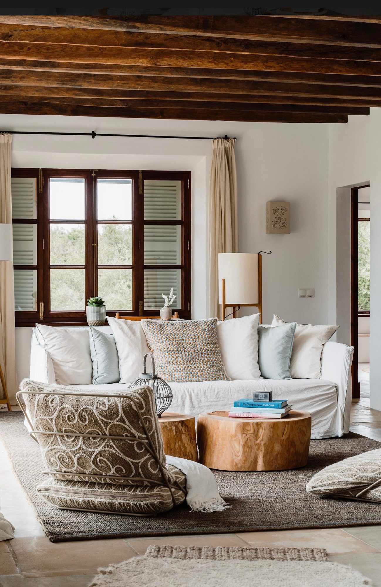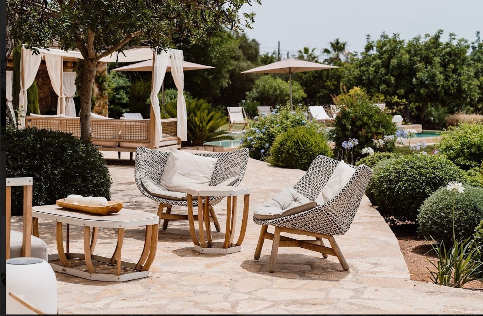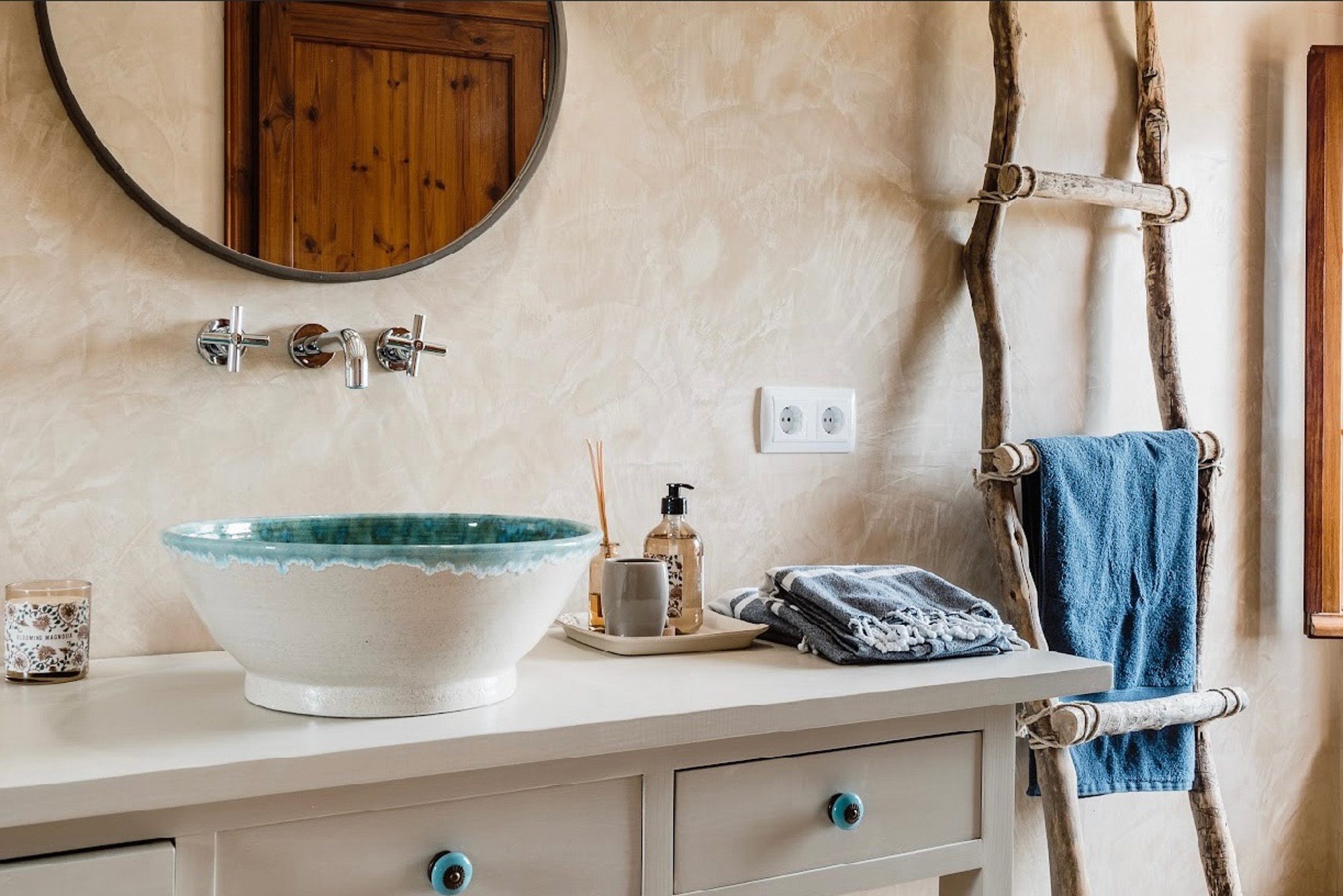 Natural stone walls, cool flagstone floors and wooden beams are paired with funky furnishings such as tree-trunk tables, driftwood pieces, abstract art and thick-weave rugs in natural dyes. All the bedrooms, finished in a neutral palette, are calm and spacious. Three, including the master, are on the first floor, and two are on the ground floor. One is a children’s room with bunk beds; the other has French doors opening to its own garden pergola. The living room has sofas and a hanging swing chair; the dining room seats up to 10 and has large doors opening to the terrace; there’s filtered water on tap in the kitchen.