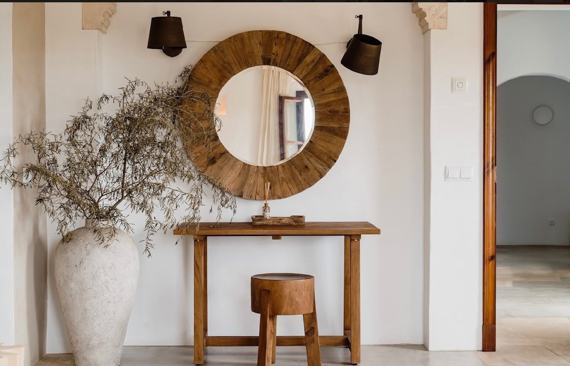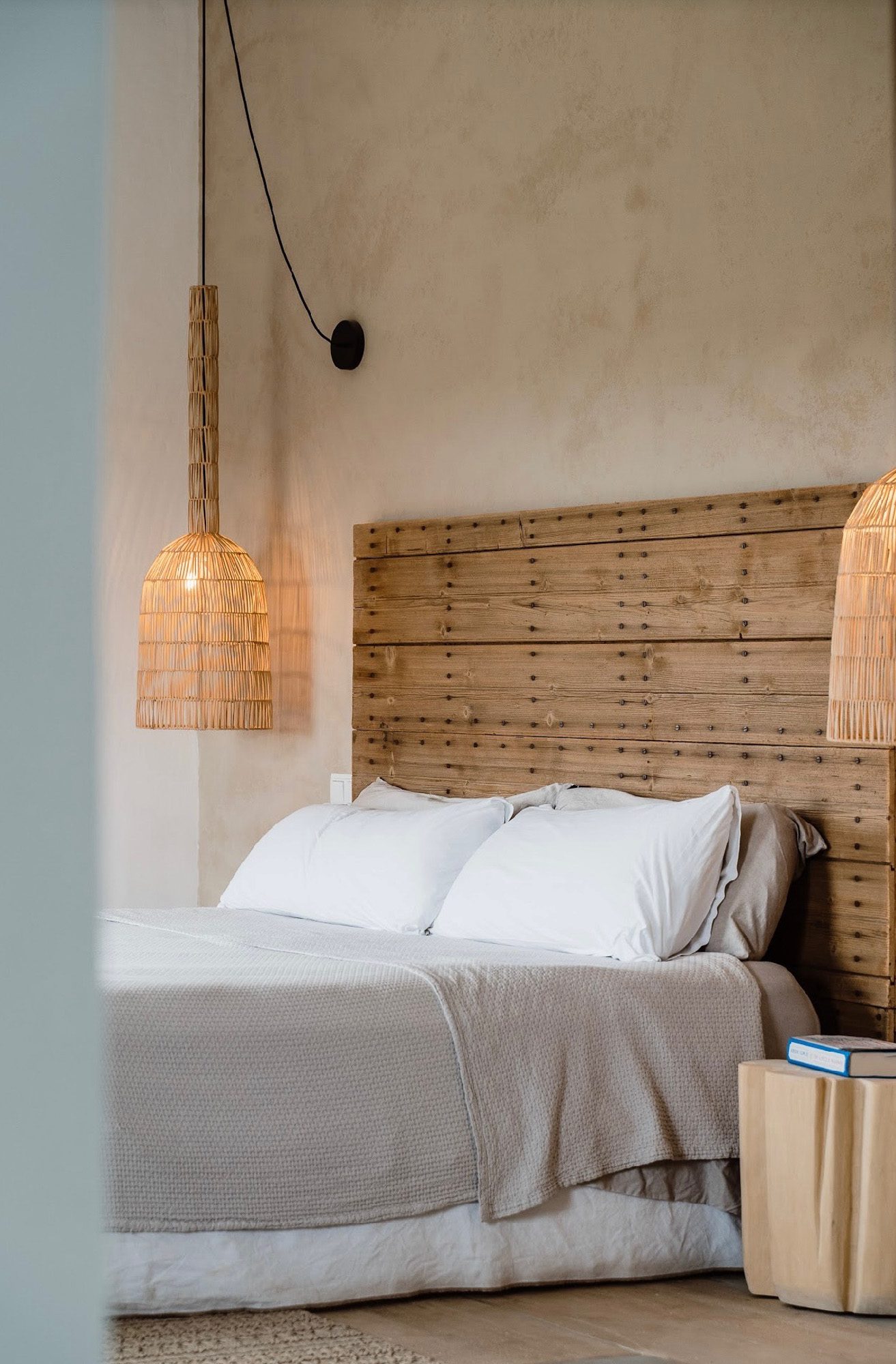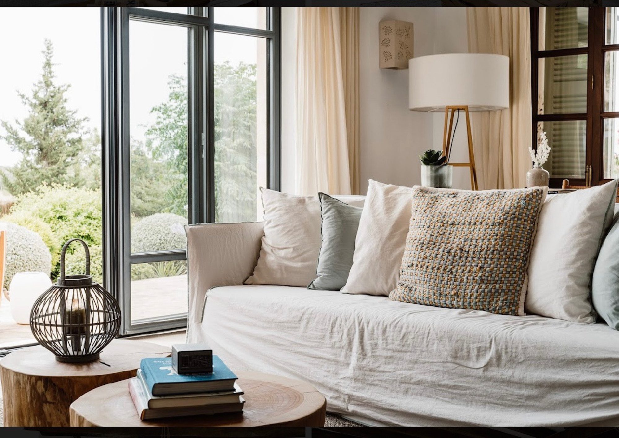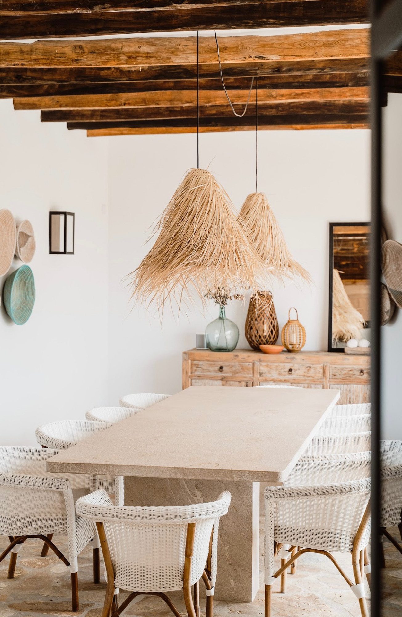 Natural stone walls, cool flagstone floors and wooden beams are paired with funky furnishings such as tree-trunk tables, driftwood pieces, abstract art and thick-weave rugs in natural dyes. All the bedrooms, finished in a neutral palette, are calm and spacious. Three, including the master, are on the first floor, and two are on the ground floor. One is a children’s room with bunk beds; the other has French doors opening to its own garden pergola. The living room has sofas and a hanging swing chair; the dining room seats up to 10 and has large doors opening to the terrace; there’s filtered water on tap in the kitchen.