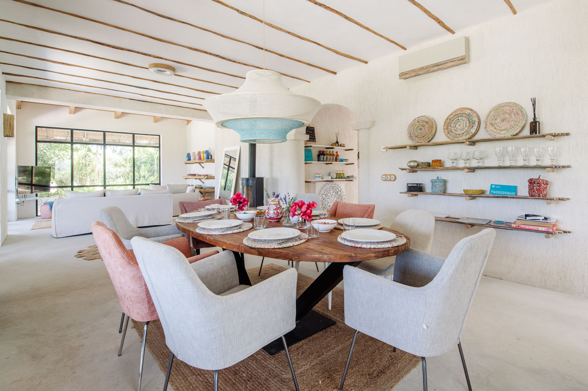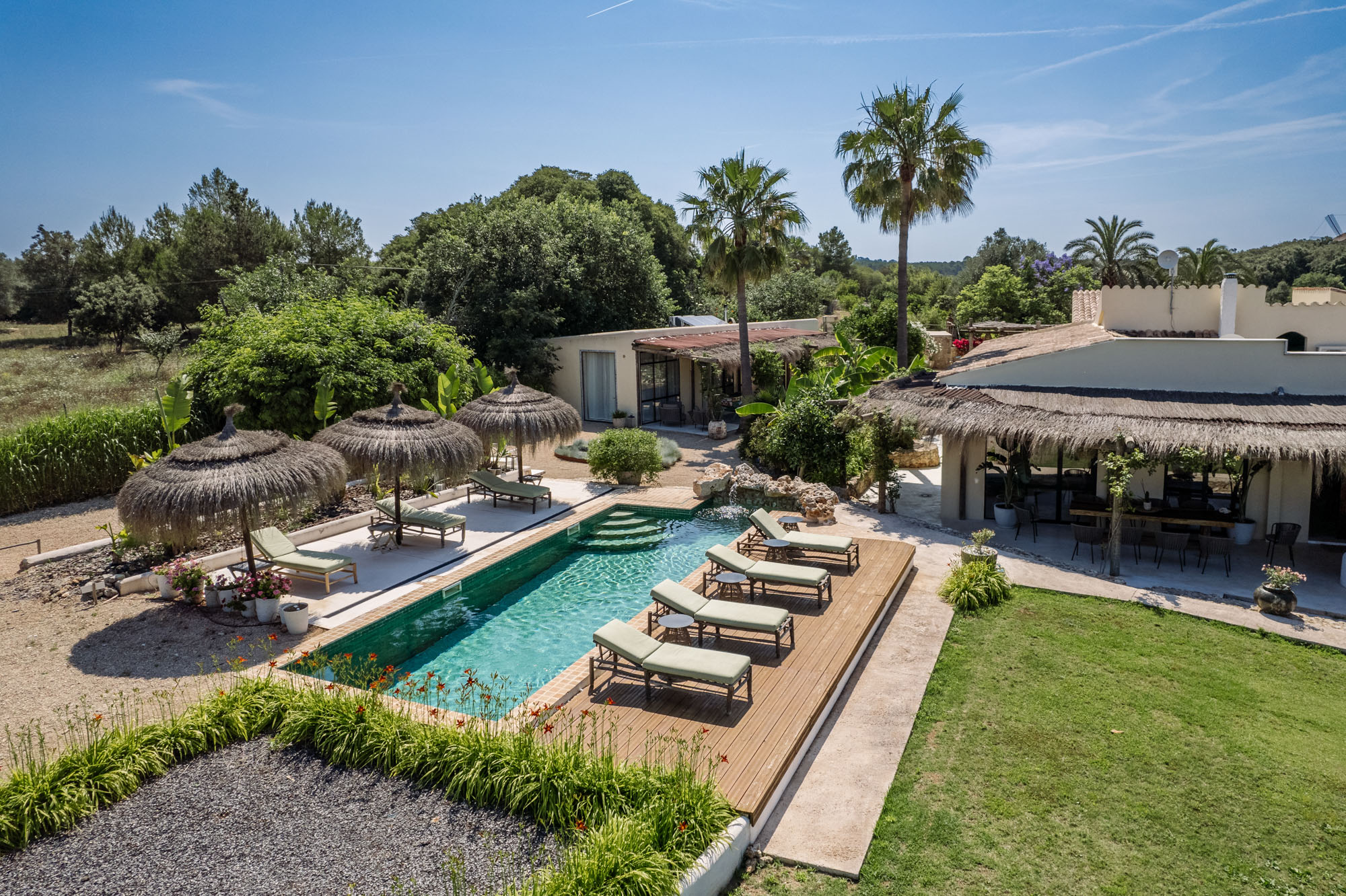 An eclectic mix of decorative elements adds interest and colour. The main living spaces flow seamlessly into one another, giving access to the large surrounding terrace. All five en suite bedrooms have views of the gardens and surrounding nature, and each has a door leading to seating on the terrace.