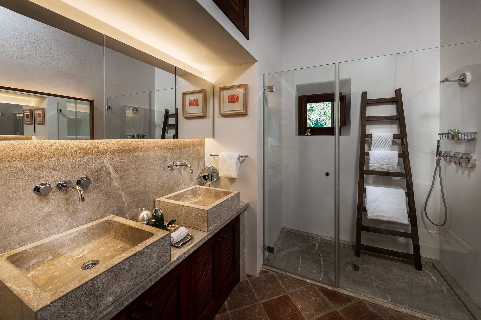 A covered area provides shade over large sofas and armchairs, offering views across the gardens to the sea. Steps lead down to the 12-meter pool, which features comfortable sun loungers on the surrounding stone terrace, secluded by trees and shrubs. Flowers, evergreens, and palms in terracotta pots grace the courtyard and terraces. Guests have access to a shared tennis court a few minutes drive away, along with two other villas.