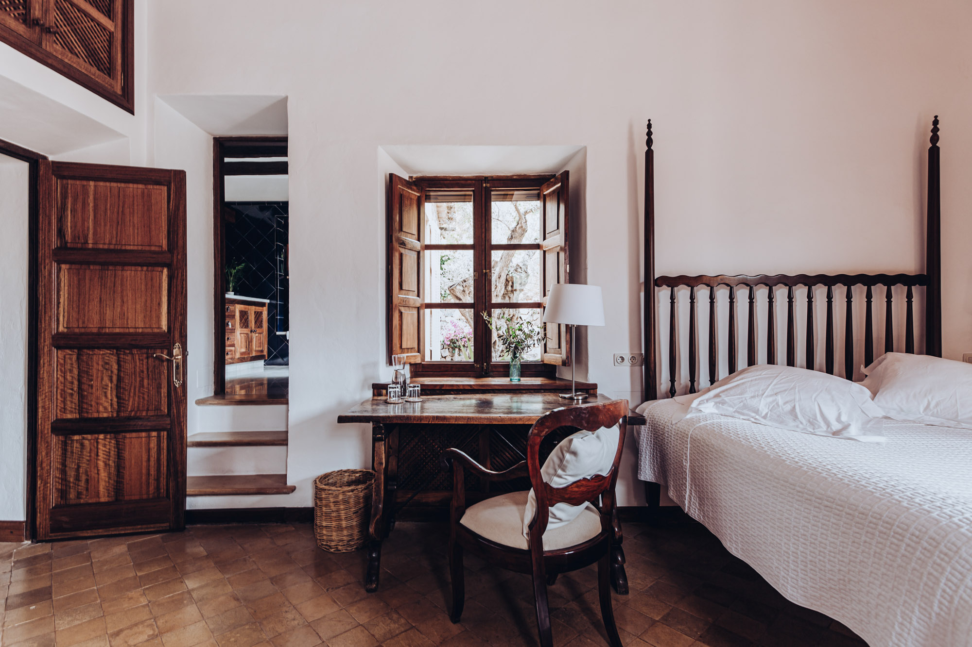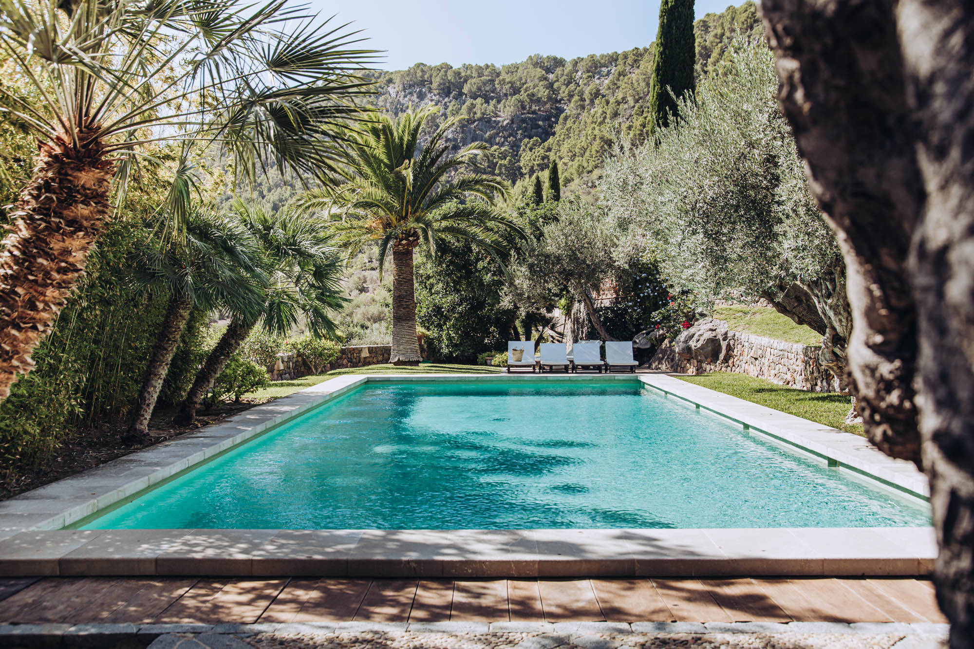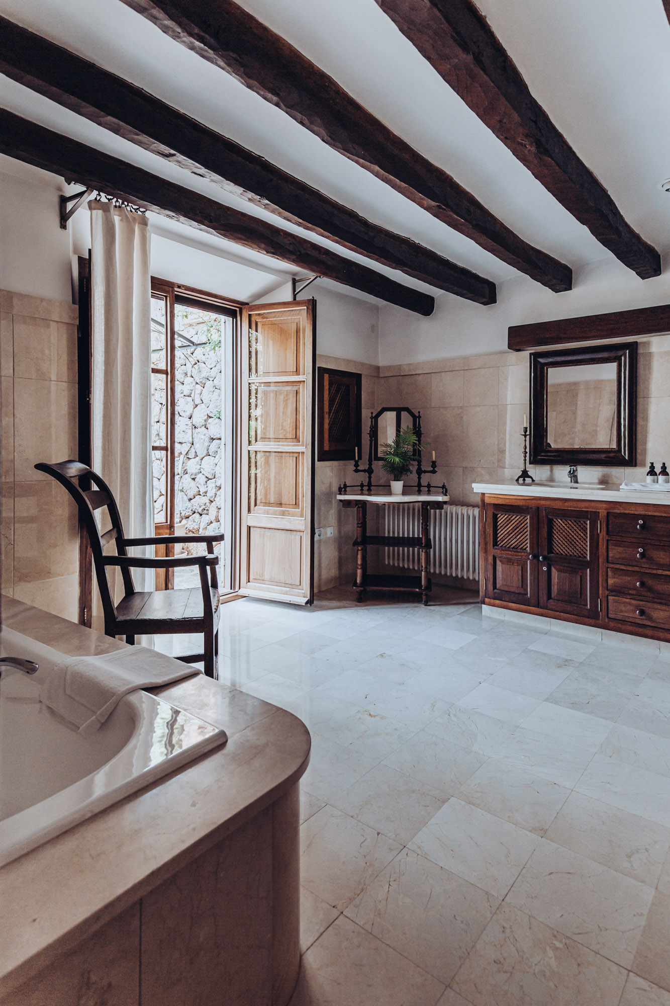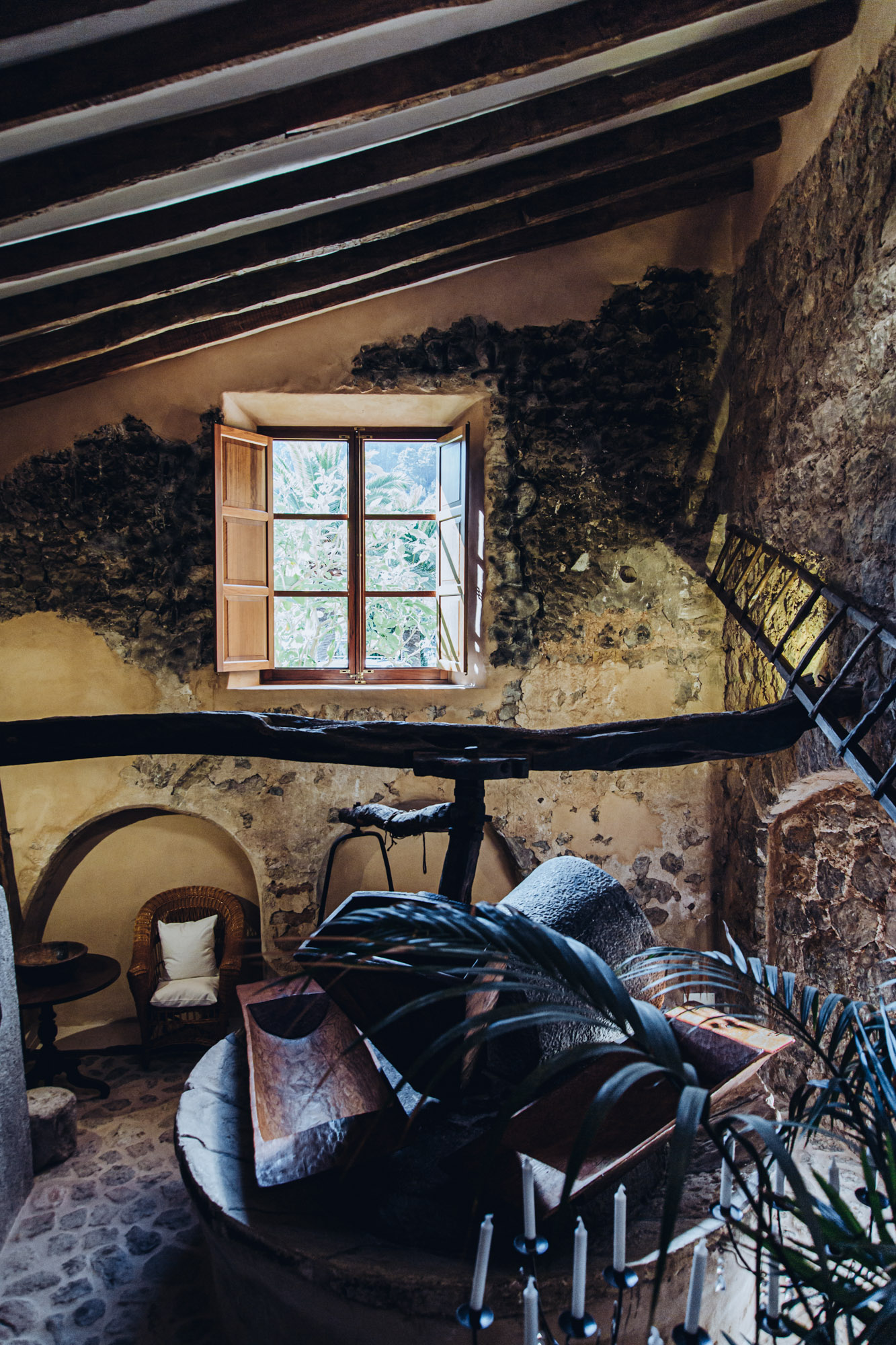 As the amber sun sets across the valley, you could watch the colours of the mountains turn pink from this privileged spot — nestled high in the hills, and far away from the crowds. Originally used to produce olive oil, Son Salas is now centred around a verdant courtyard, the heart of the home. The dining room still features large stone pieces from the original pressing system.