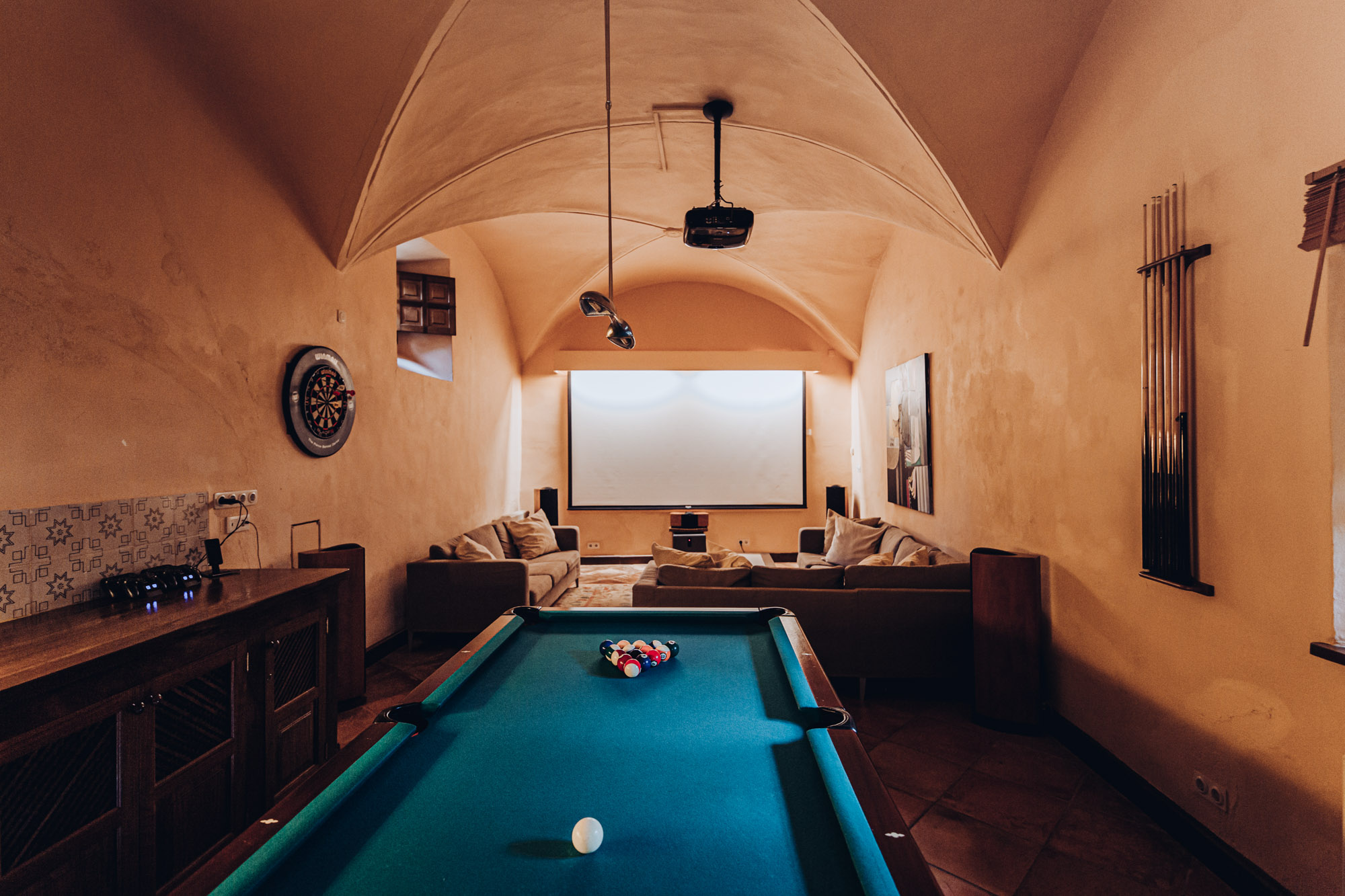 Each ensuite bedroom is equipped with local, organic toiletries. Exposed wooden beams and whitewashed walls give an iconic, rustic farmhouse feel, with white bedding and airy windows that flood each corner with sunshine. There are three kitchens—a client kitchen, an industrial kitchen for chefs/catering, an outdoor kitchen with barbecue, and two additional smaller kitchenettes in each apartment suite. A total of four living rooms provides ample space to unwind, and children will delight in the indoor games and cinema den.
