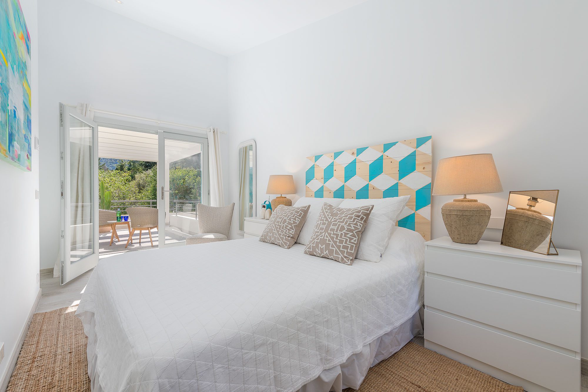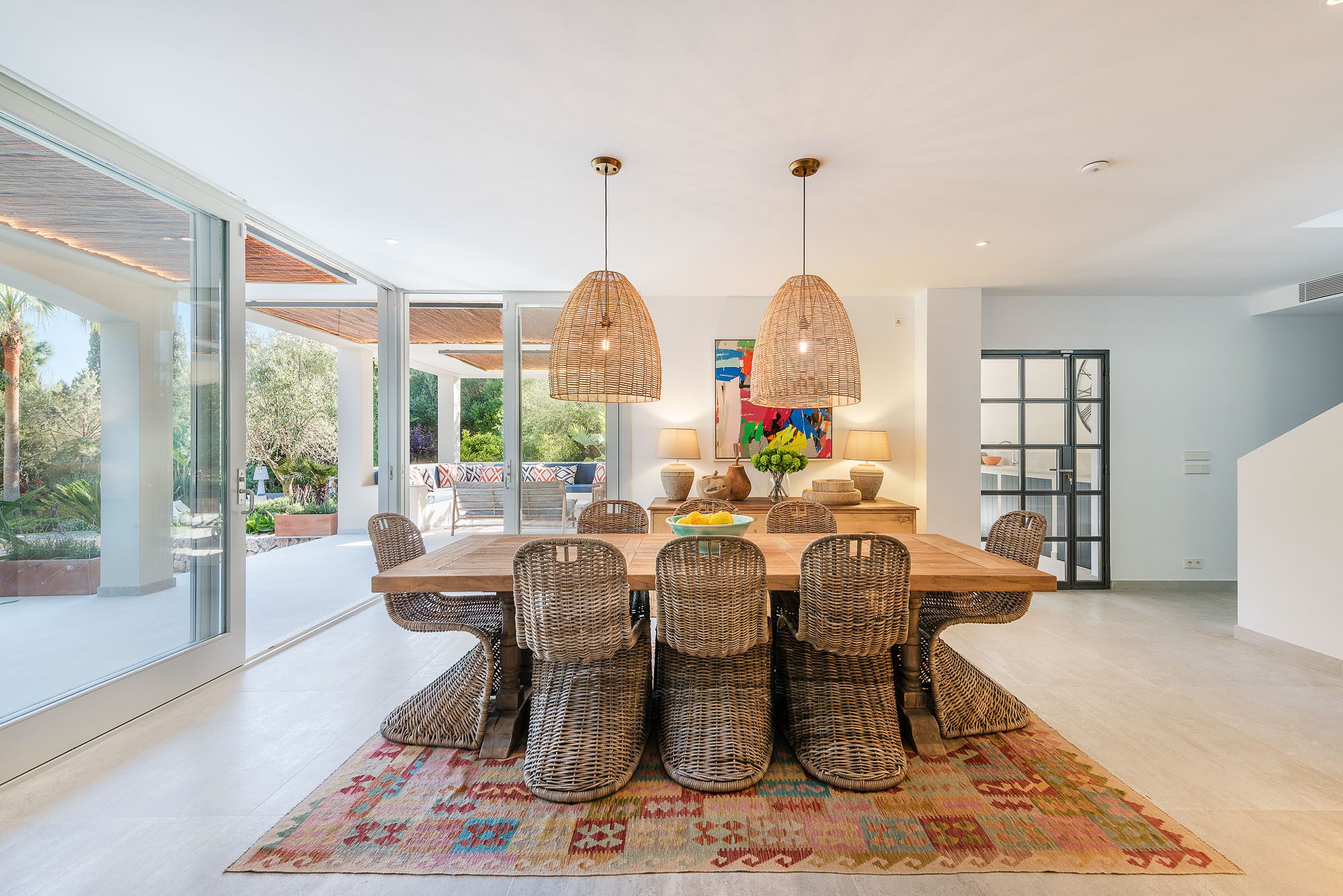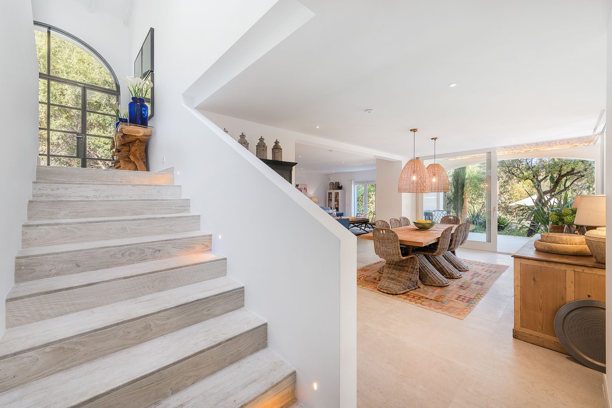 There's a lovely first-floor, light-filled, open-plan sitting room/sunroom/office space with huge windows and balconies at either end. Below, the equally spacious living/dining/kitchen area houses a large dining table, big deep sofas and large doors to the covered terrace. One of the bedrooms, with a private terrace, is on the ground floor, the other four on the first floor, and the one at the rear has a private terrace and mountain views. All bedrooms have stylish en-suite bathrooms.