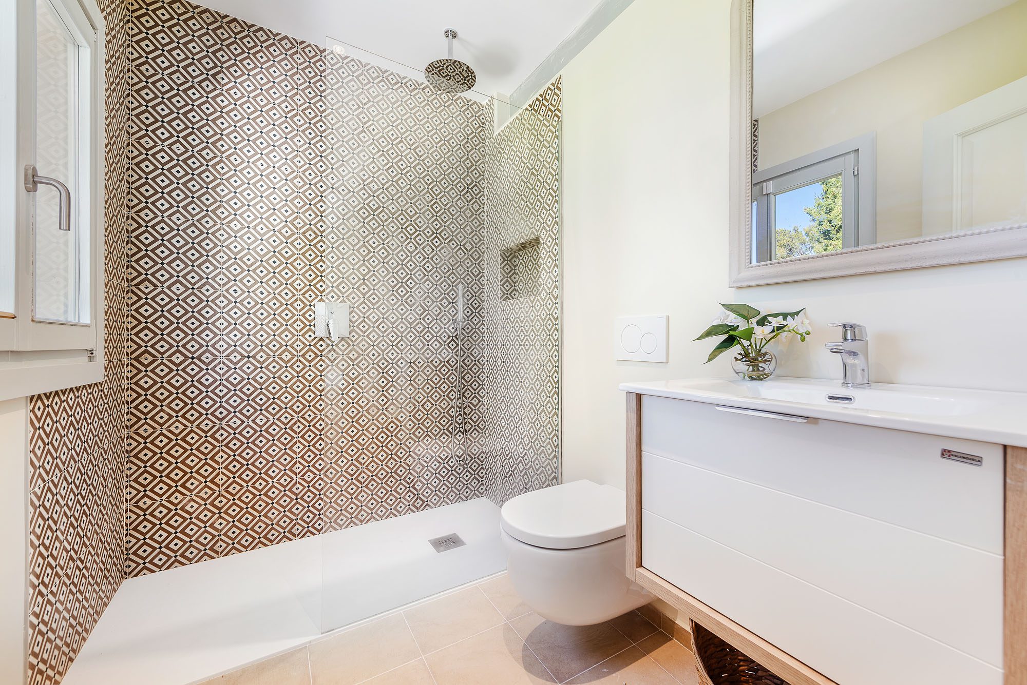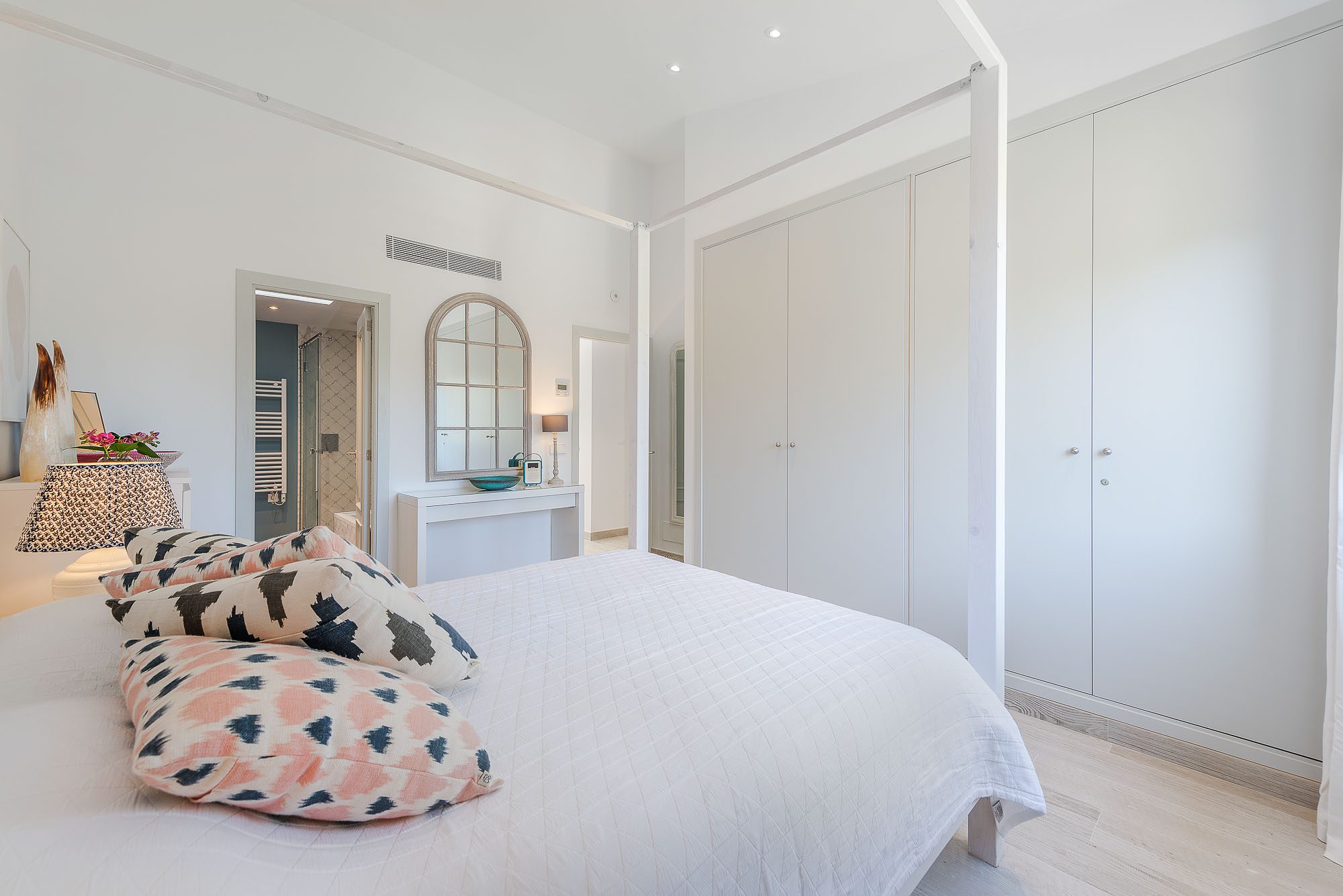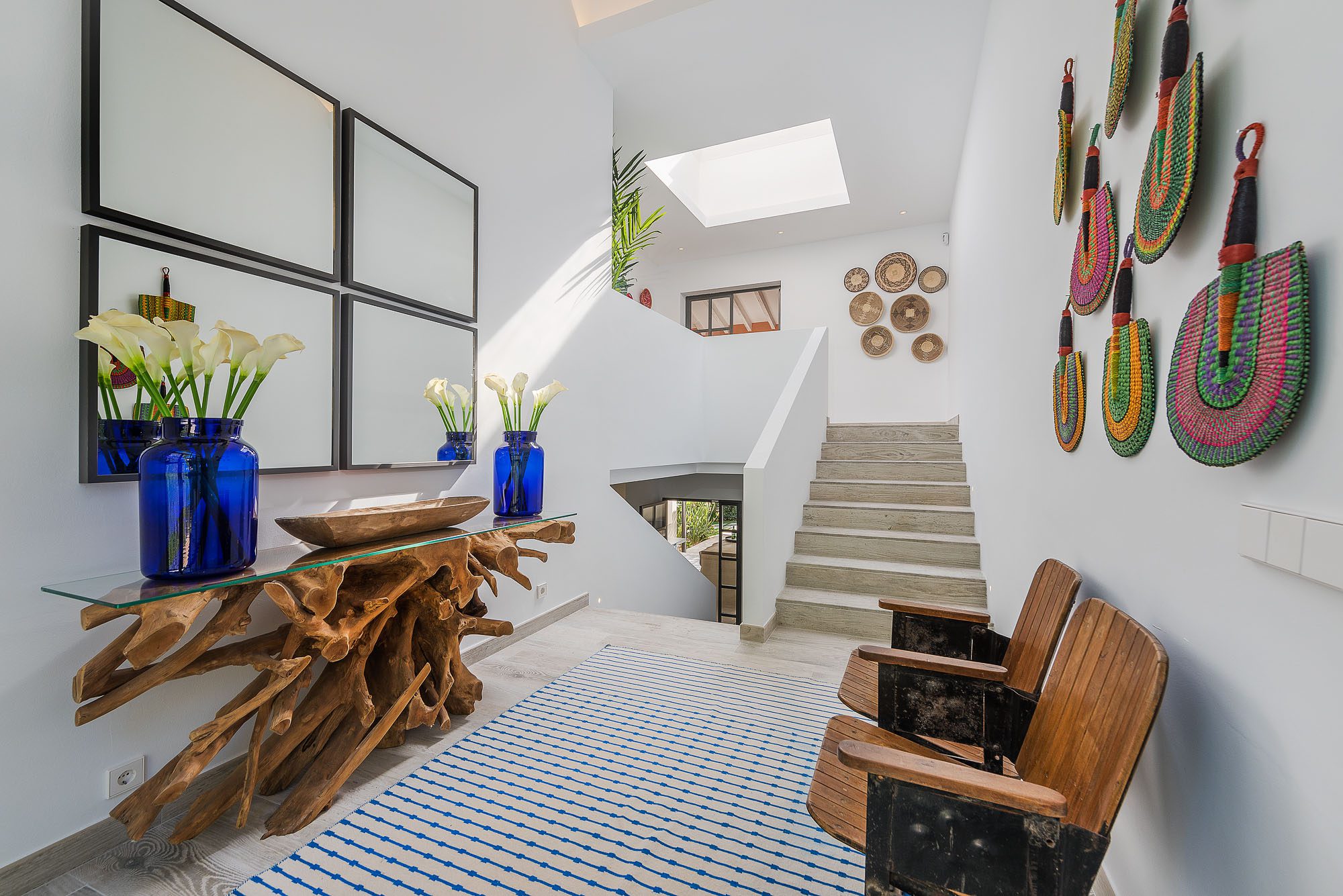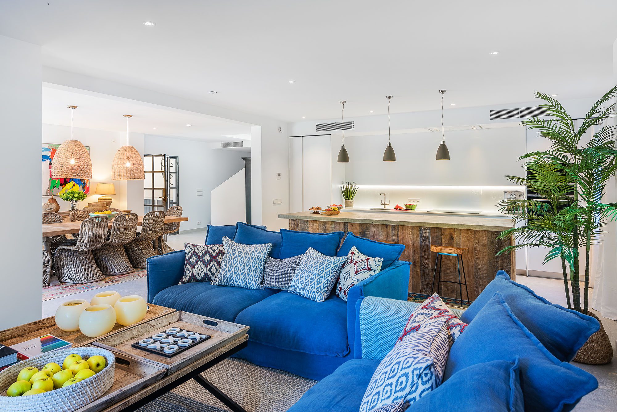 There's a lovely first-floor, light-filled, open-plan sitting room/sunroom/office space with huge windows and balconies at either end. Below, the equally spacious living/dining/kitchen area houses a large dining table, big deep sofas and large doors to the covered terrace. One of the bedrooms, with a private terrace, is on the ground floor, the other four on the first floor, and the one at the rear has a private terrace and mountain views. All bedrooms have stylish en-suite bathrooms.