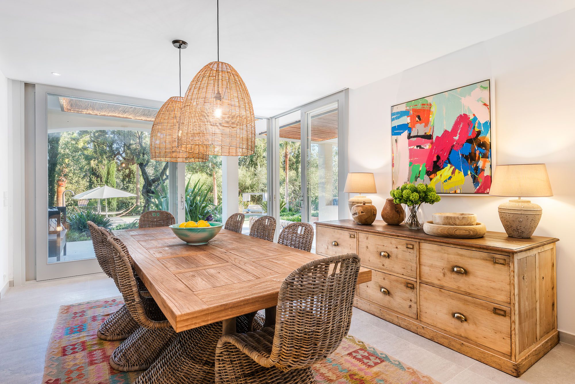 A pergola shades a dining table and benches for up to 20 people. The garden is laid out with lawns, large palm trees, and exotic plants. Sunbeds, a teak hammock, and a daybed sit on the terrace surrounding the 11-meter pool. A further outdoor lounge area is tucked away in the garden. There are lots of sporting opportunities nearby, from tennis and golf to watersports, cycling, and hiking, as well as a basketball hoop in the garden.