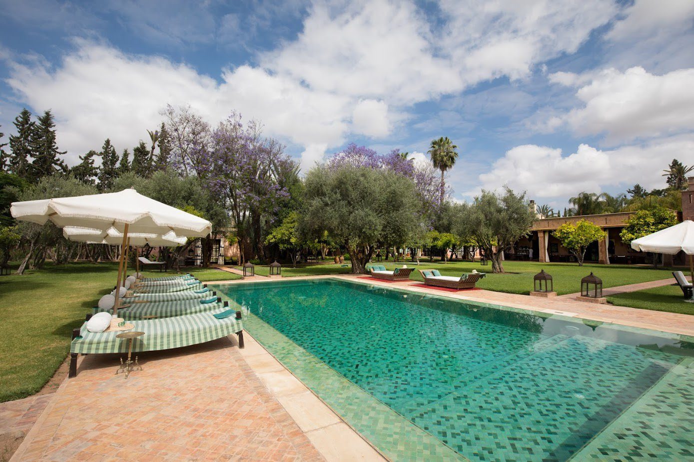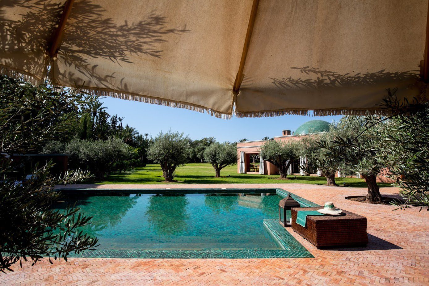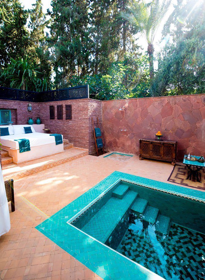 It's situated in the exclusive Palmeraie region of Marrakech. Five exceptionally stylish villas, each surrounded by large gardens planted with ancient olive trees, date palms, orange, and pomegranate trees, accommodate 30 guests. Each villa has a private pool, relaxing daybeds, and an attentive team of staff, including excellent cooks. A spa, with a hammam, steam room, and unlimited treatments are included in your stay.