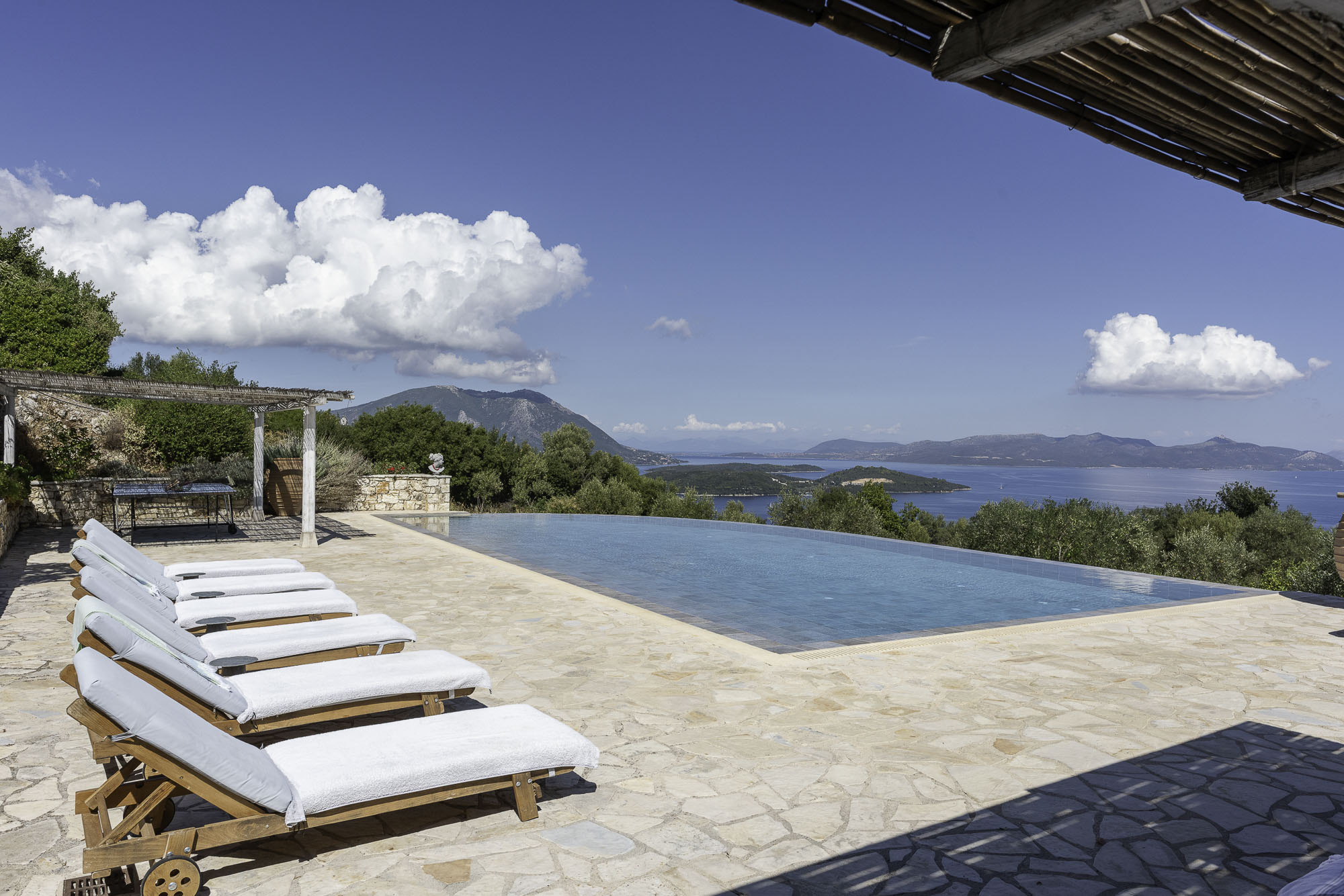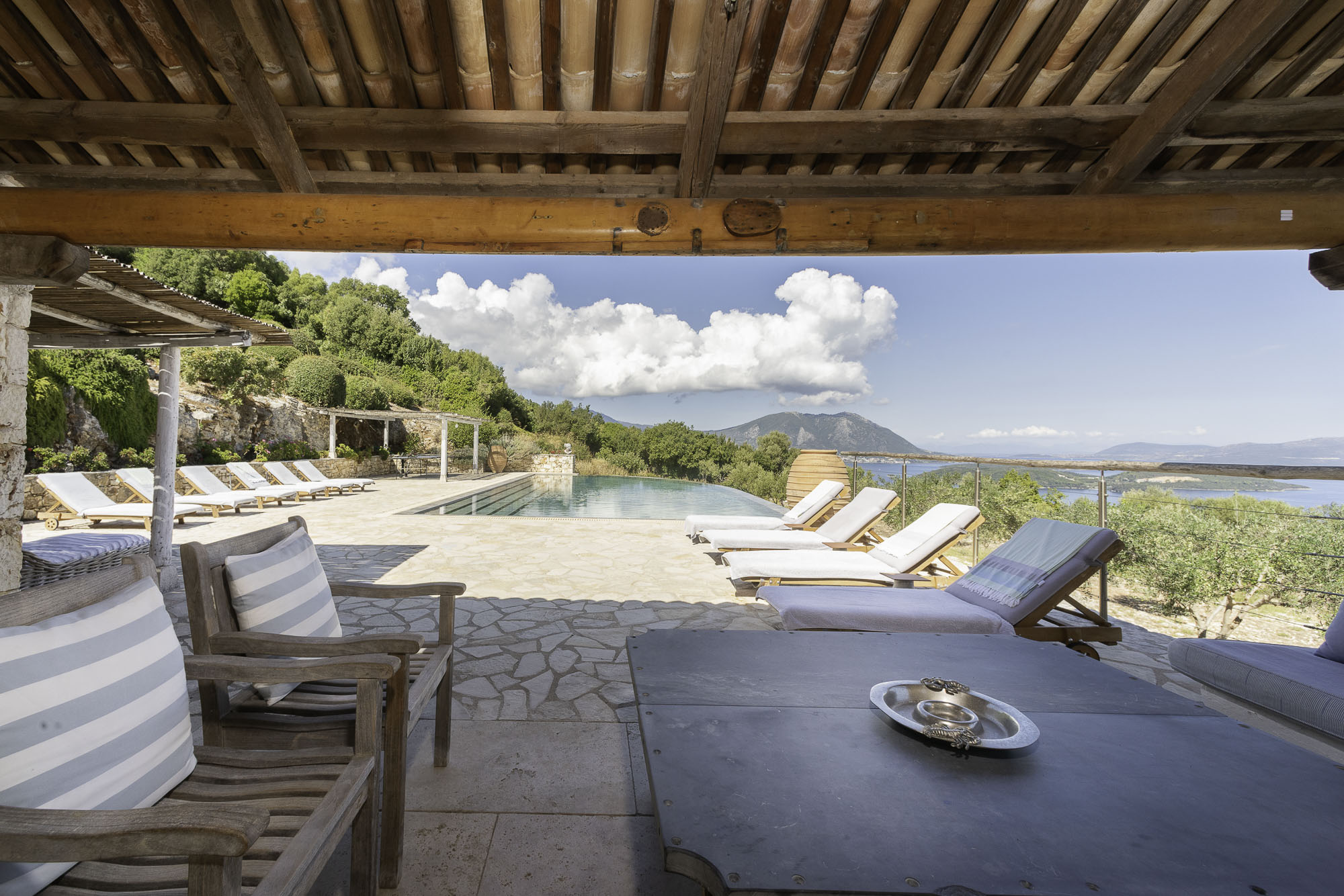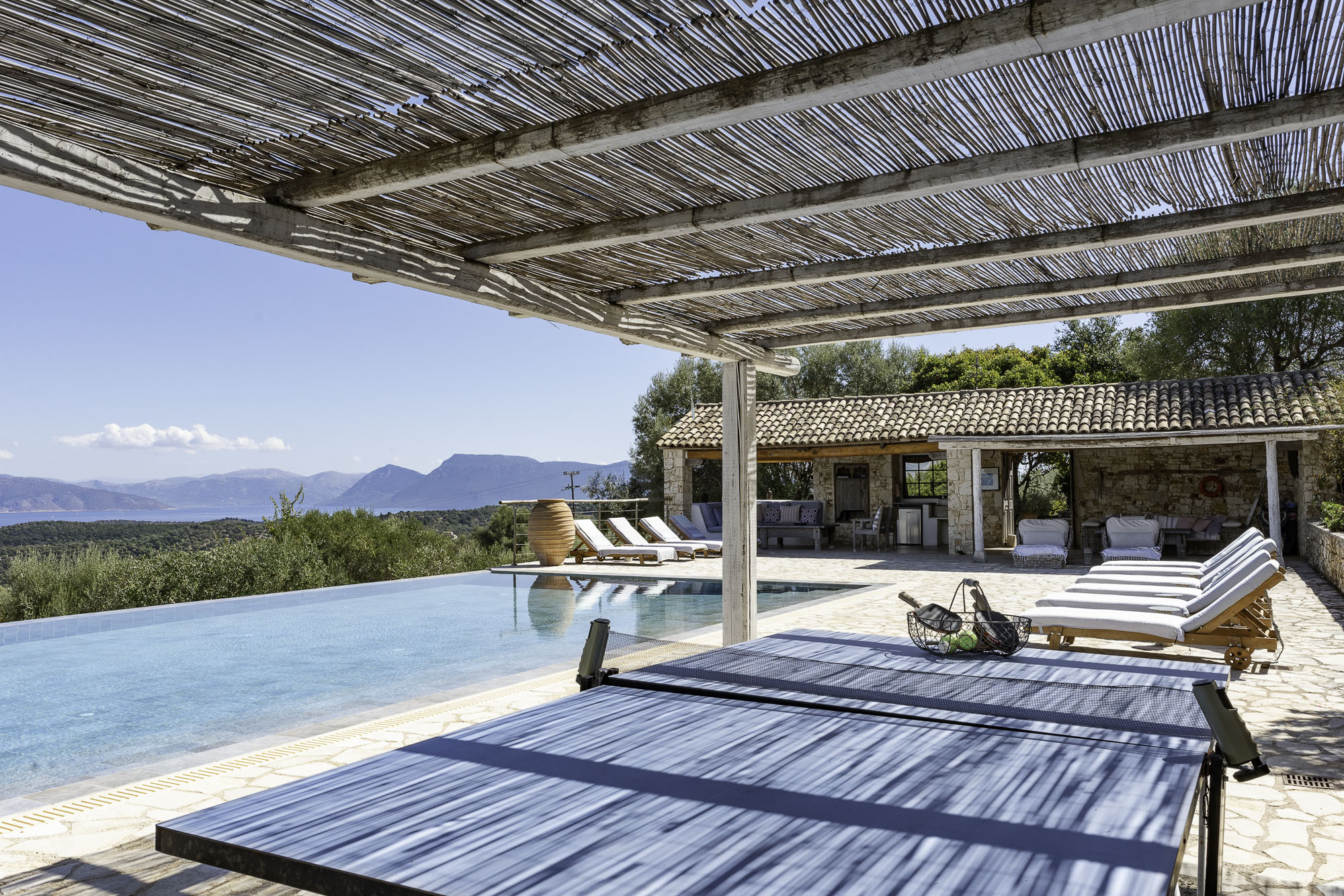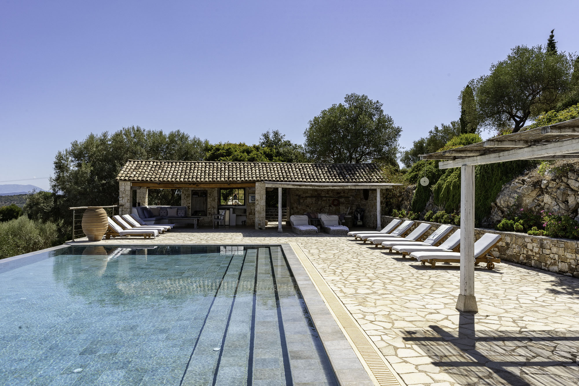Set into the terrace below the house is a large swimming pool with steps for sitting. The entrance to the pool area can be locked, so it is great for keeping small children safe. Plenty of comfy sun loungers surround the pool to one side. A shaded portico houses another comfortable seating area and outdoor kitchen. Wherever you decide to sit at this property, the views are exceptional.