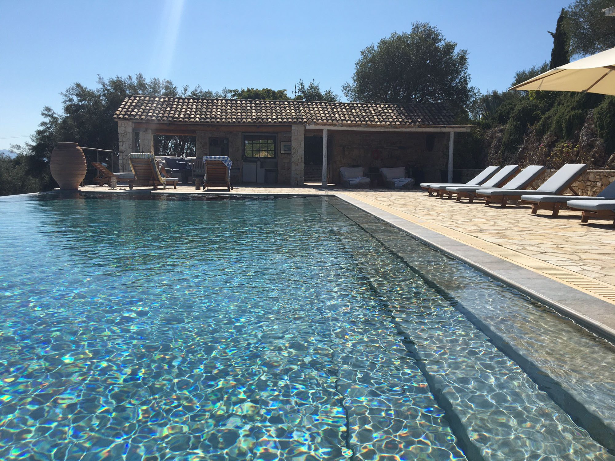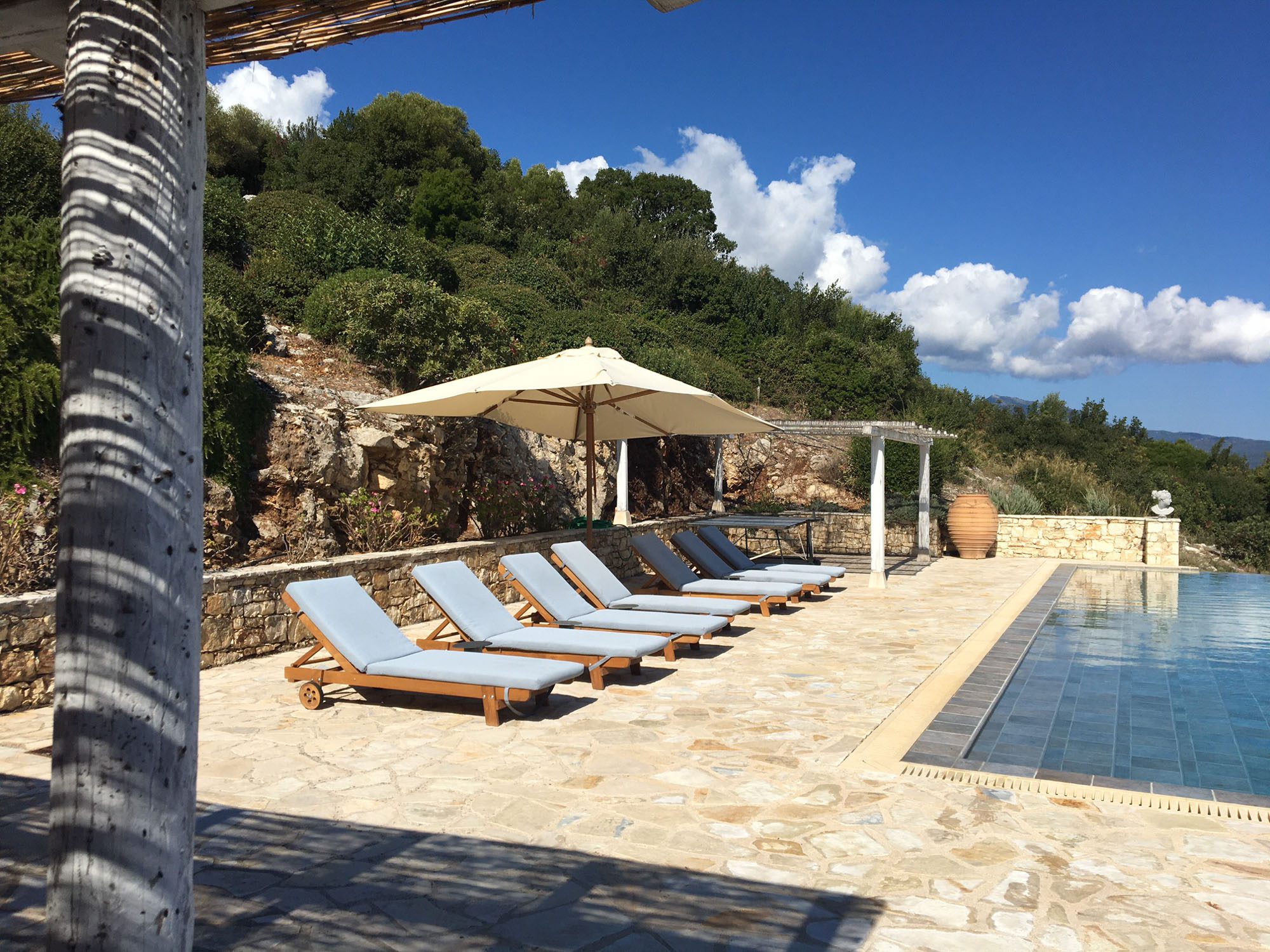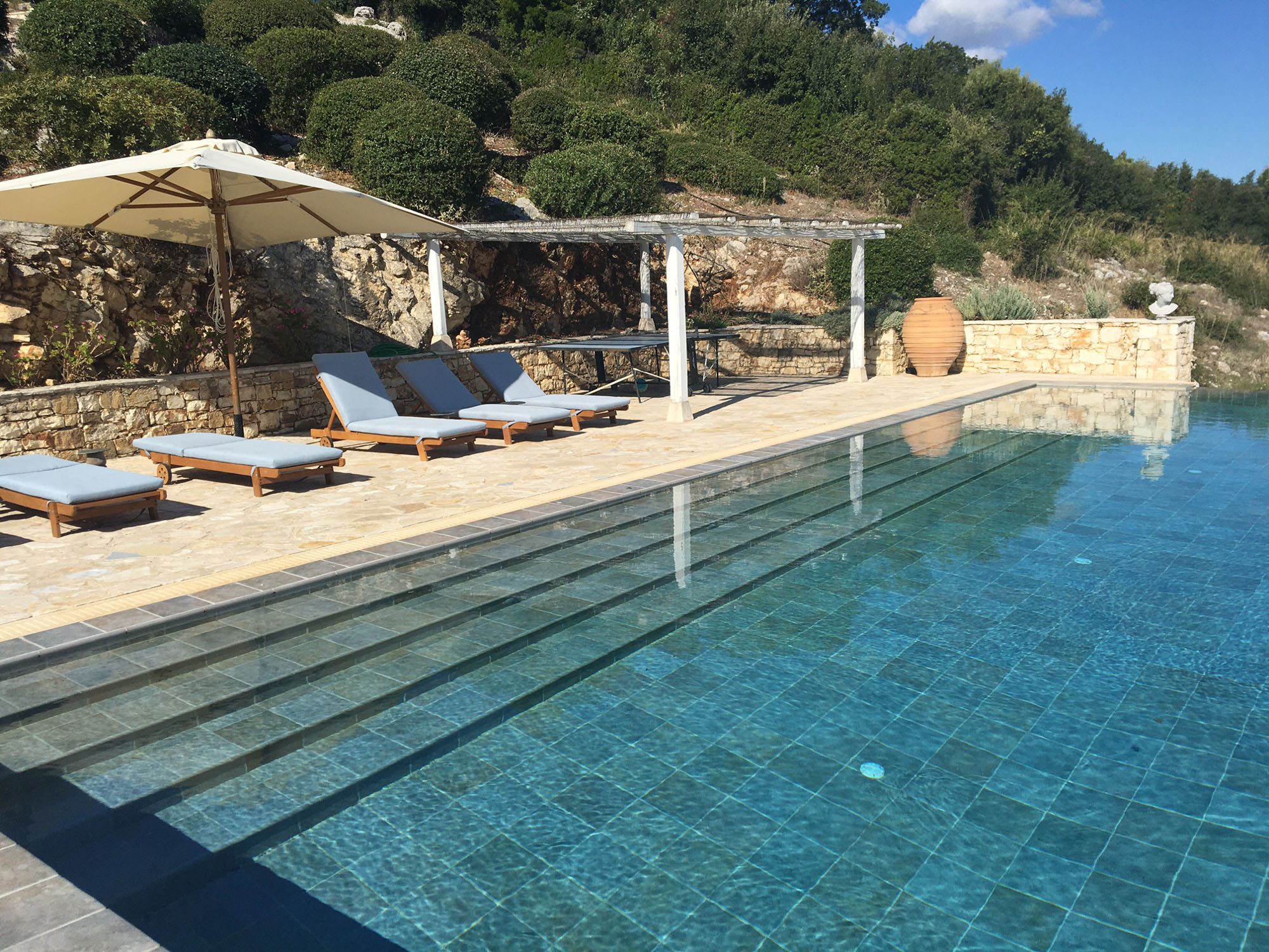 Set into the terrace below the house is a large swimming pool with steps for sitting. The entrance to the pool area can be locked, so it is great for keeping small children safe. Plenty of comfy sun loungers surround the pool to one side. A shaded portico houses another comfortable seating area and outdoor kitchen. Wherever you decide to sit at this property, the views are exceptional.