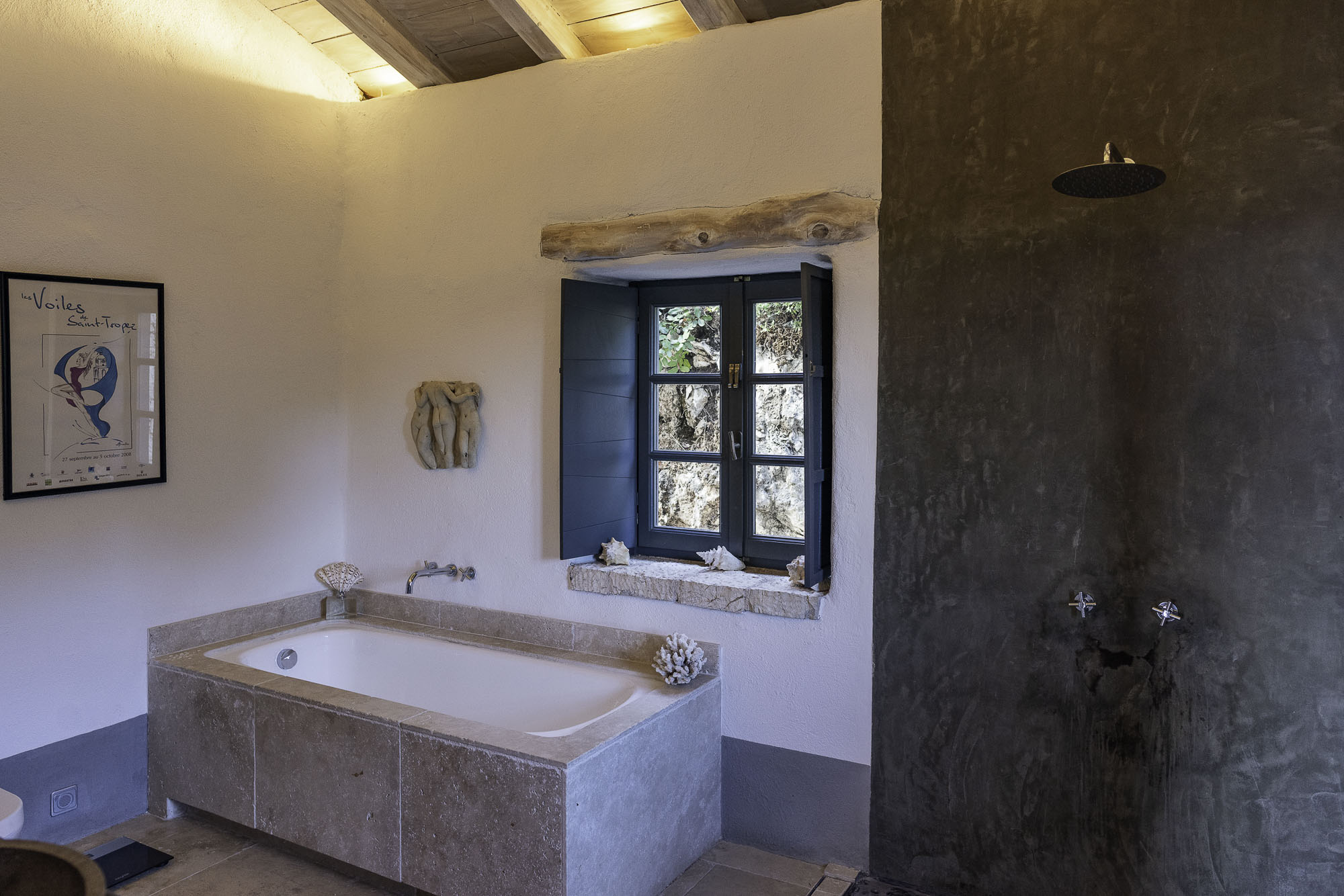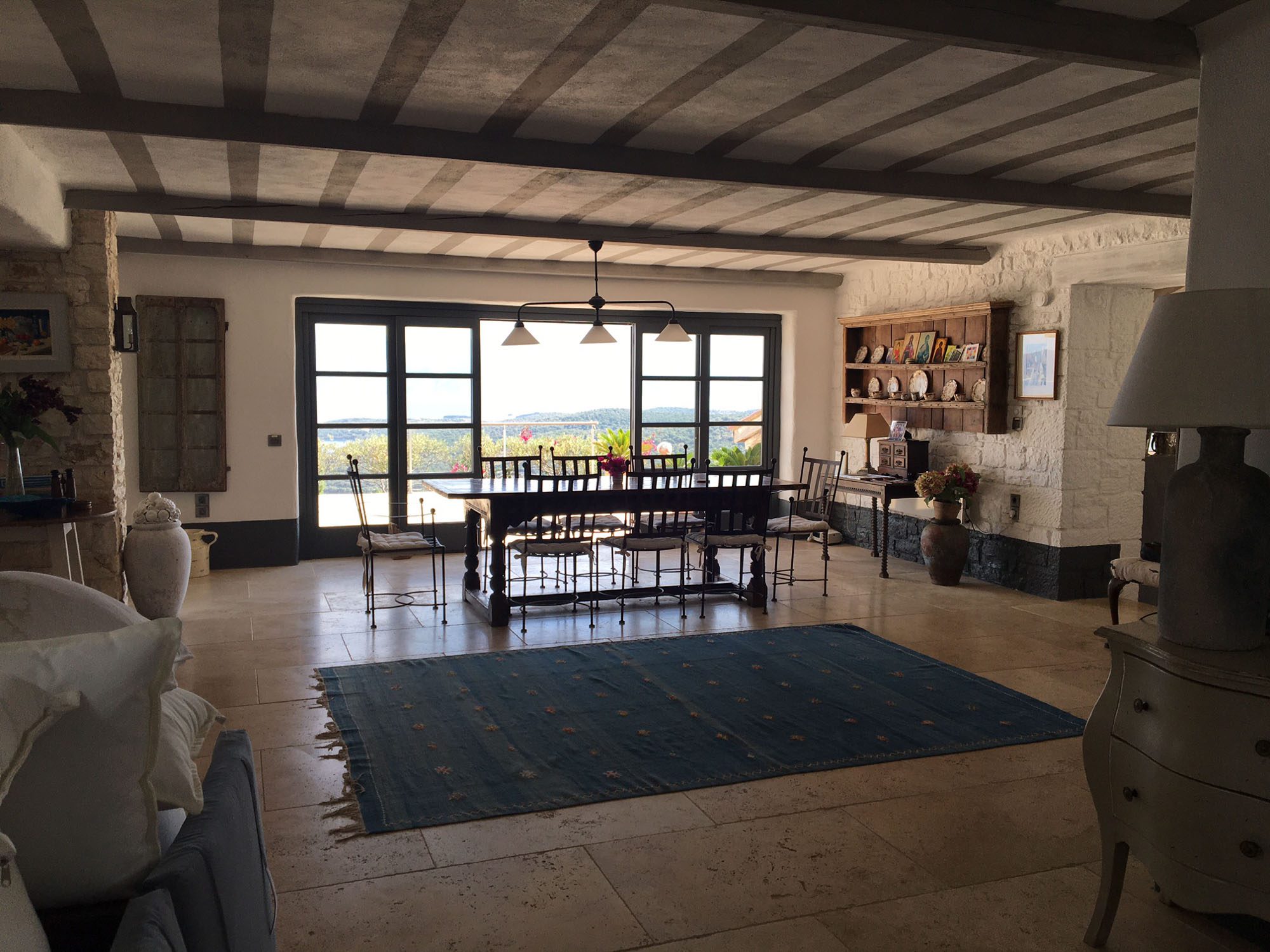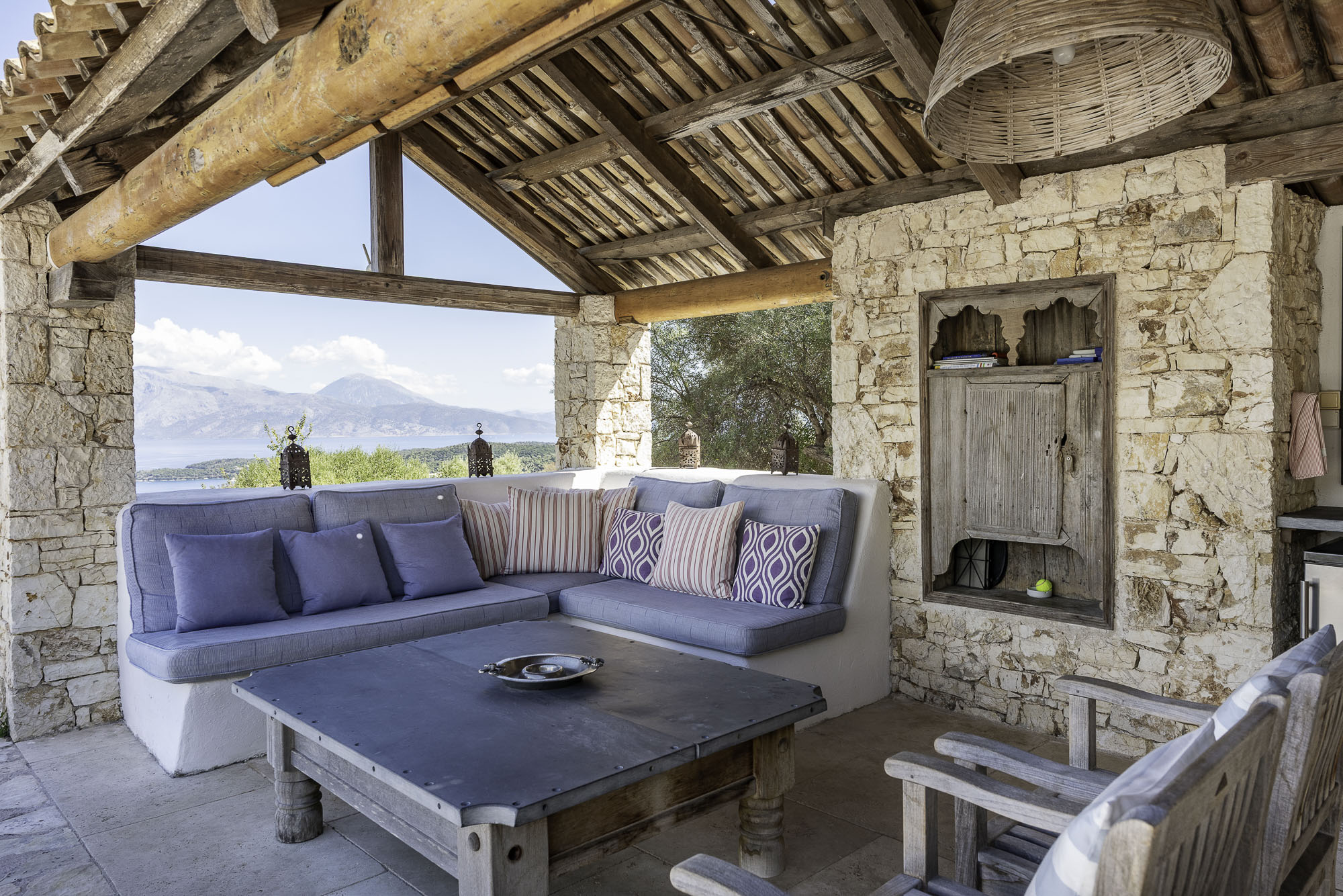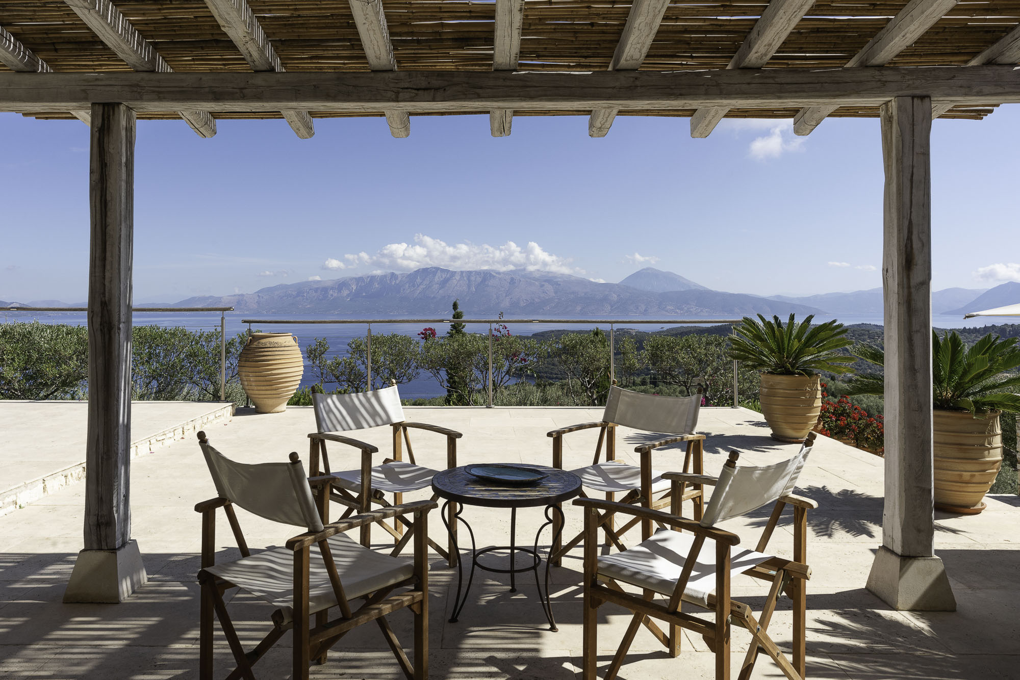 Set into the terrace below the house is a large swimming pool with steps for sitting. The entrance to the pool area can be locked, so it is great for keeping small children safe. Plenty of comfy sun loungers surround the pool to one side. A shaded portico houses another comfortable seating area and outdoor kitchen. Wherever you decide to sit at this property, the views are exceptional.