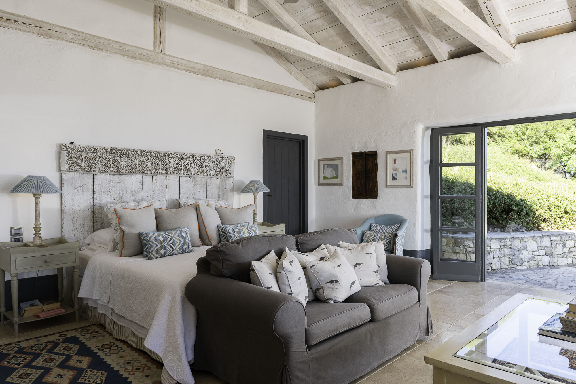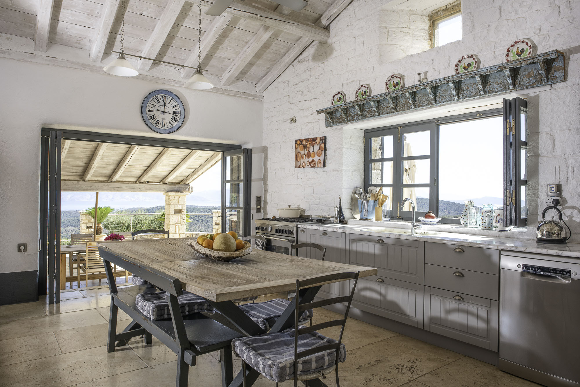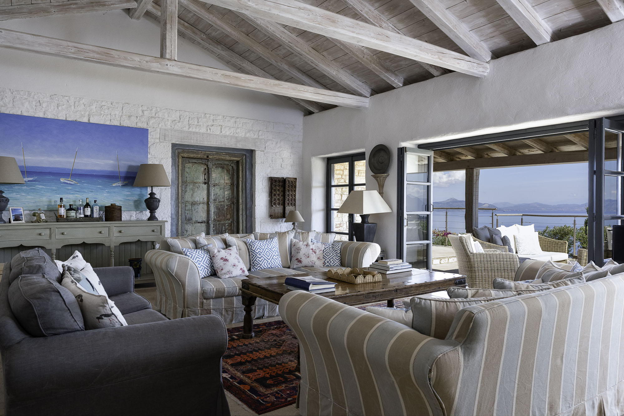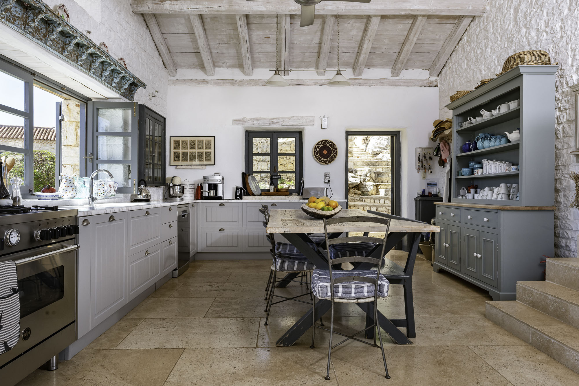 Featuring whitewashed walls, hewn stone windowsills, pebble mosaic bathroom floors, handcrafted wooden headboards, and a unique mix of furnishings. The living space in the main house is generous, with wide glass doors open from the living/dining area to the terrace. The spacious and comfortable bedrooms are all en suite, with two in the main house (split across two floors) and a further two in the guest house. Two pull-out beds can be added to any room for an additional two guests.
