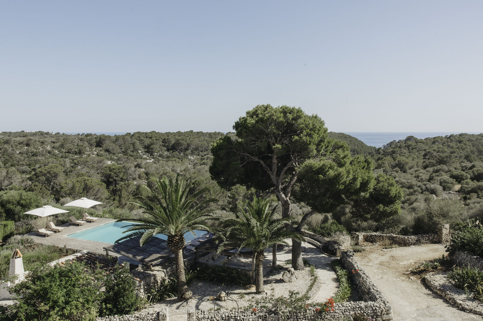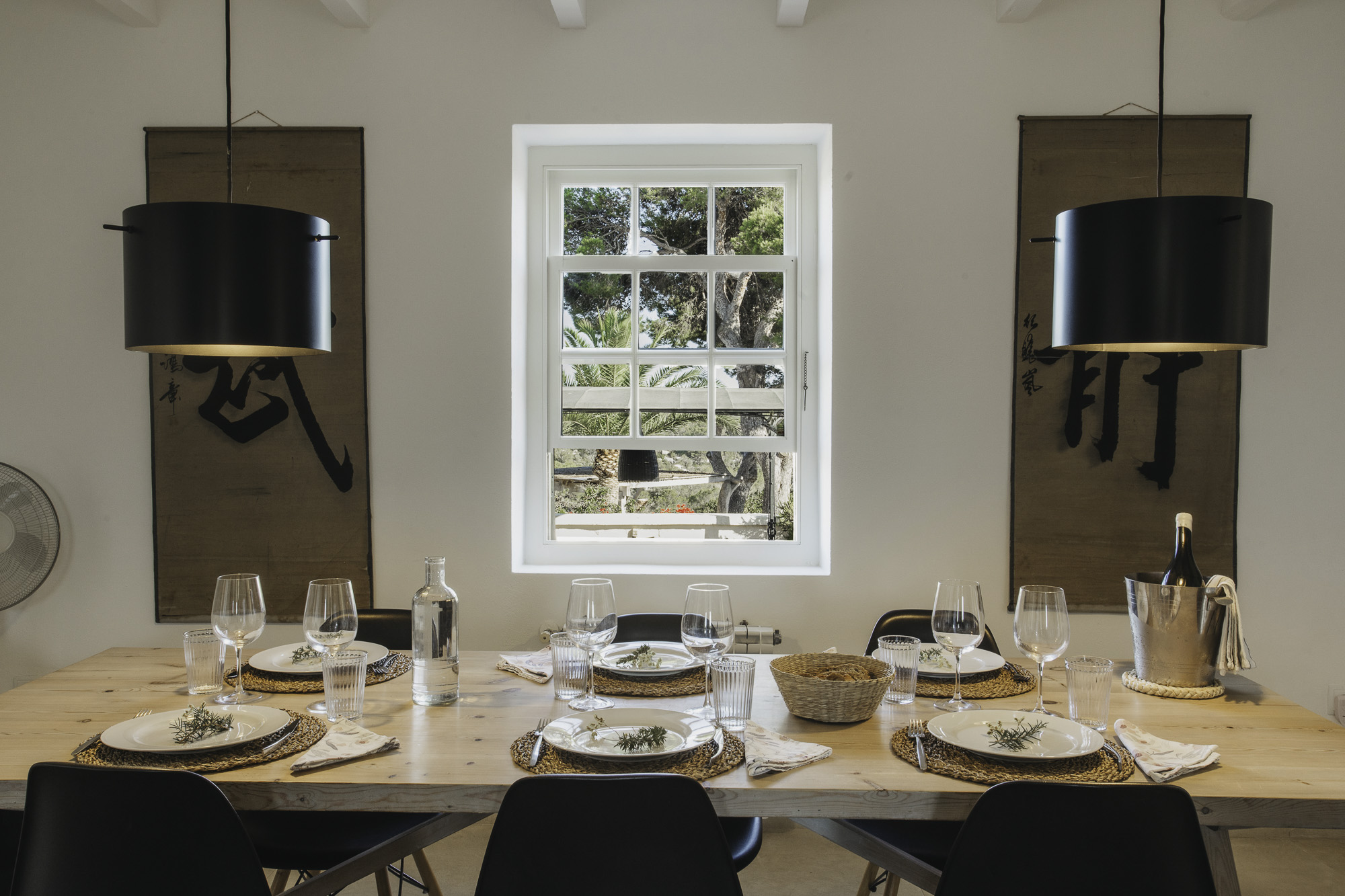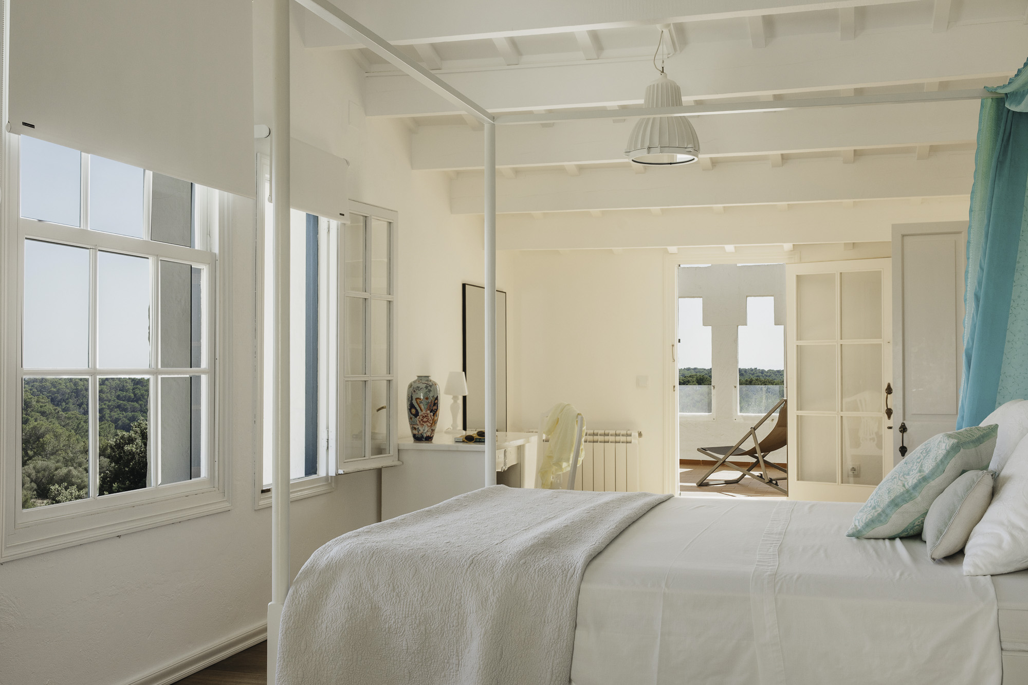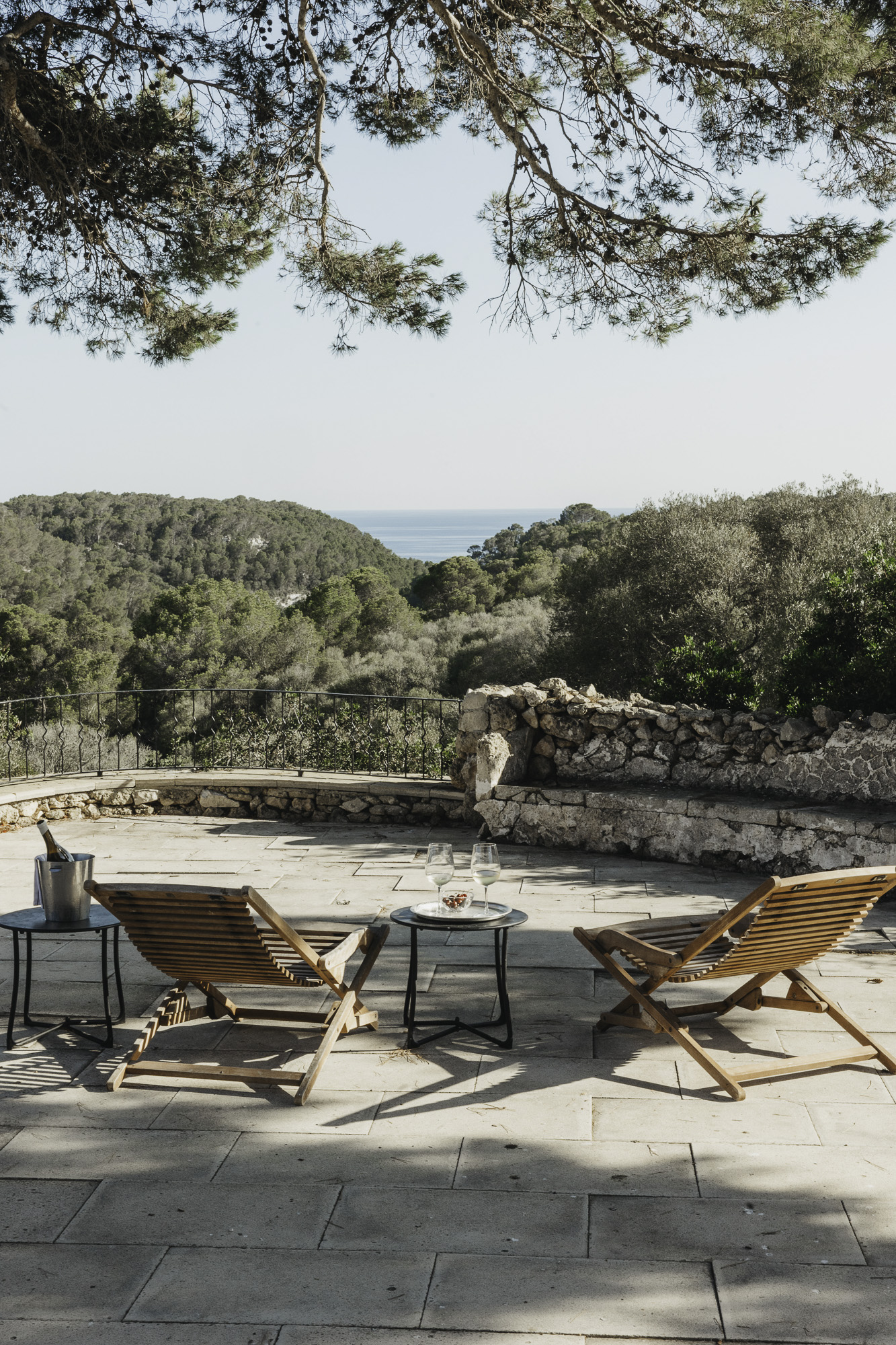 The main house features seven beautifully appointed bedrooms across two floors, while an additional two bedrooms are located in the charming guesthouse. Living spaces include a cosy library, a refined TV room, and an expansive lounge area that offers both intimacy and spaciousness, ensuring tranquillity even at full capacity. The kitchen opens to a large indoor dining table with seating for 14, providing stunning views of the Binigaus Valley. A standout feature is the King Suite, which includes a private sun terrace and awe-inspiring vistas of the Mediterranean and the estate's canyon.