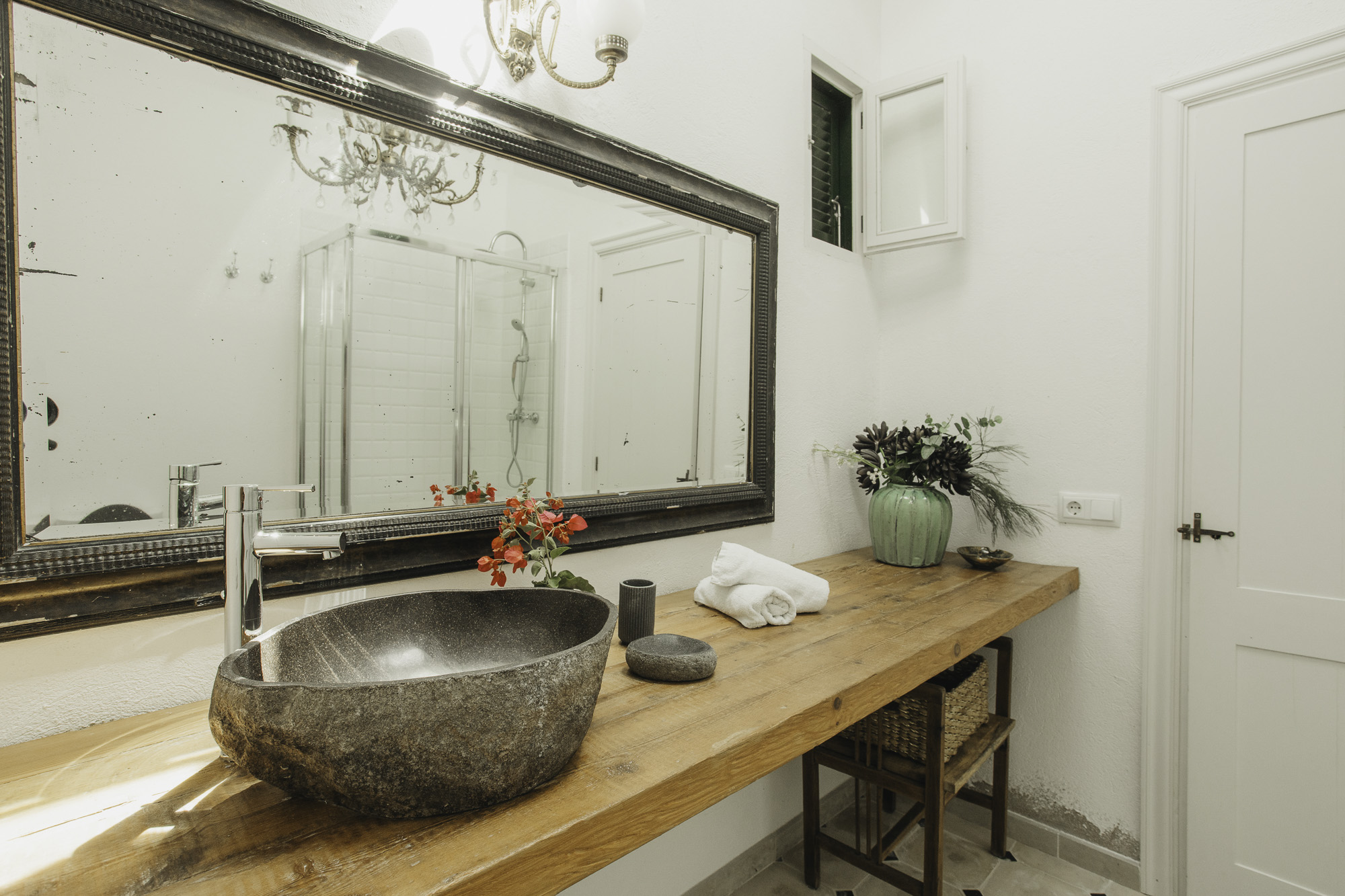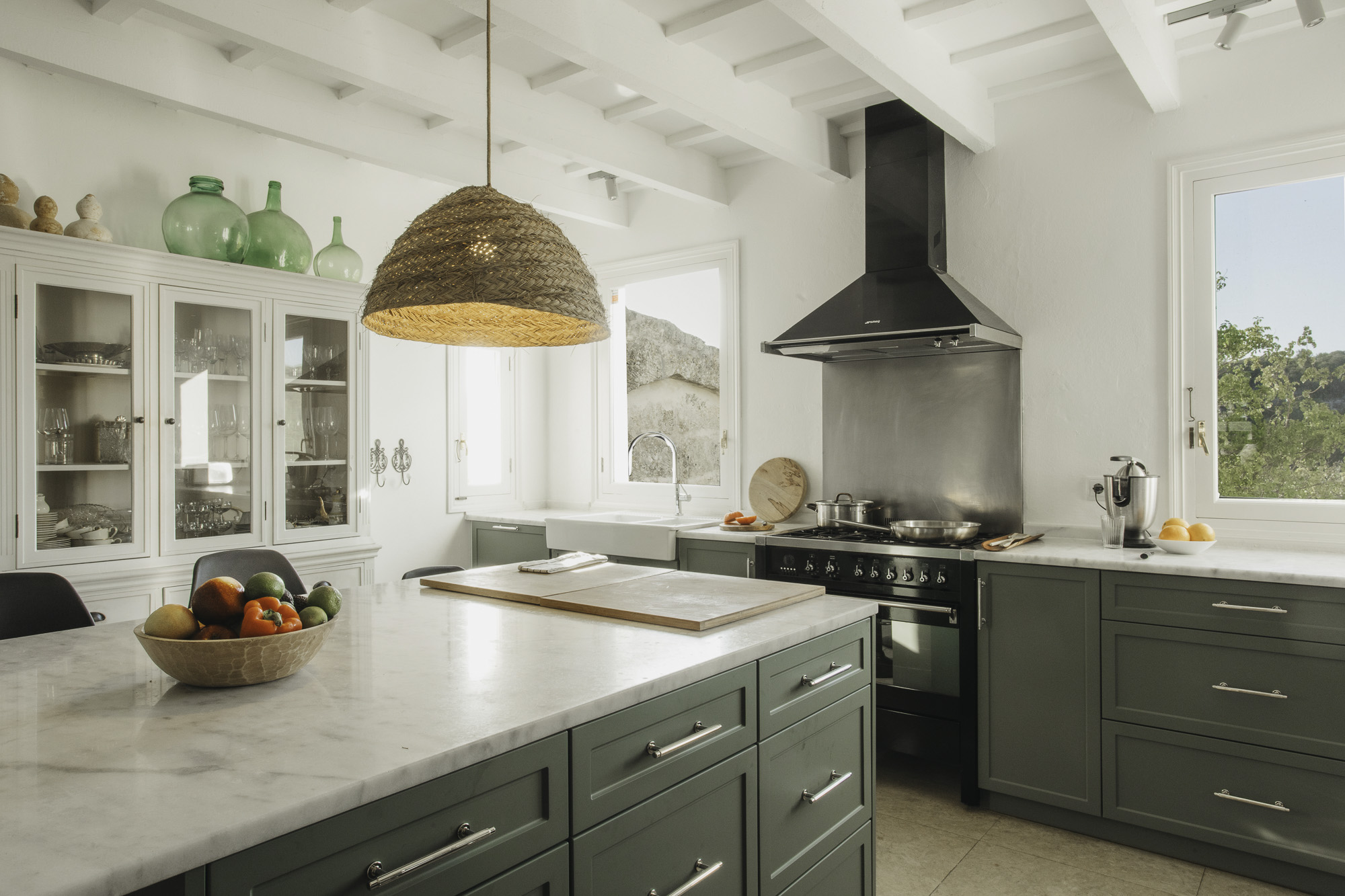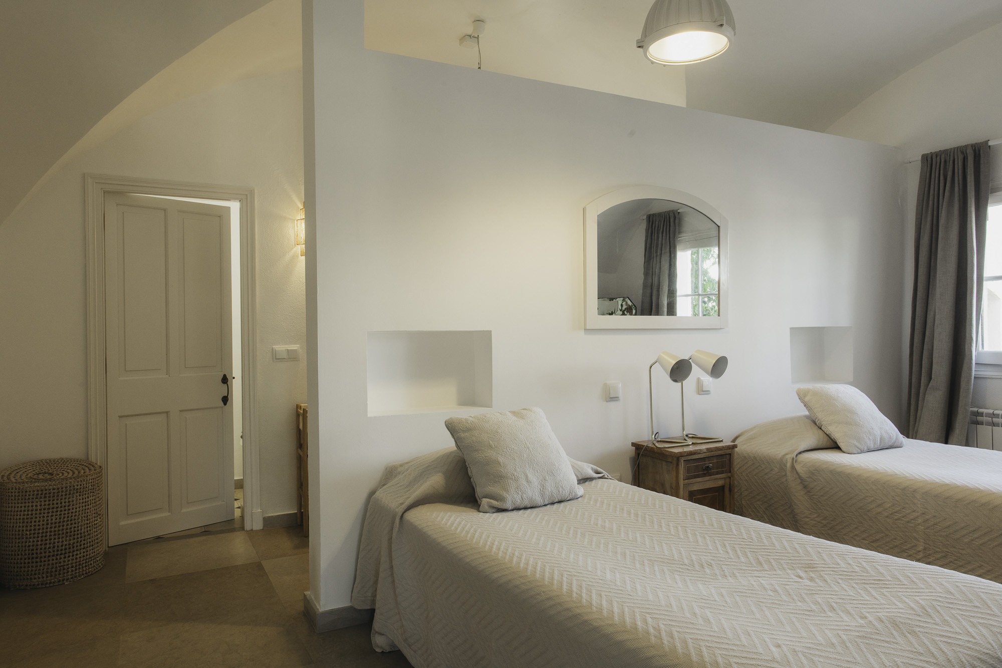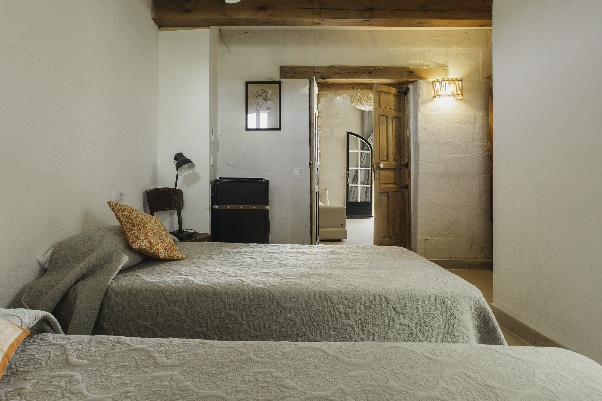 The main house features seven beautifully appointed bedrooms across two floors, while an additional two bedrooms are located in the charming guesthouse. Living spaces include a cosy library, a refined TV room, and an expansive lounge area that offers both intimacy and spaciousness, ensuring tranquillity even at full capacity. The kitchen opens to a large indoor dining table with seating for 14, providing stunning views of the Binigaus Valley. A standout feature is the King Suite, which includes a private sun terrace and awe-inspiring vistas of the Mediterranean and the estate's canyon.