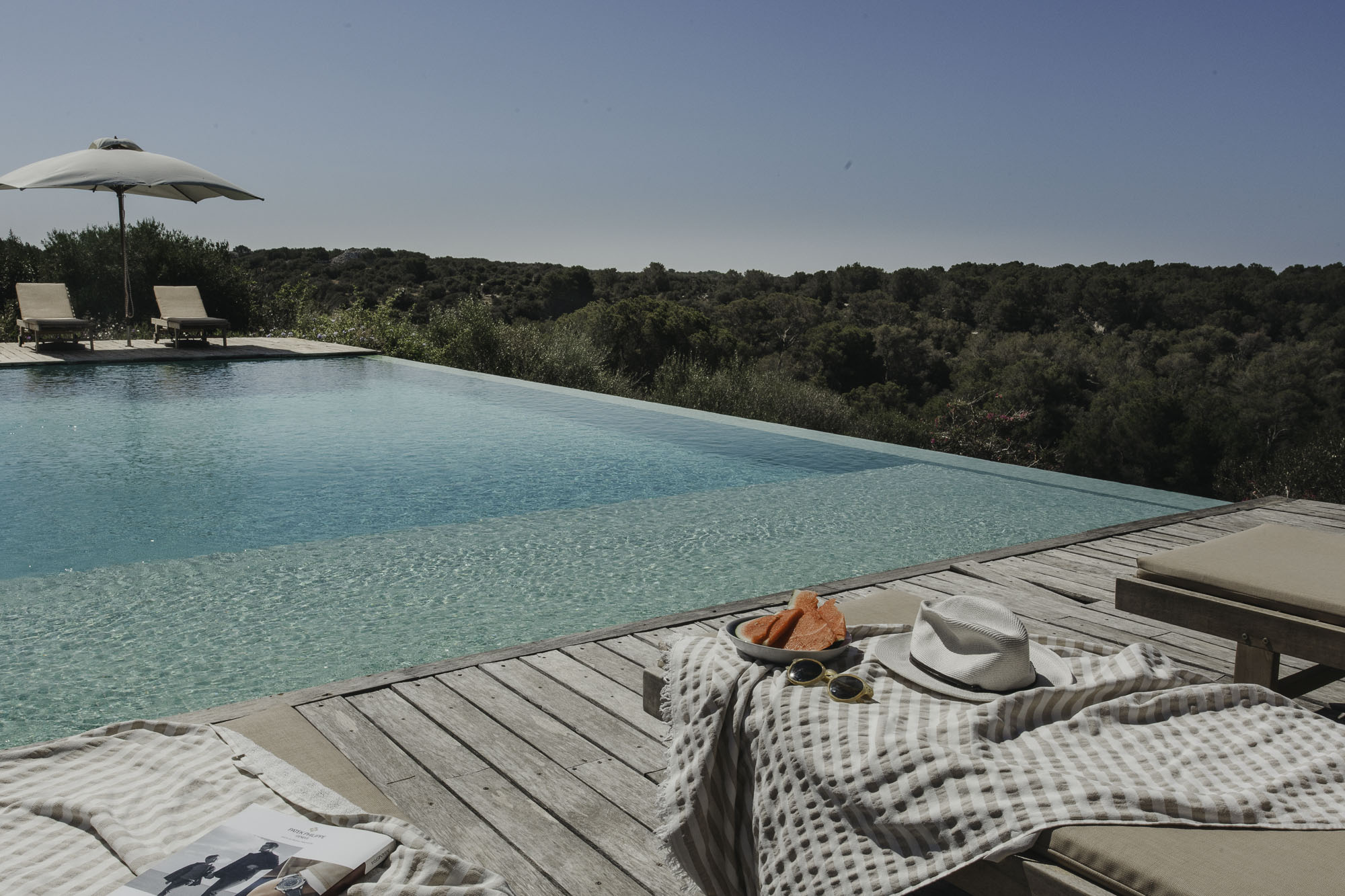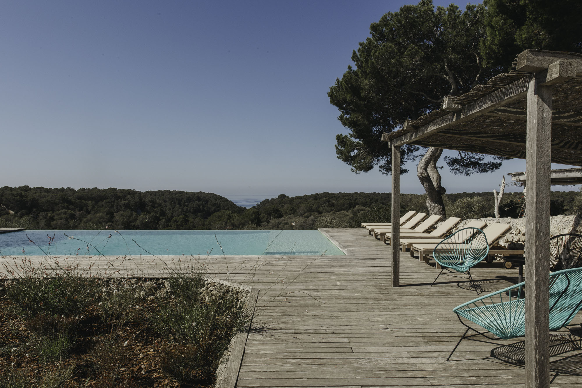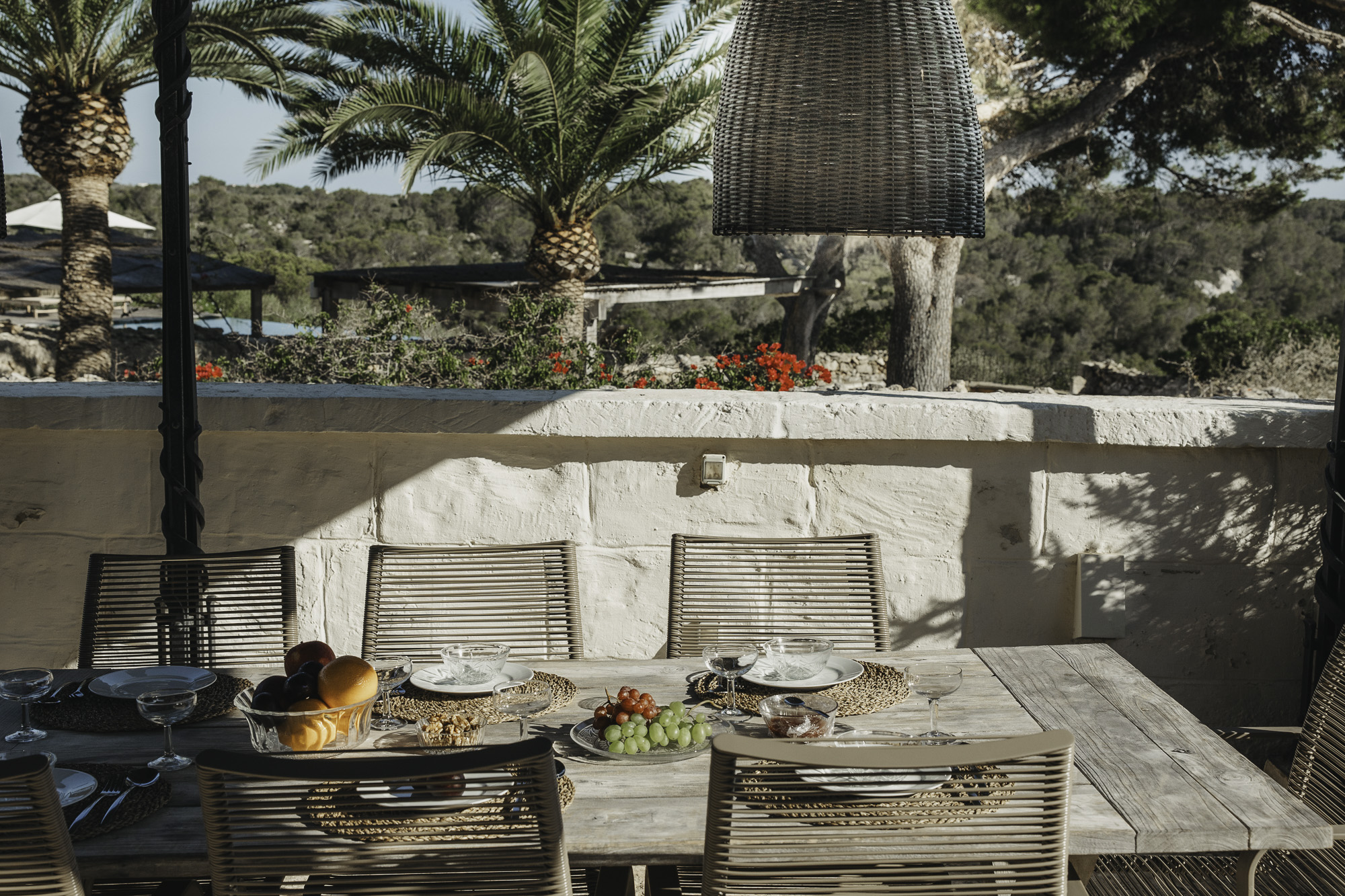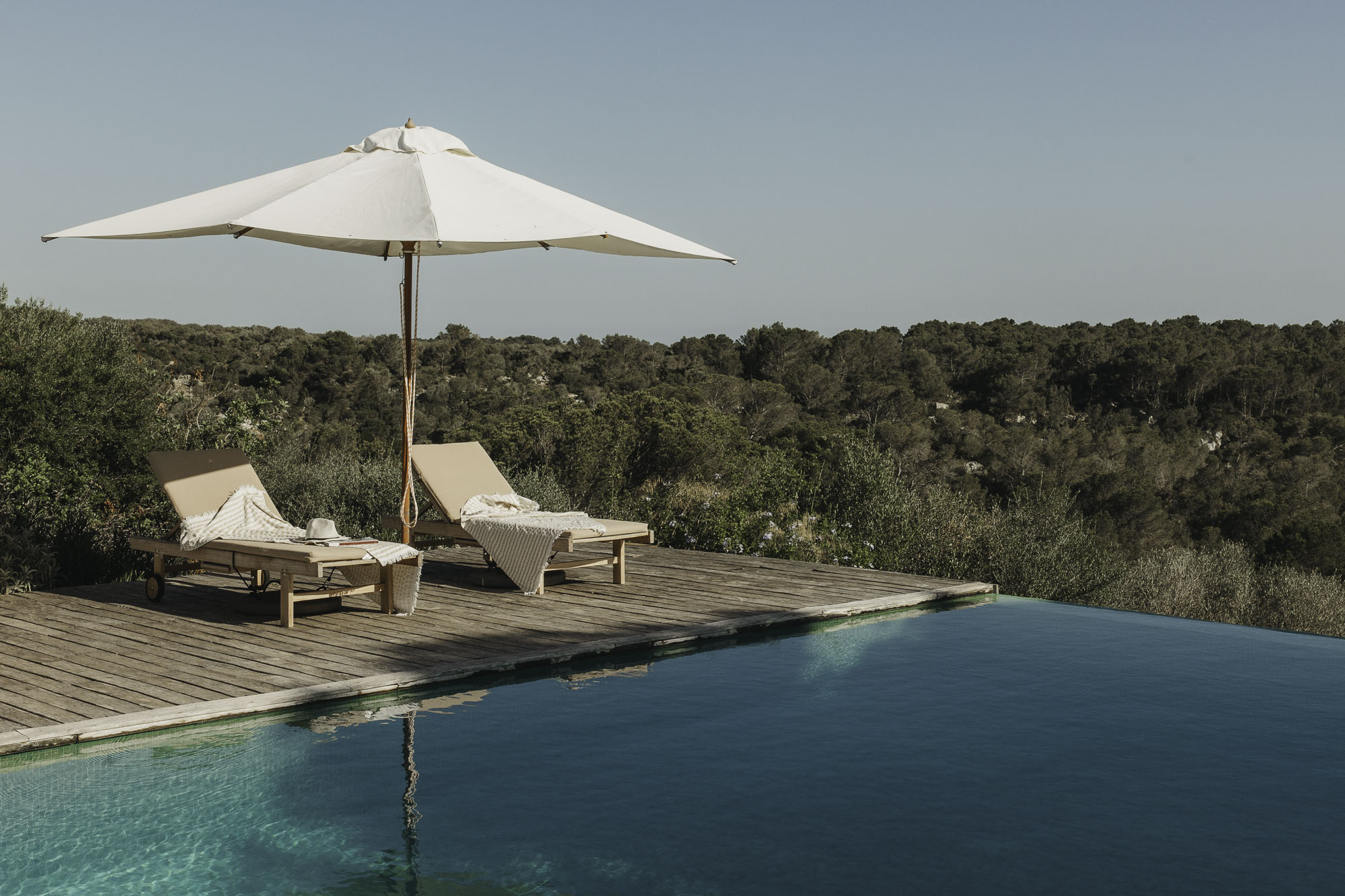 A 20-person dining table, shaded by parasols, overlooks the picturesque Binigaus Valley, while a nearby stone oven and pool house with a built-in barbecue make alfresco dining a delight. The infinity pool, framed by a teak deck, offers unobstructed views of the valley and sea, creating the perfect backdrop for sun-soaked days or cocktail evenings under the stars. Ancient pine trees provide cooling shade, and the surrounding landscape promises peace and timeless beauty at every turn.