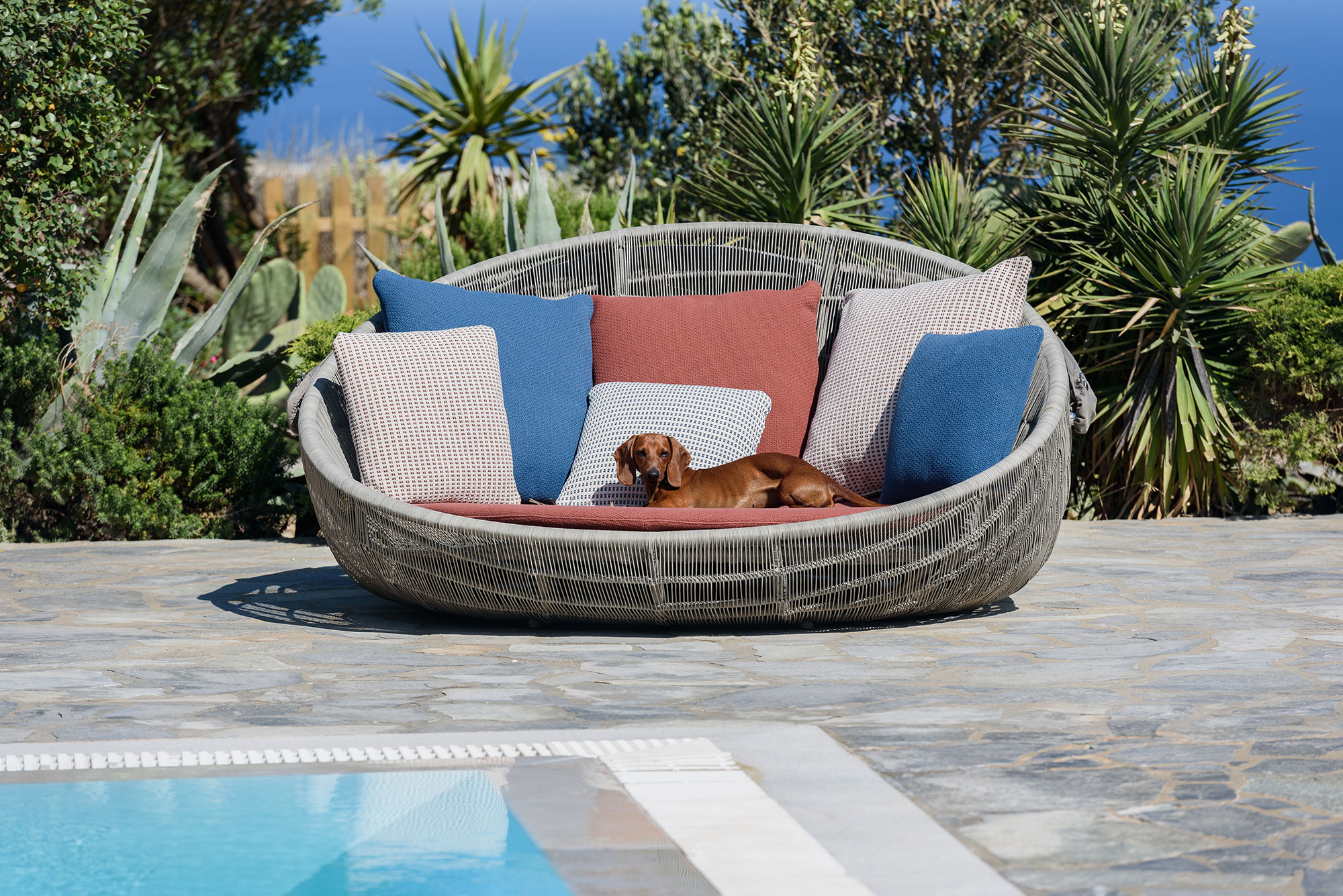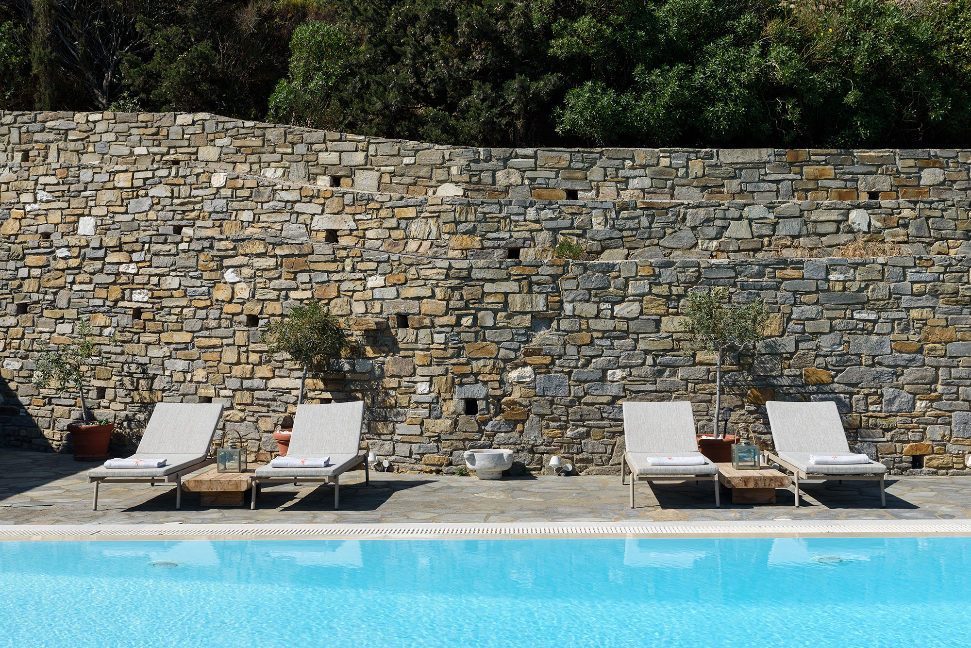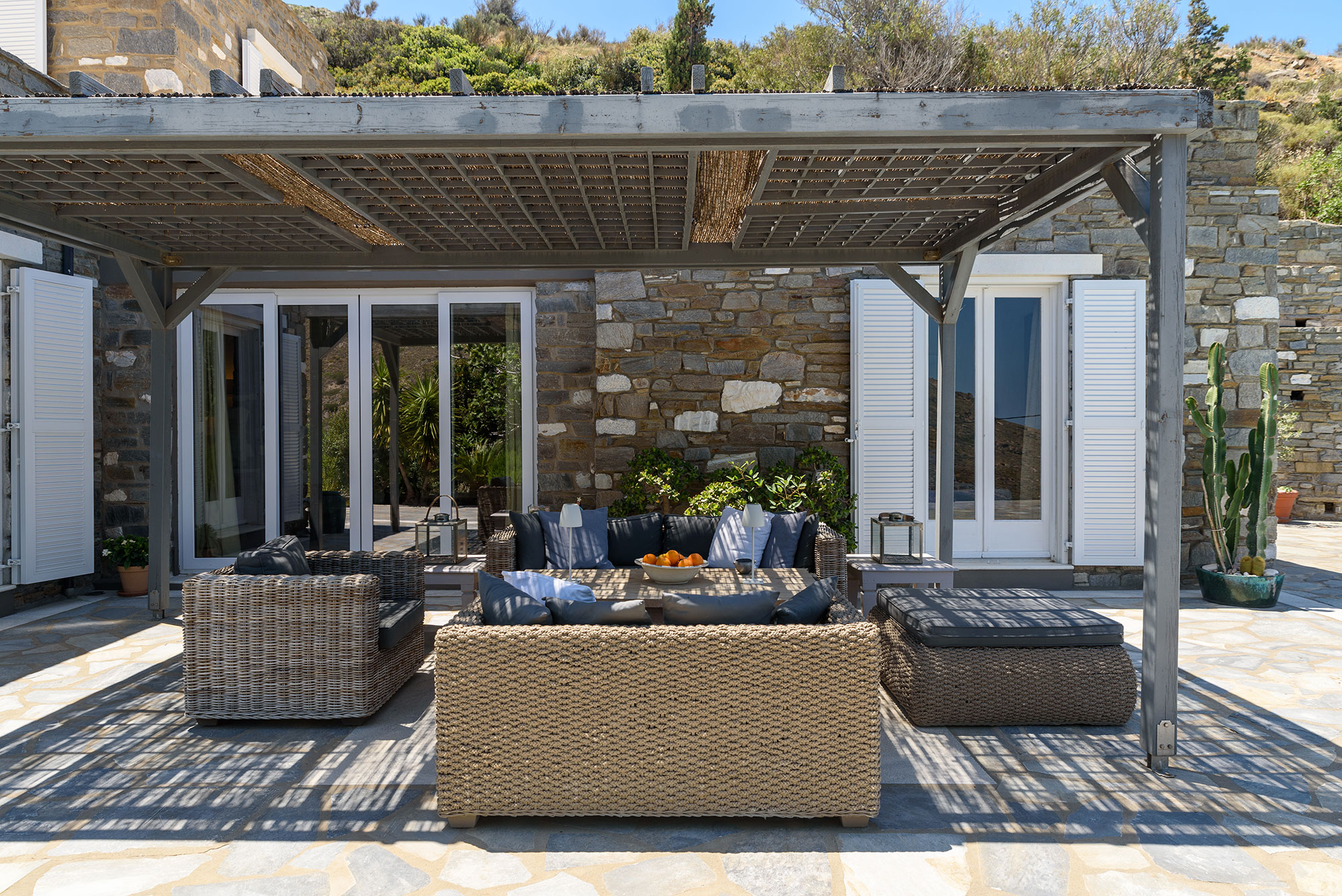 At one end, you can enjoy a stone table that seats six guests, screened by mature trees. There are plentiful cushioned steamer chairs, sun loungers, outdoor sofas to relax in, and an 11m swimming pool. At the far end of the terrace, you will find gazebo shades, cushioned banquettes and a nice spot to enjoy drinks and watch the sunset over the sea.