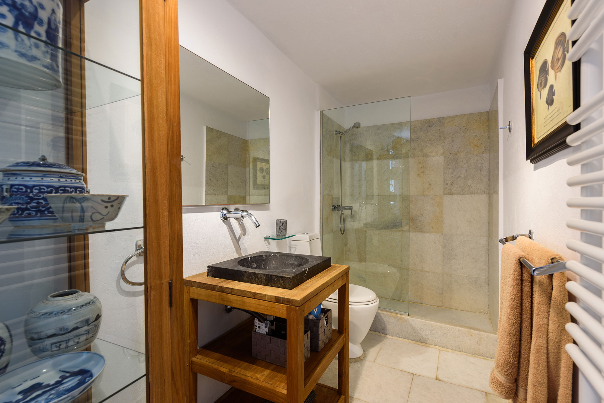 On the ground floor, an open-plan living space consists of a kitchen, living and dining areas with exposed stone walls, Persian rugs, a dining table for six, comfortable seating, and French doors onto the terrace. Two of the ensuite bedrooms are also on this floor. The master suite is on the first floor and has a private roof terrace. All bedrooms have sea views and modern shower rooms.