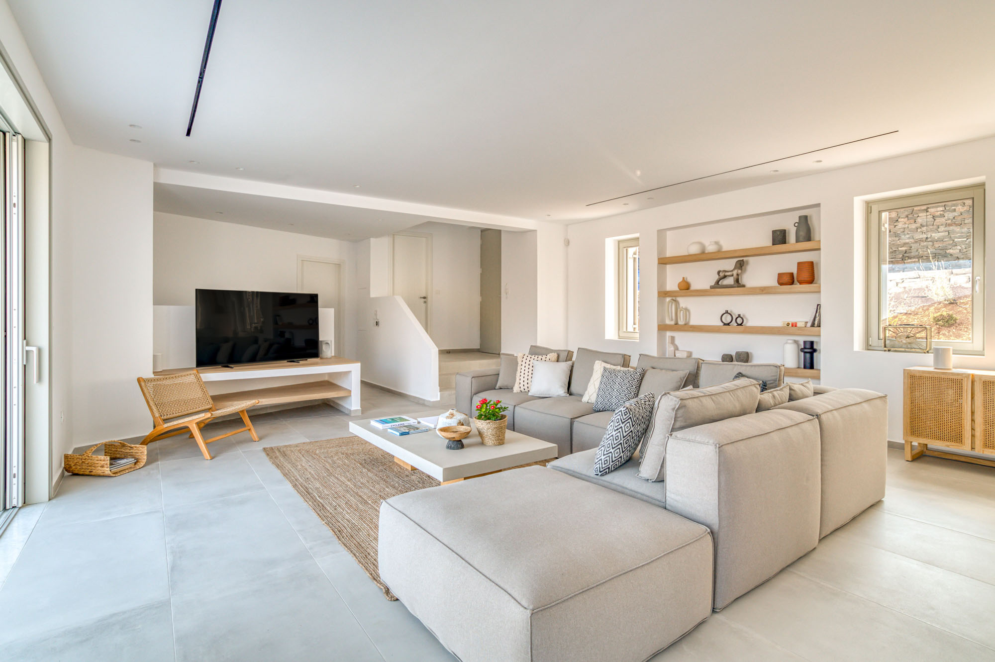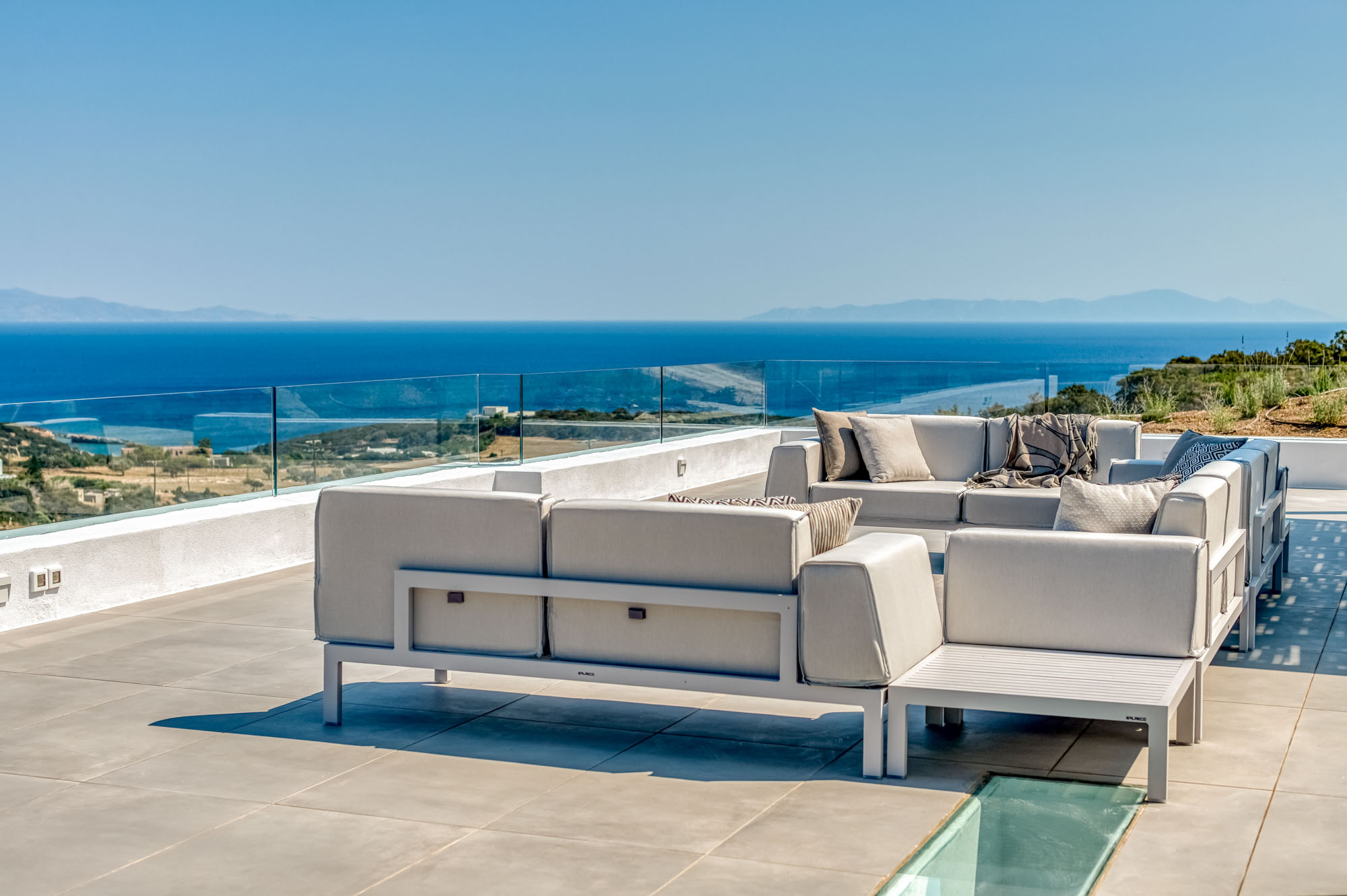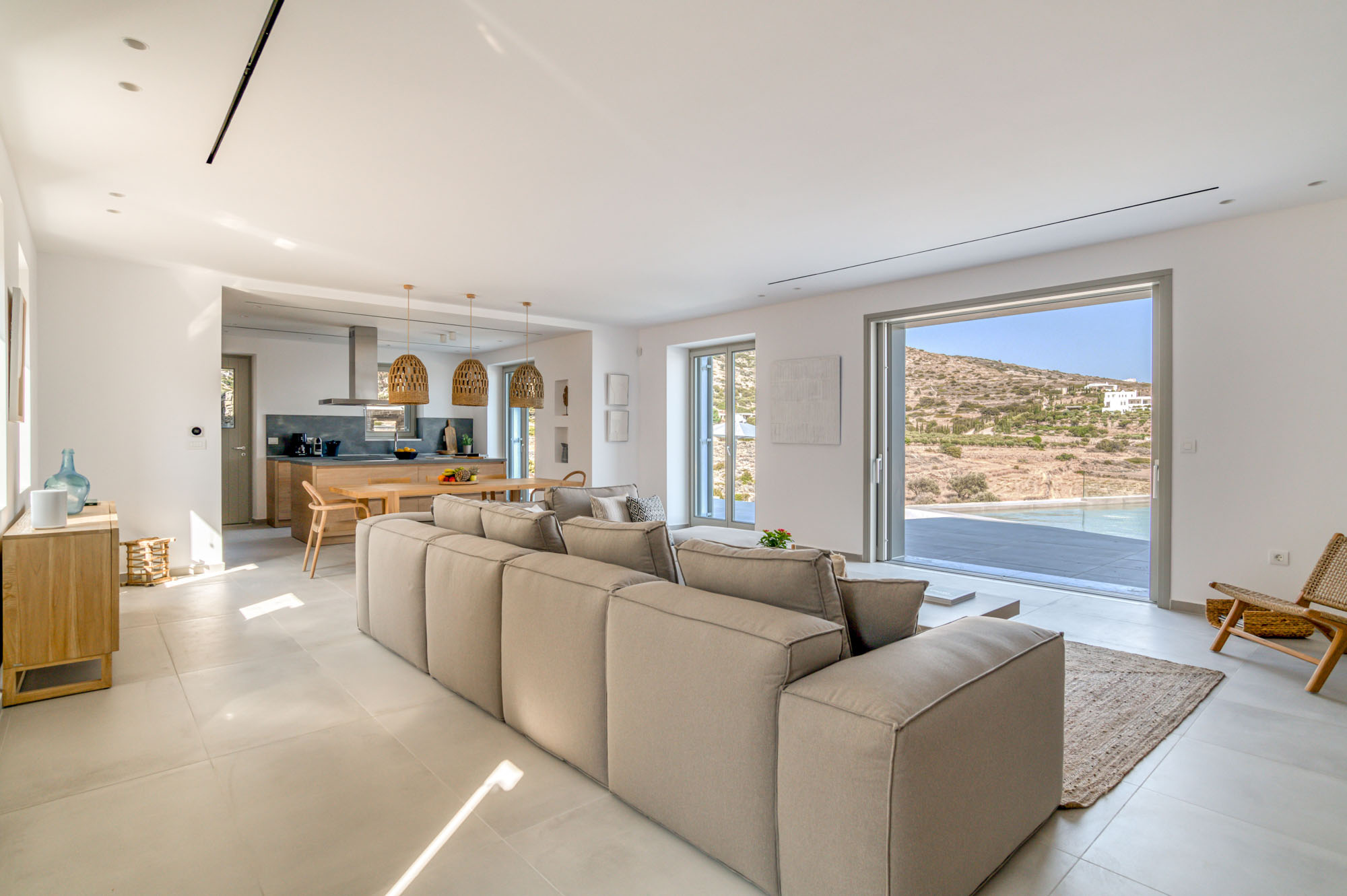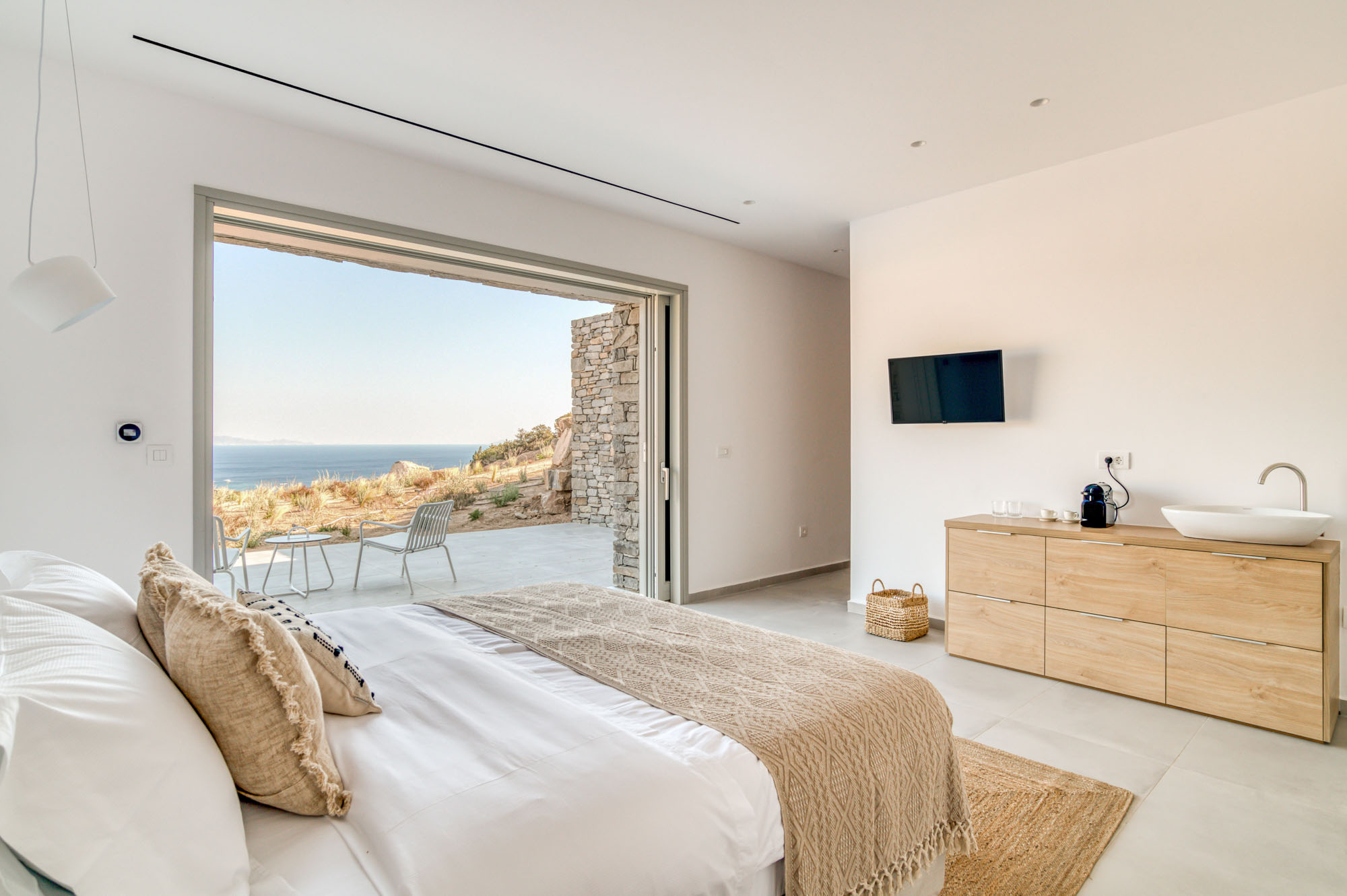 The main entrance level is home to a bright, airy sitting room and dining space, all opening onto the sea-facing terrace. Two master bedrooms are also located on this level, each with en-suite bathrooms and direct access to the main outdoor living areas. The lower floor houses five additional en-suite bedrooms, all enjoying outside access and uninterrupted sea views. Throughout, interiors emphasise comfort and natural materials, creating a relaxed yet refined atmosphere.
