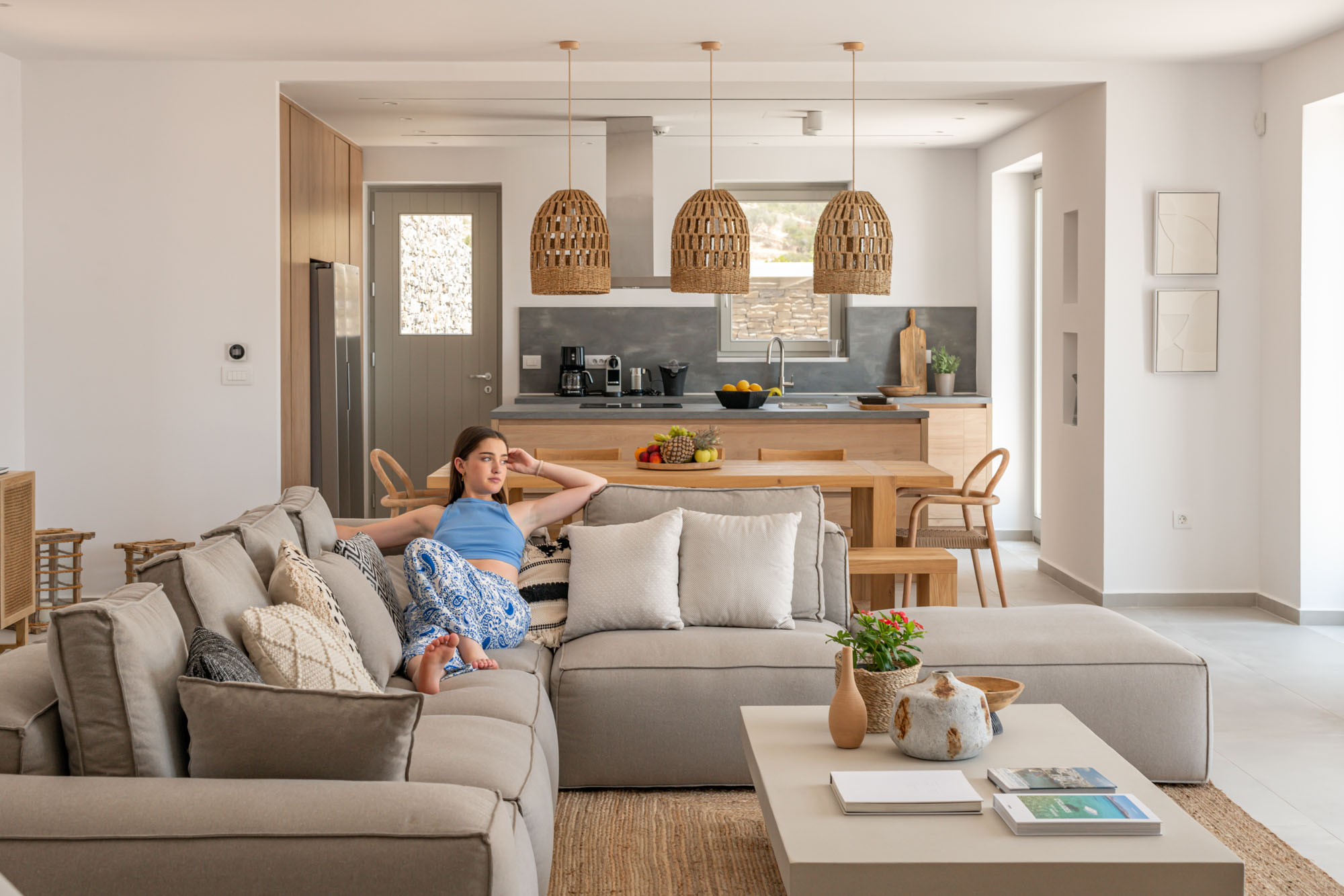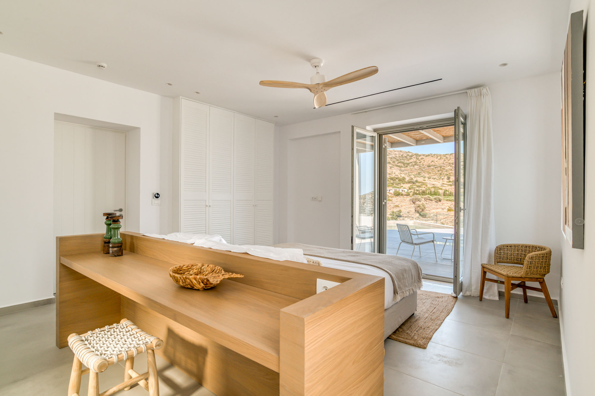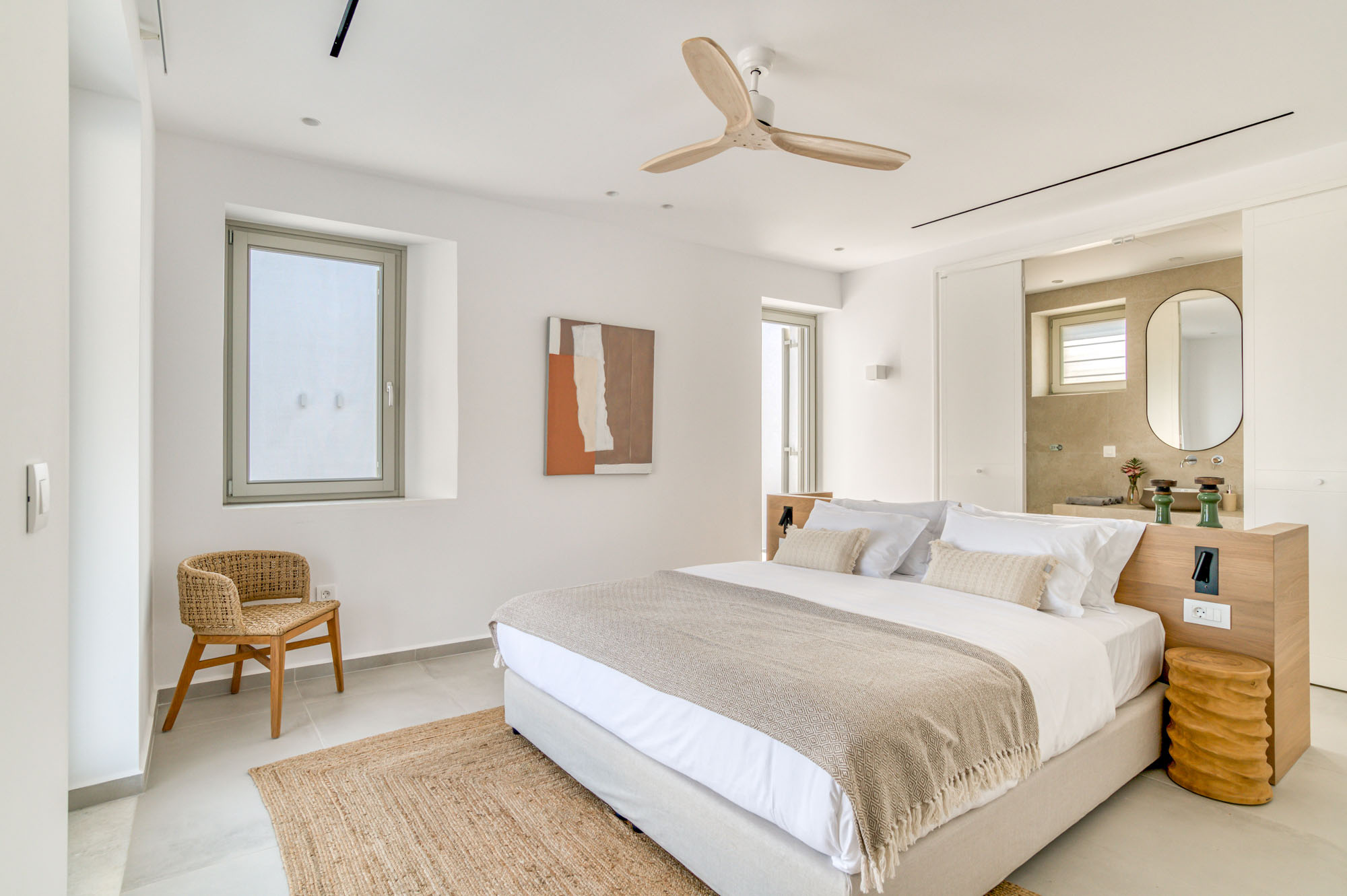 The main entrance level is home to a bright, airy sitting room and dining space, all opening onto the sea-facing terrace. Two master bedrooms are also located on this level, each with en-suite bathrooms and direct access to the main outdoor living areas. The lower floor houses five additional en-suite bedrooms, all enjoying outside access and uninterrupted sea views. Throughout, interiors emphasise comfort and natural materials, creating a relaxed yet refined atmosphere.