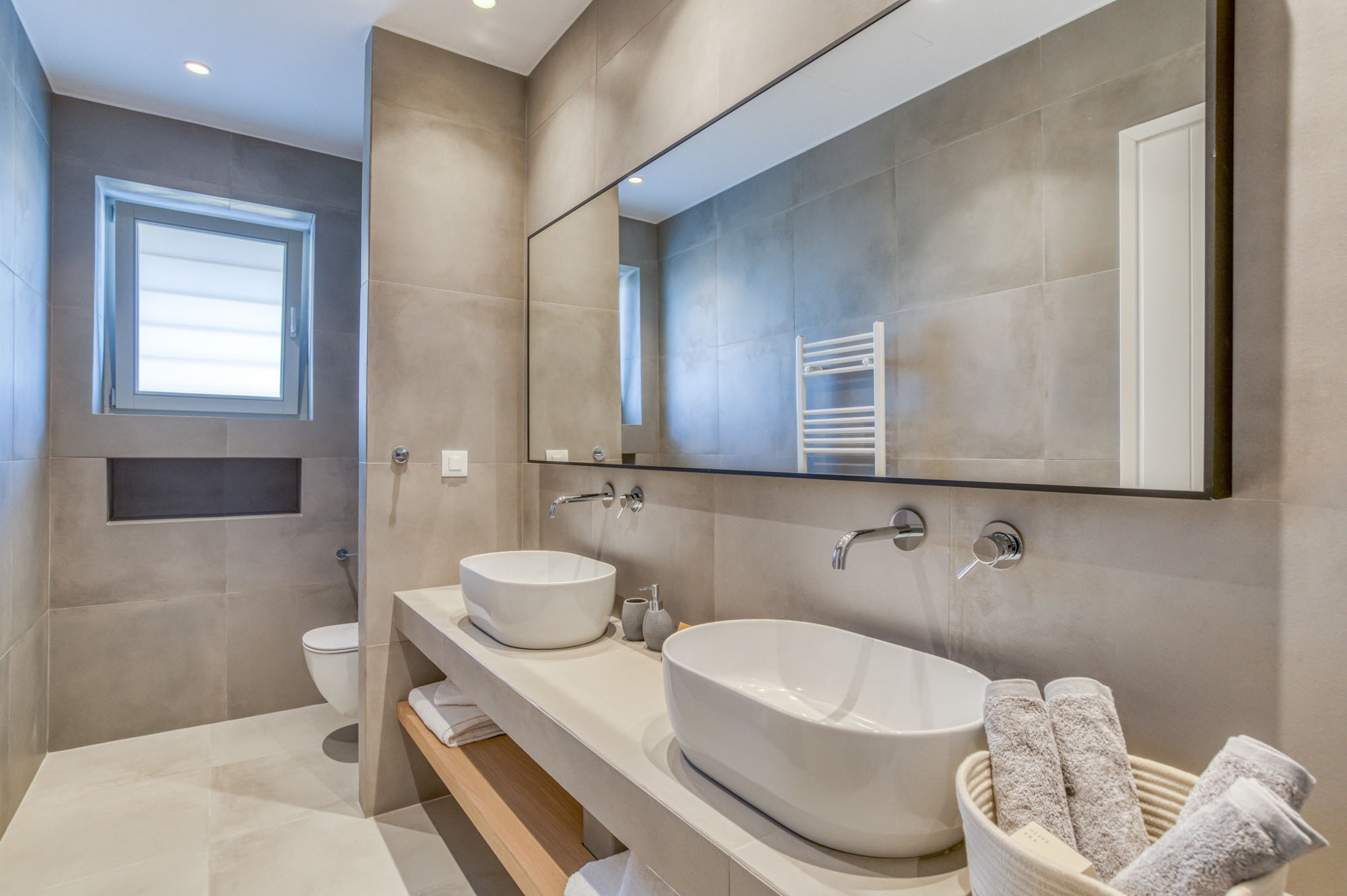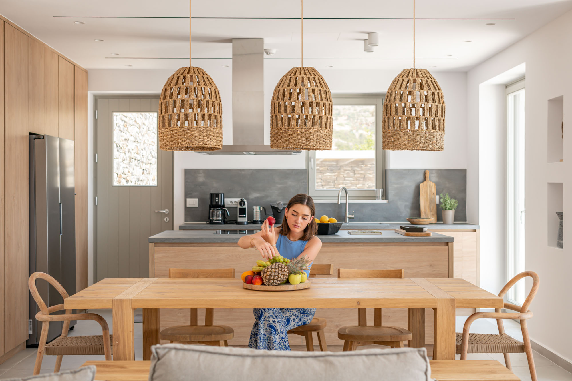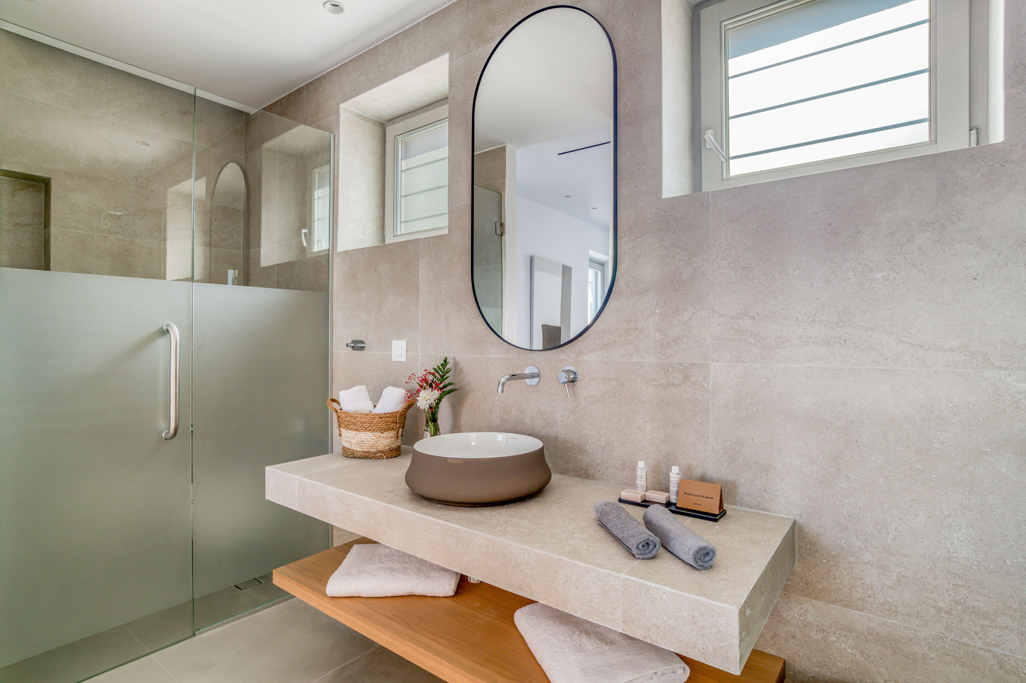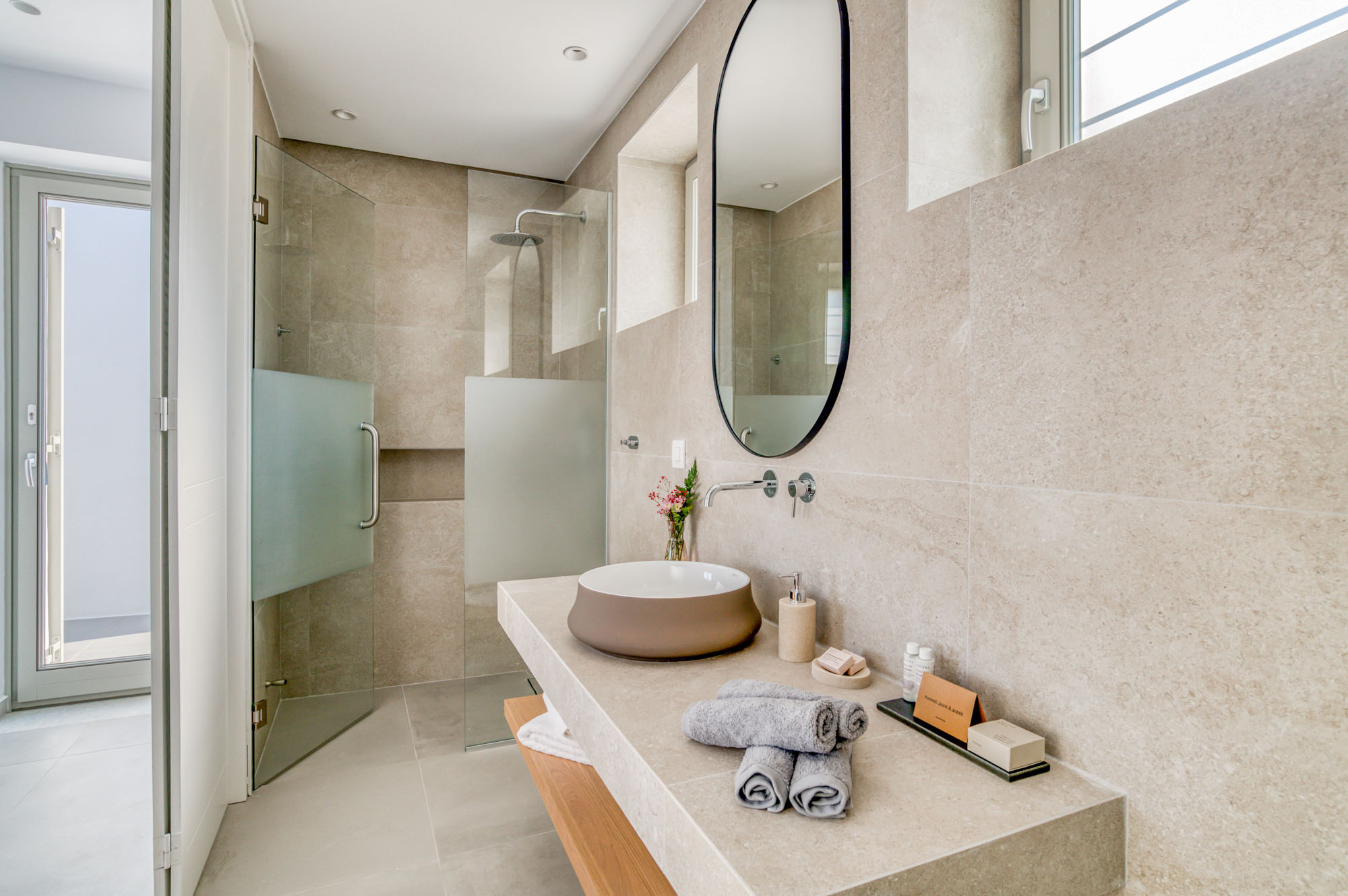 The main entrance level is home to a bright, airy sitting room and dining space, all opening onto the sea-facing terrace. Two master bedrooms are also located on this level, each with en-suite bathrooms and direct access to the main outdoor living areas. The lower floor houses five additional en-suite bedrooms, all enjoying outside access and uninterrupted sea views. Throughout, interiors emphasise comfort and natural materials, creating a relaxed yet refined atmosphere.
