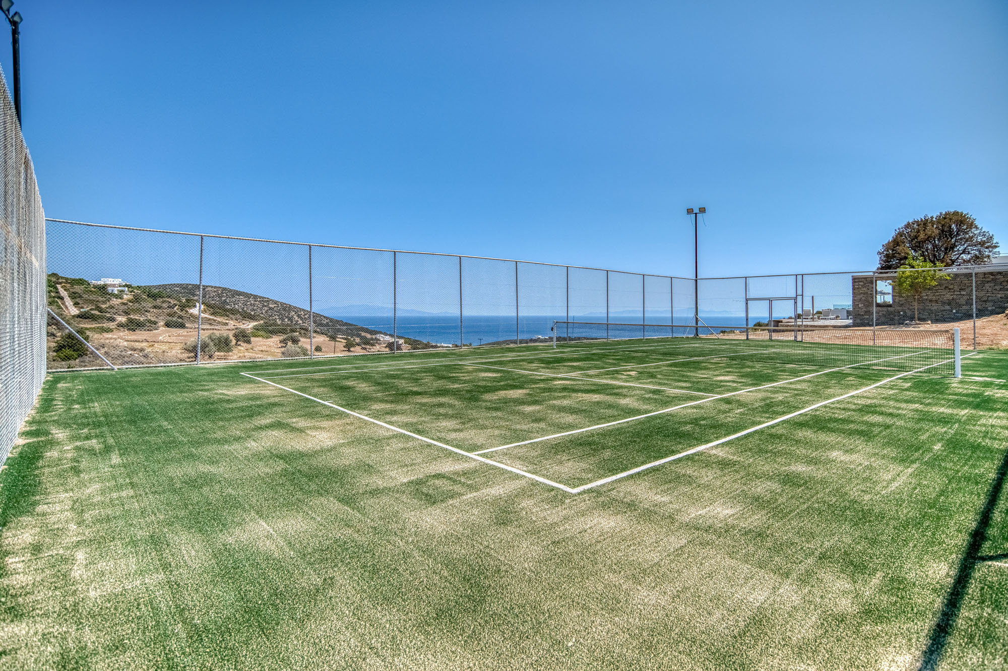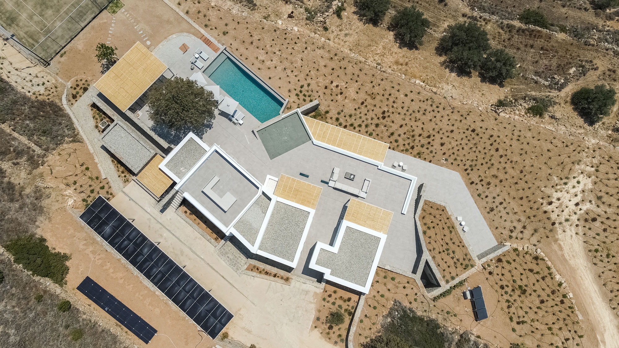 Spacious terraces wrap around the villa, featuring an outdoor kitchen and dining area, a lounge area with fireplace and an infinity pool with massage jets. A dedicated children’s pool sits just above, allowing younger guests to play safely. Beyond the pool terrace, guests will find a private tennis court and covered parking equipped with an electric car charger. Every area is designed to maximise the views and the gentle coastal breeze.