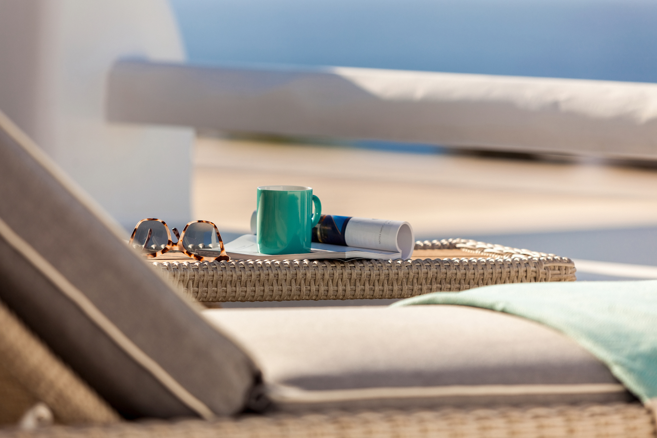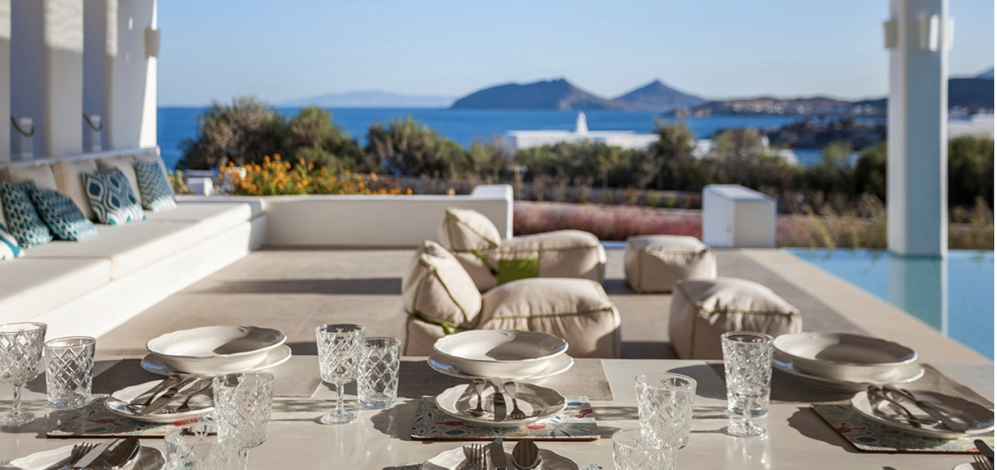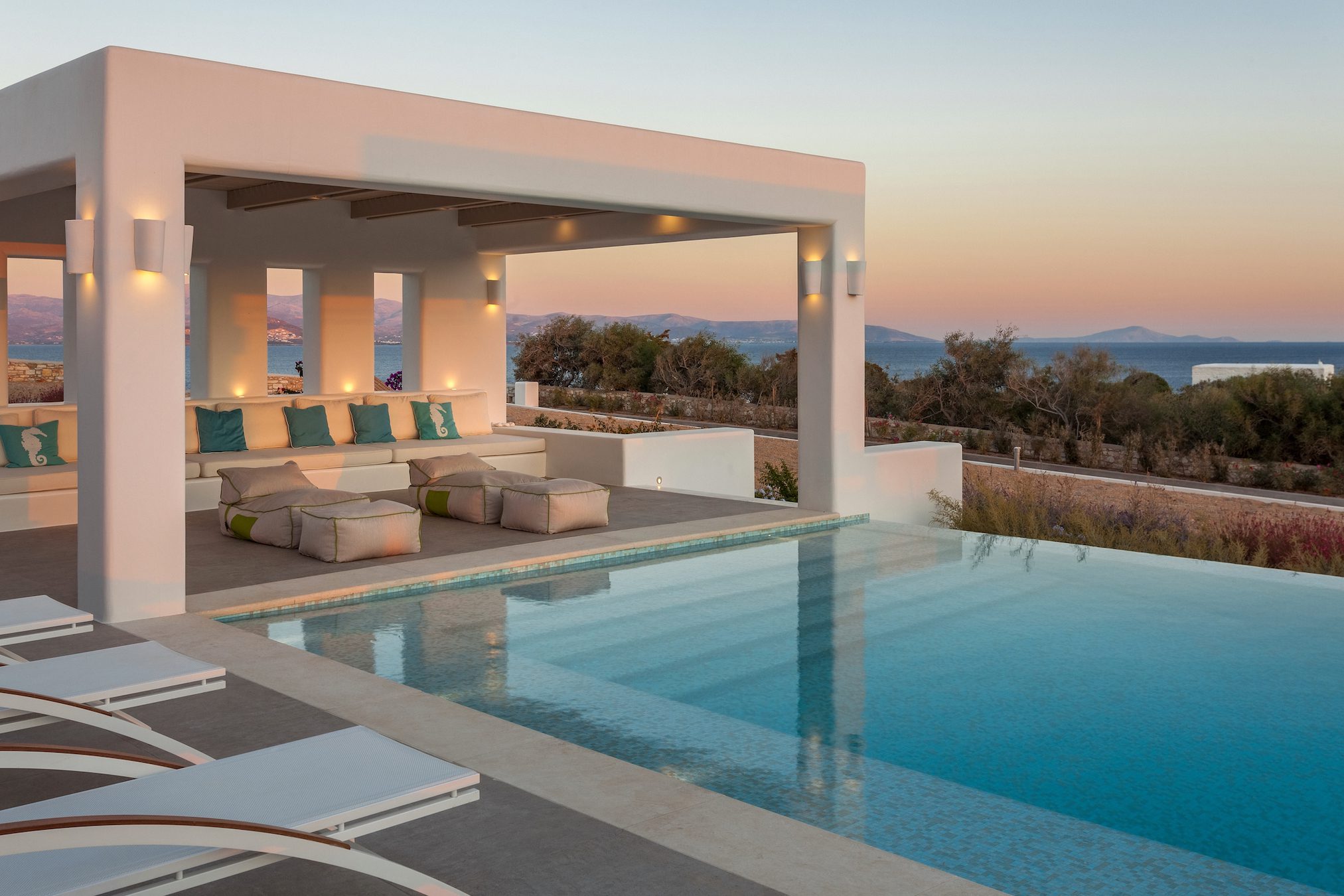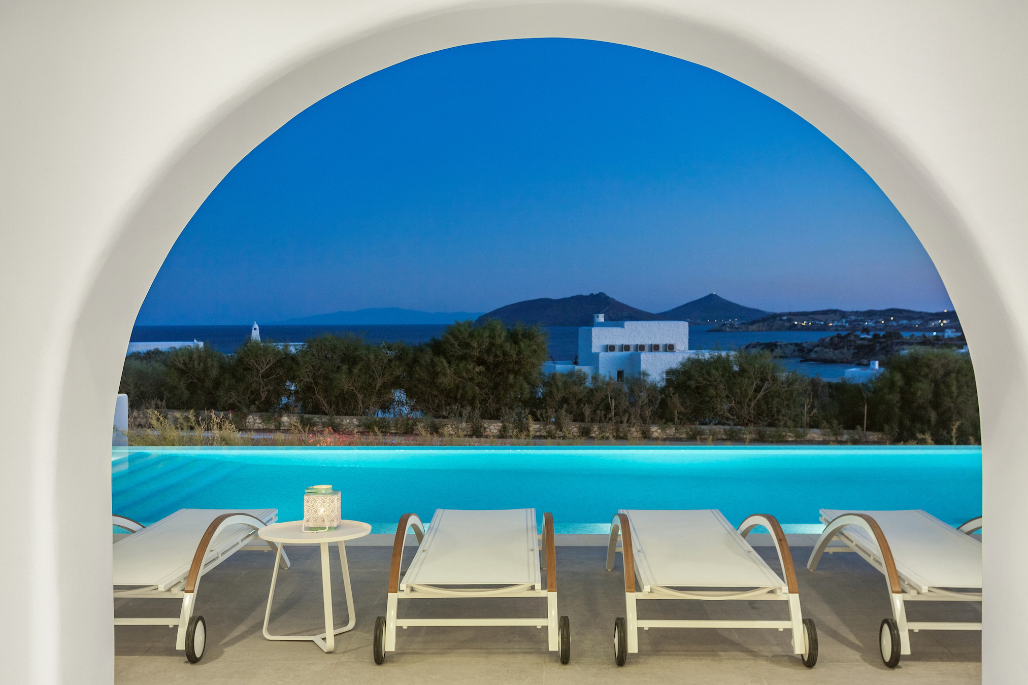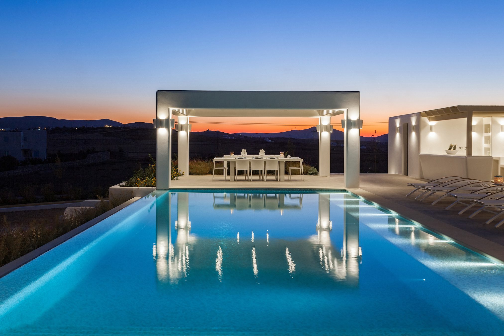 Expansive terraces provide luxurious lounge areas, a shaded dining table for 16, an outdoor kitchen and bar, and a barbecue. Plump cushions and sun loungers surround the sparkling infinity pool, which is beautifully lit at night, creating the perfect setting for enjoying stunning sunsets over the Aegean.