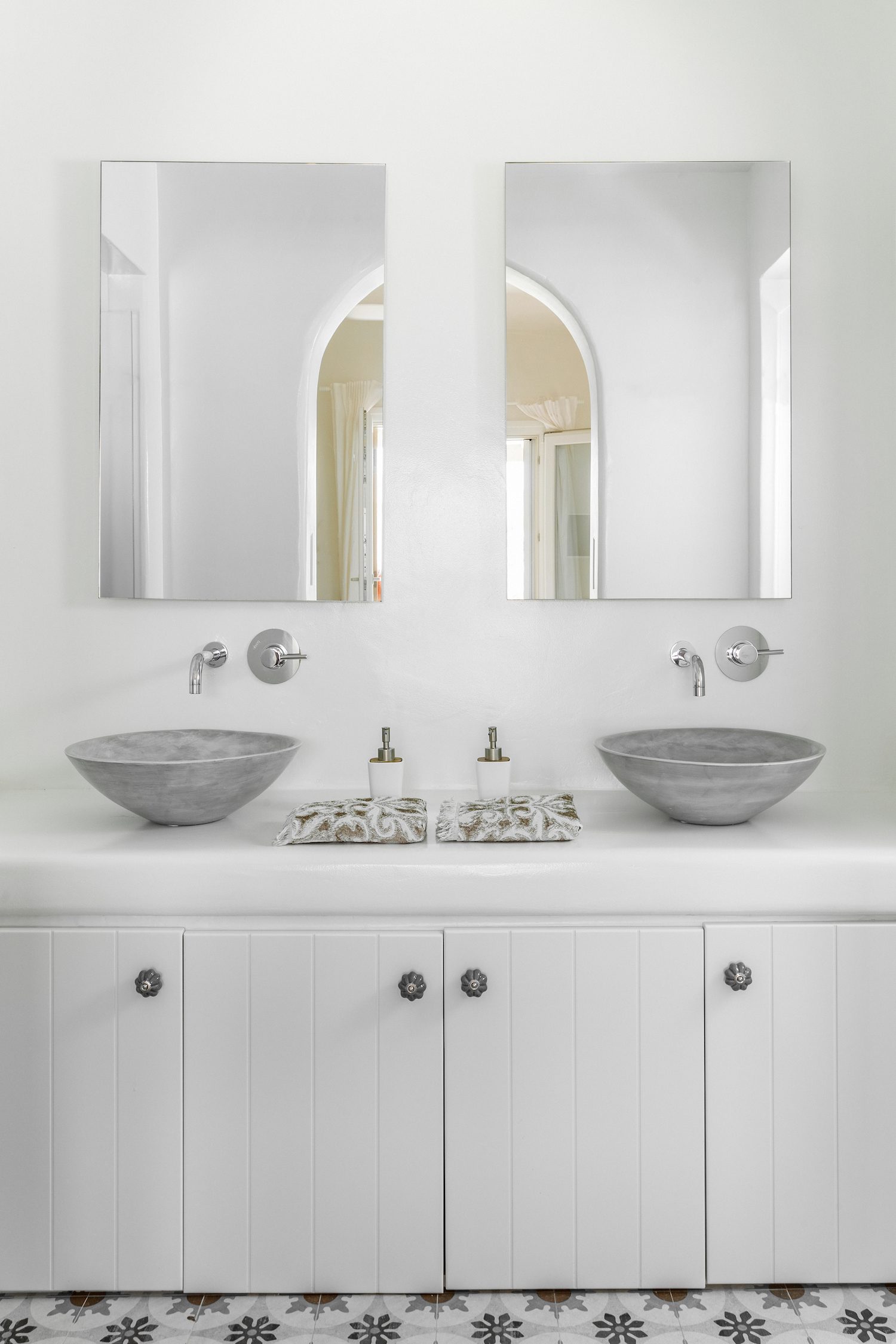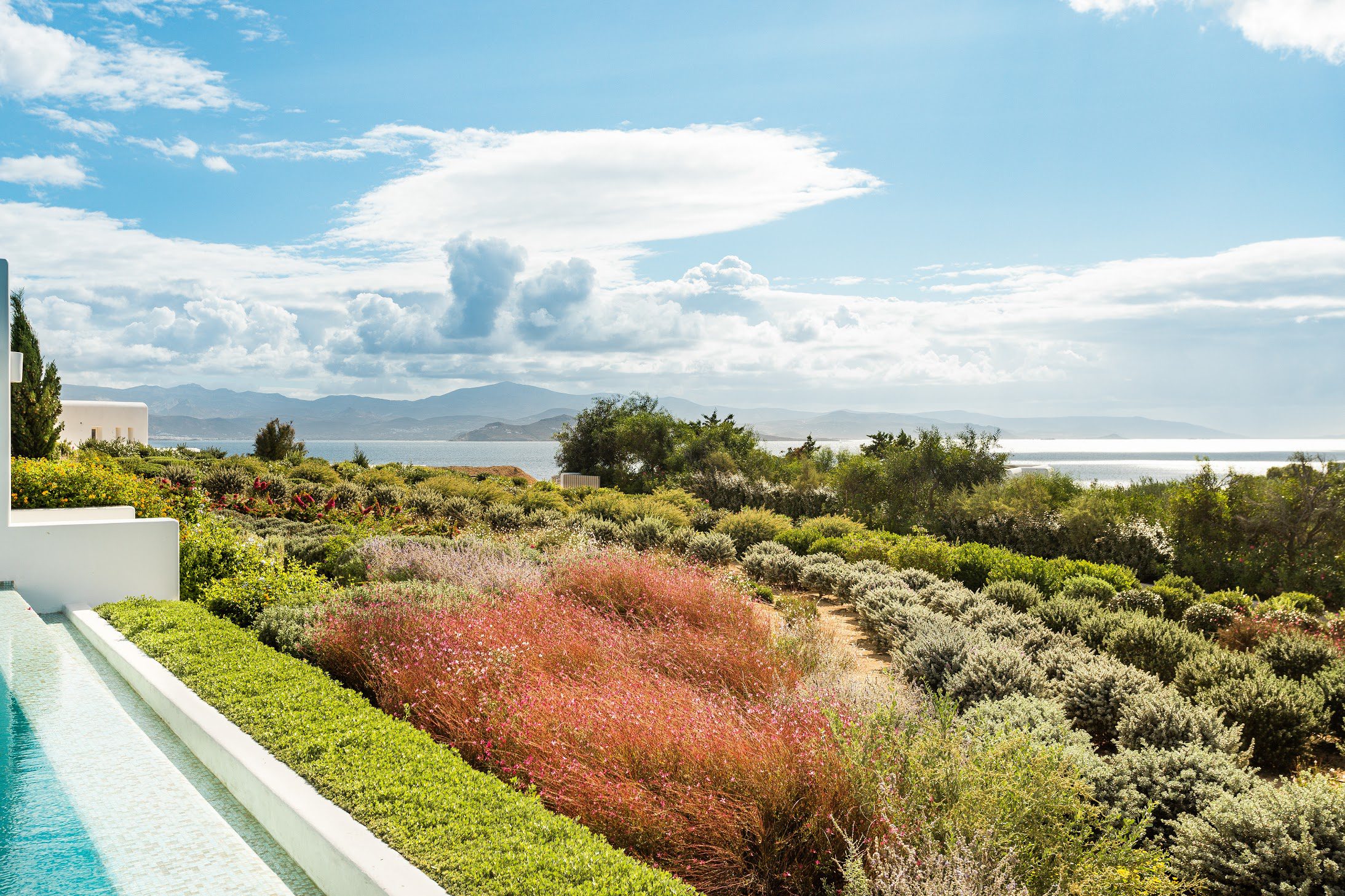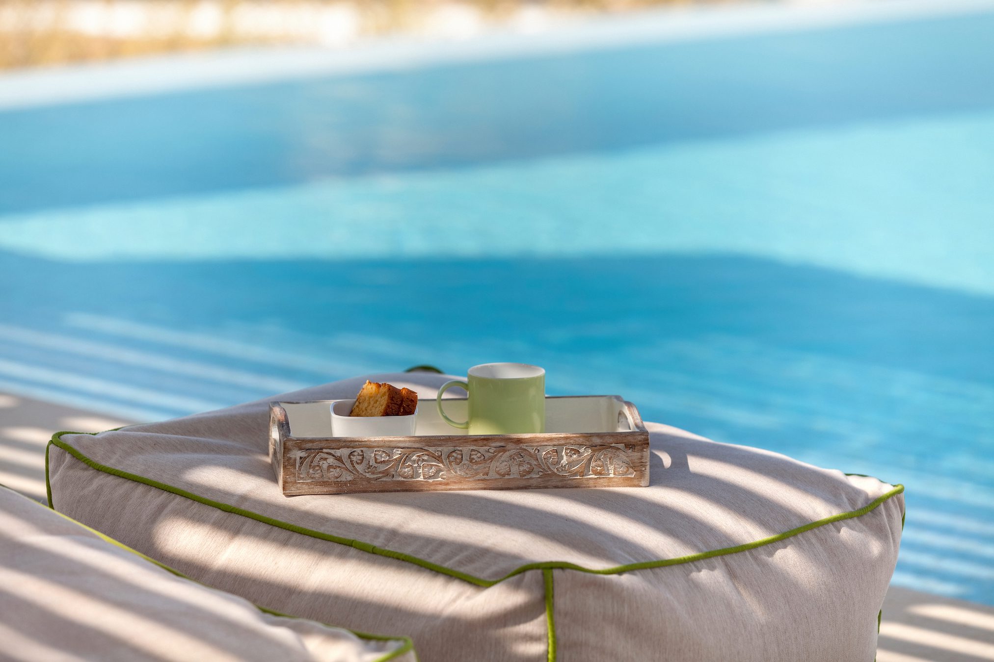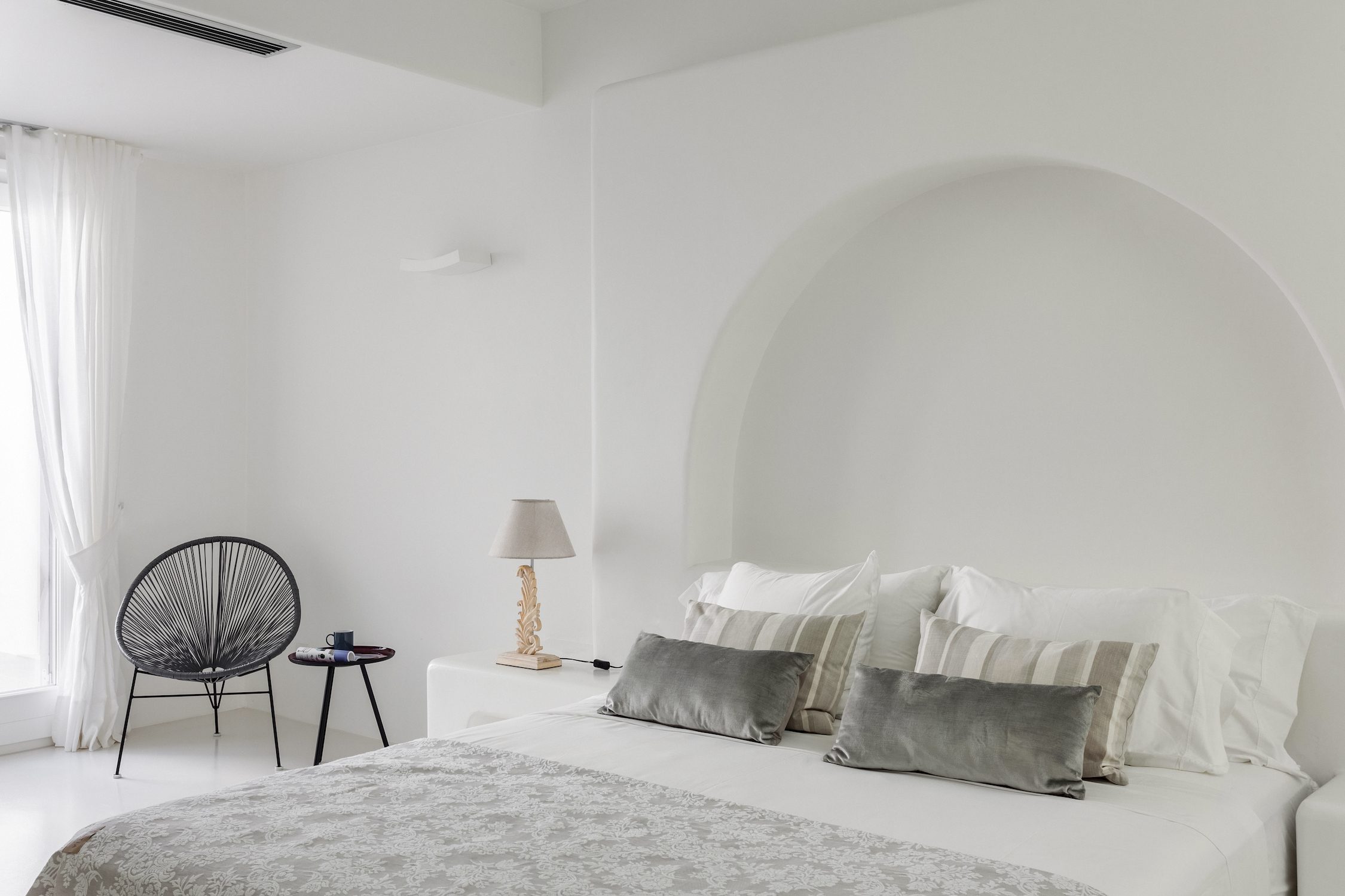 The design elegantly blends modern architectural details with the traditional whitewashed Cycladic style. With stunning views across the Aegean Sea towards Naxos, the villa offers a peaceful retreat while being just a short drive from the bustling harbour village of Naoussa, known for its vibrant atmosphere and excellent seafood restaurants. For larger groups, Villa Alpha can be rented alongside Villa Gamma.