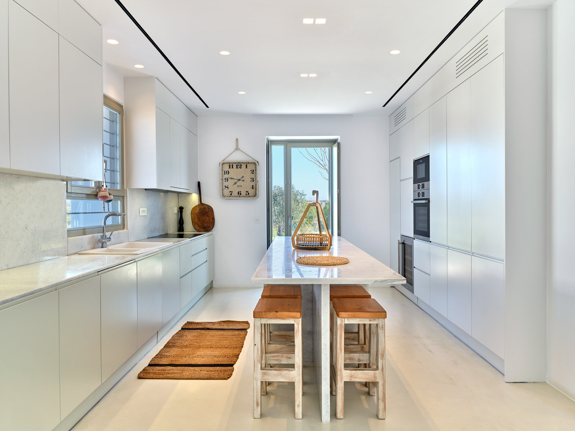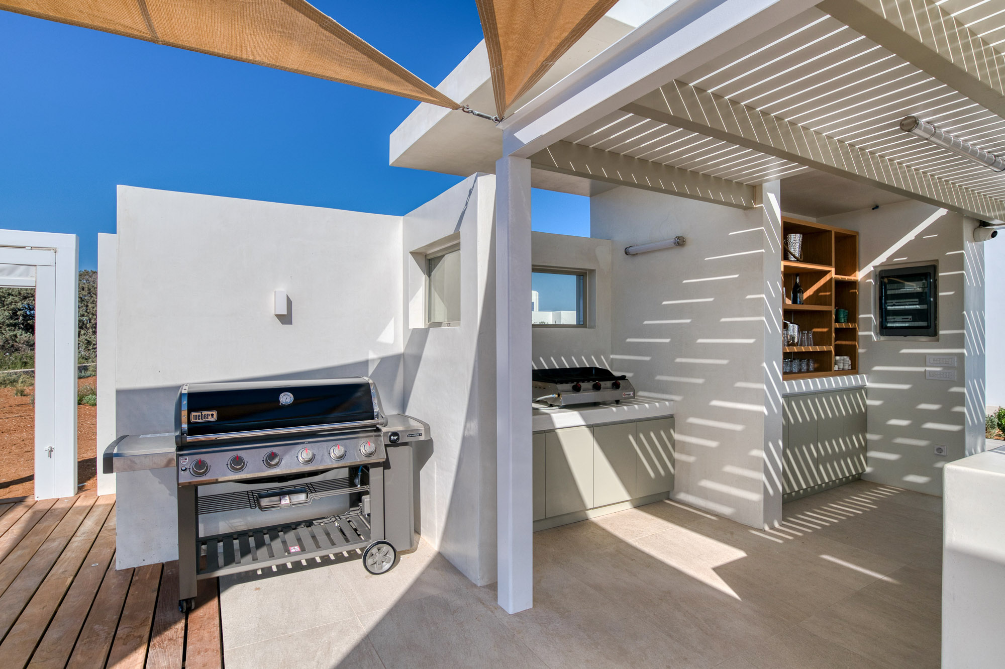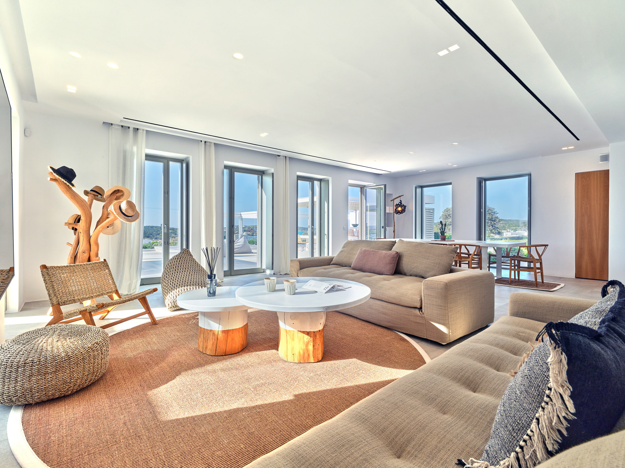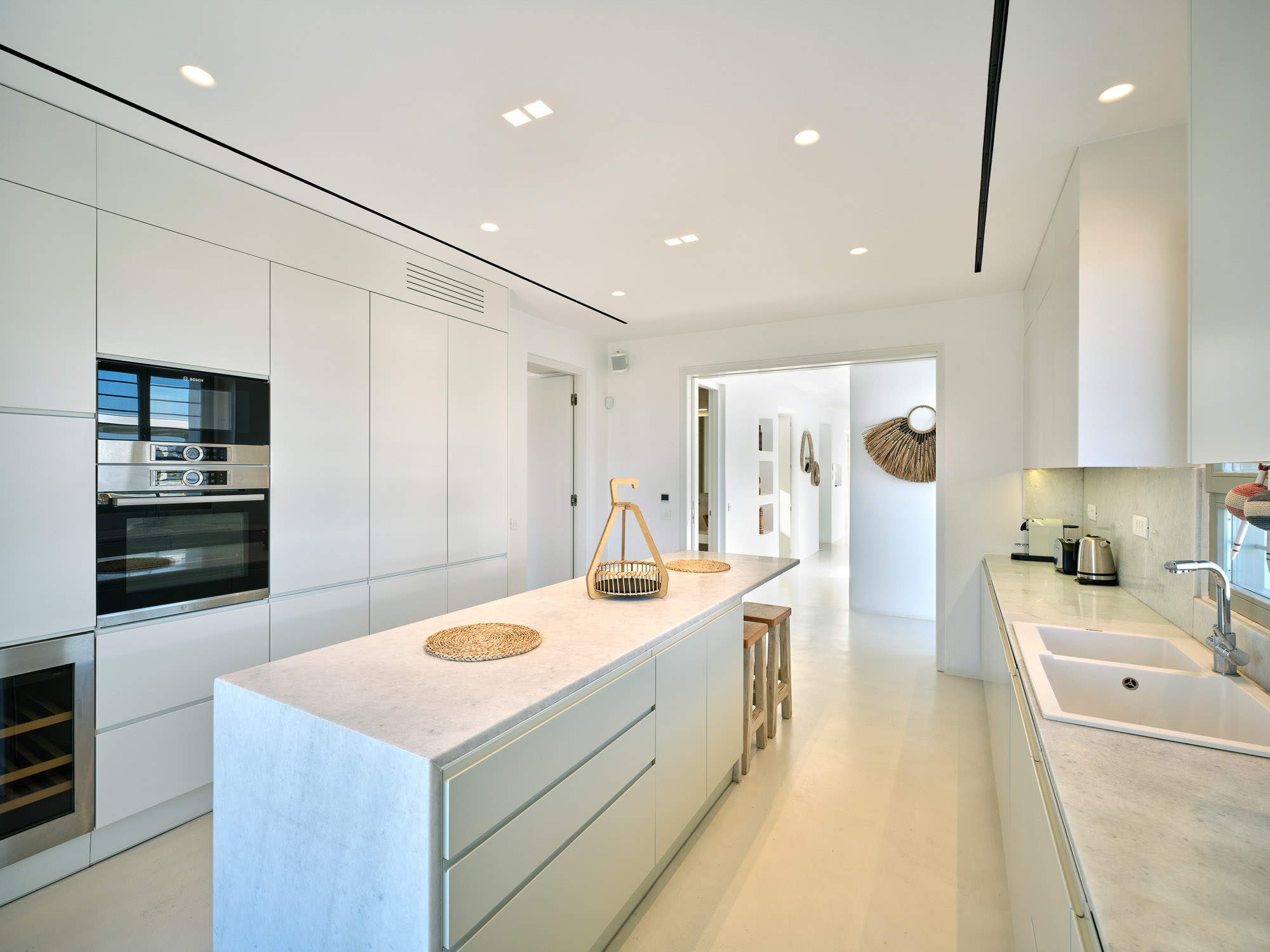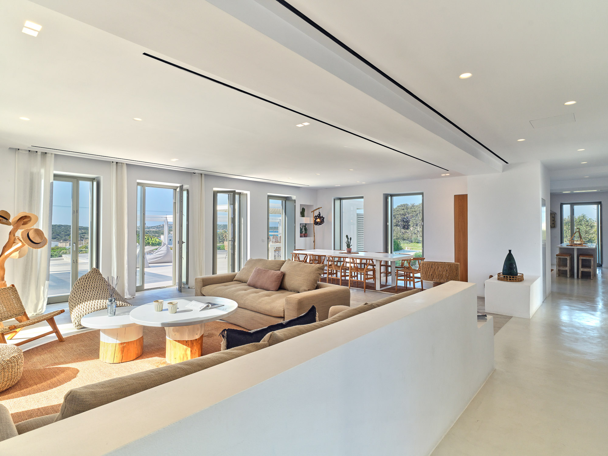 Pale colours and simple, clean-lined furnishings create calm, harmonious living spaces that feel cool and spacious. The ground floor of the main house features a large open-plan living and dining area with doors to the terrace, a well-equipped kitchen and 3 elegantly decorated double en-suite bedrooms. The top floor hosts two double en-suite bedrooms open to voluminous balconies, breathing in the awe-inspiring views of the sea and surrounding area. The separate one-bedroom guesthouse for two has a bathroom, kitchenette, and private verandah.