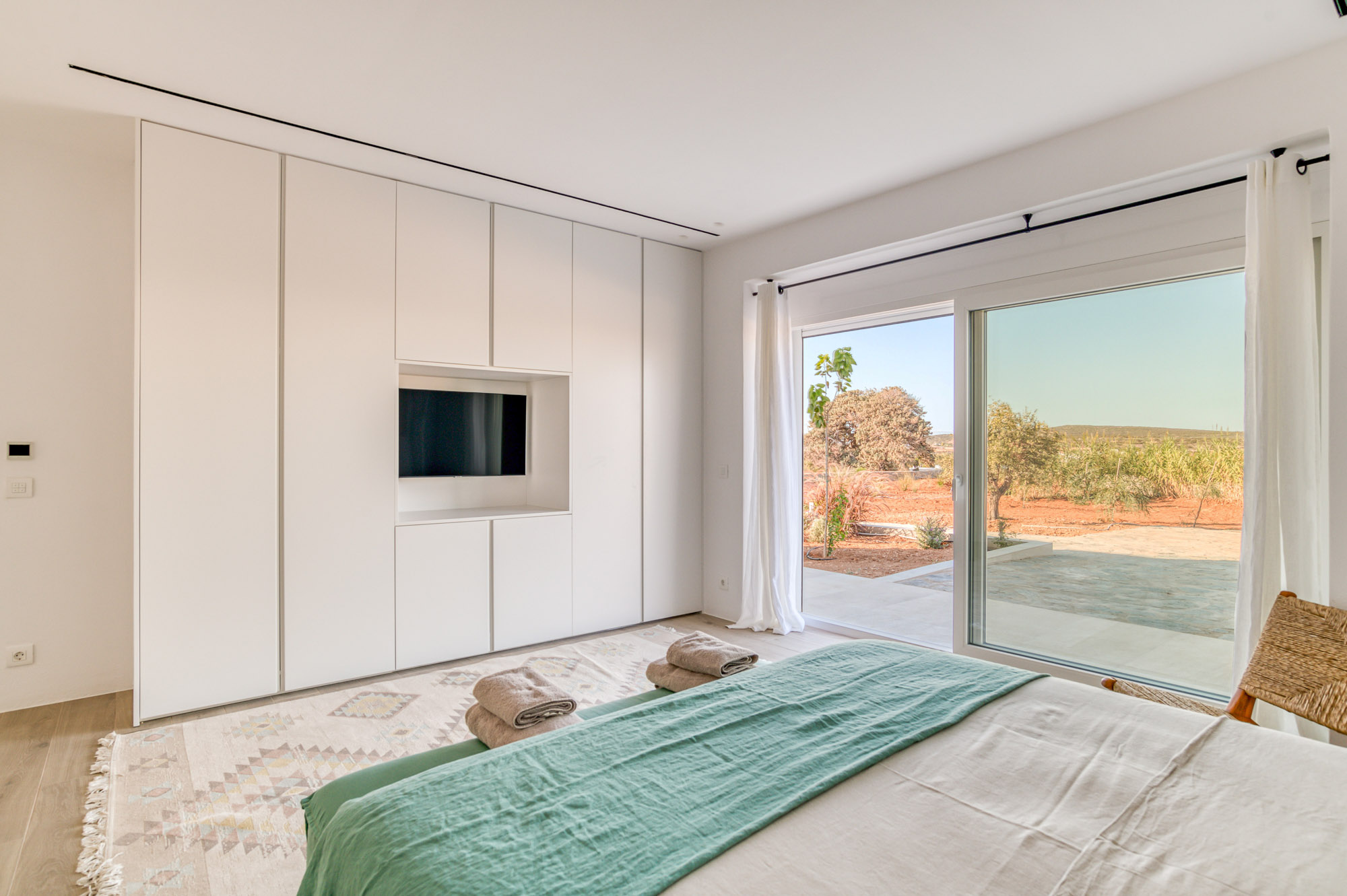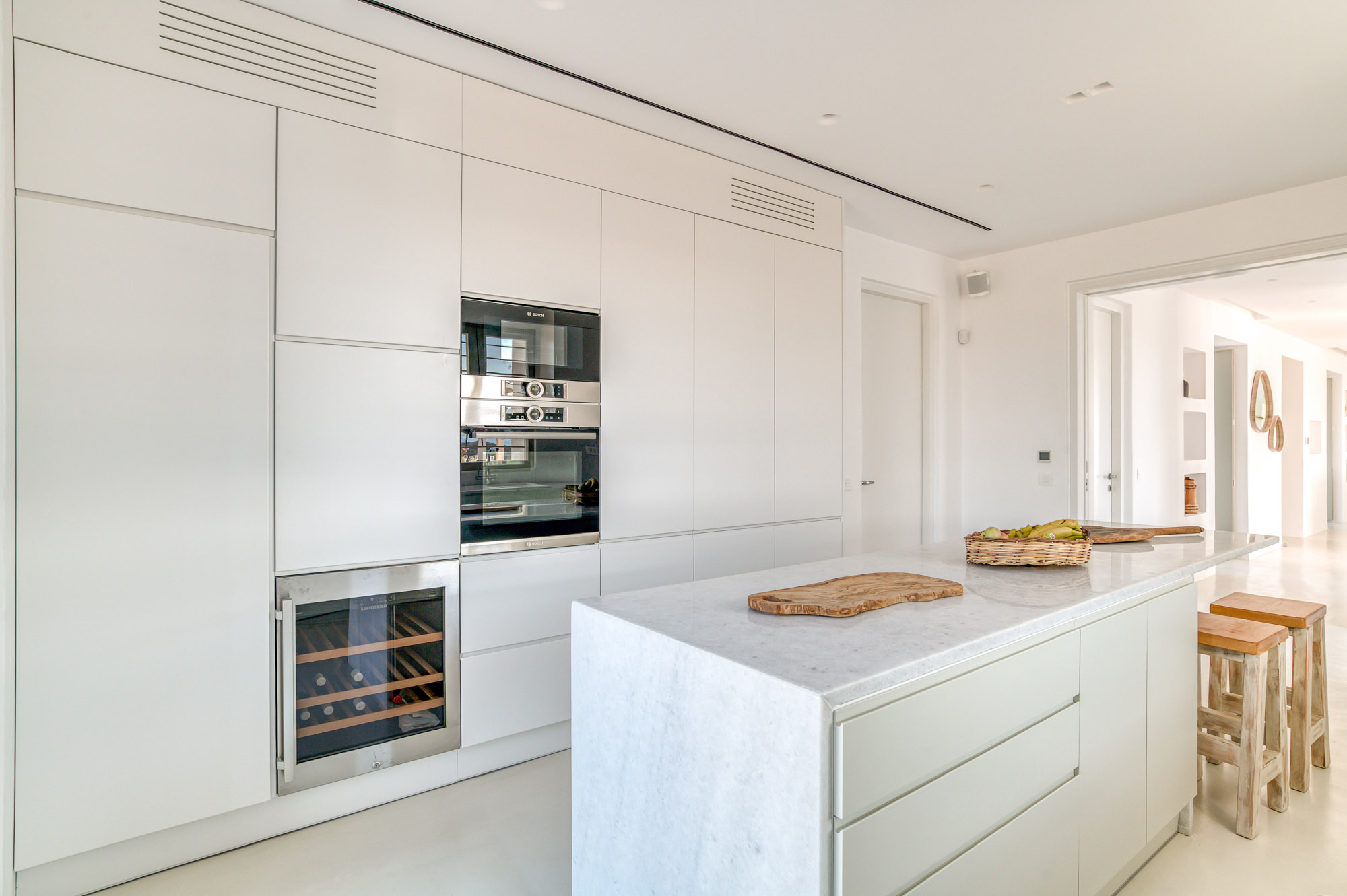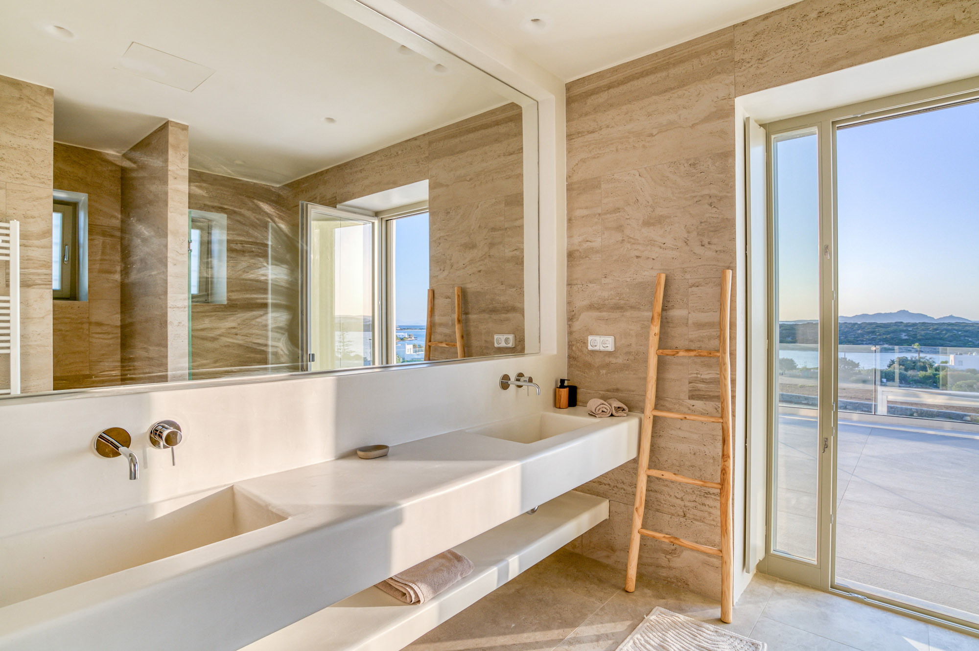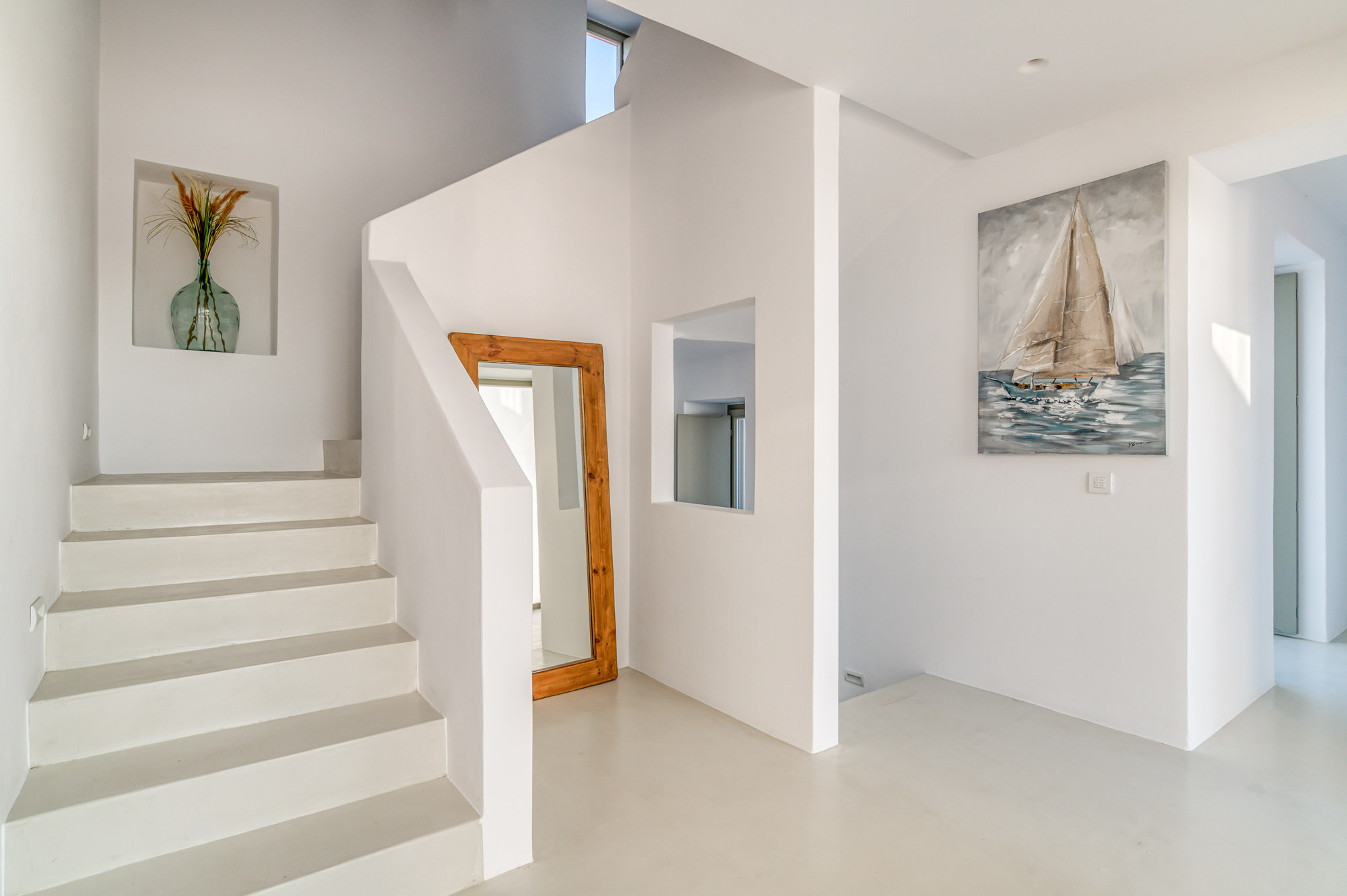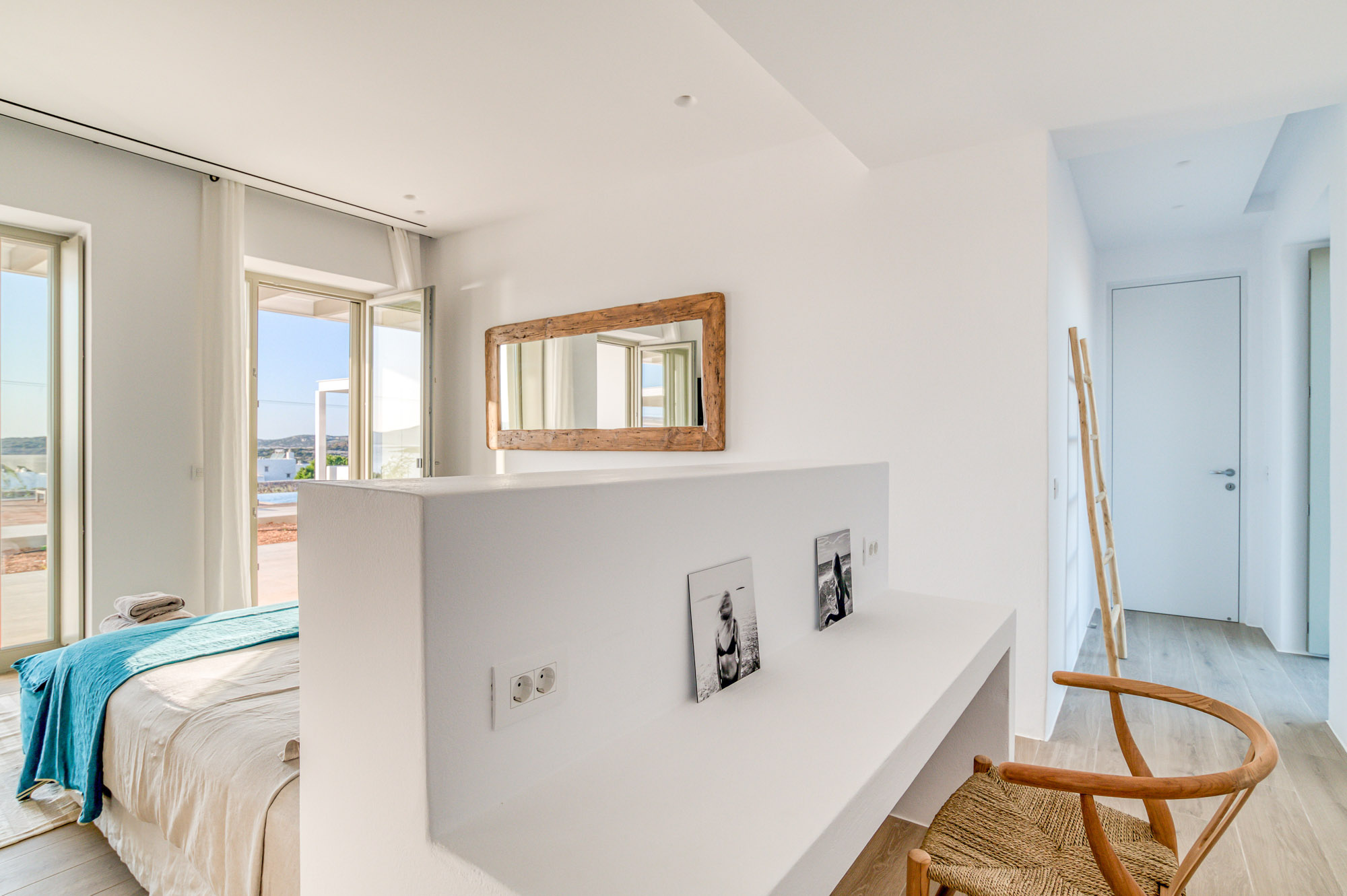Pale colours and simple, clean-lined furnishings create calm, harmonious living spaces that feel cool and spacious. The ground floor of the main house features a large open-plan living and dining area with doors to the terrace, a well-equipped kitchen and 3 elegantly decorated double en-suite bedrooms. The top floor hosts two double en-suite bedrooms open to voluminous balconies, breathing in the awe-inspiring views of the sea and surrounding area. The separate one-bedroom guesthouse for two has a bathroom, kitchenette, and private verandah.