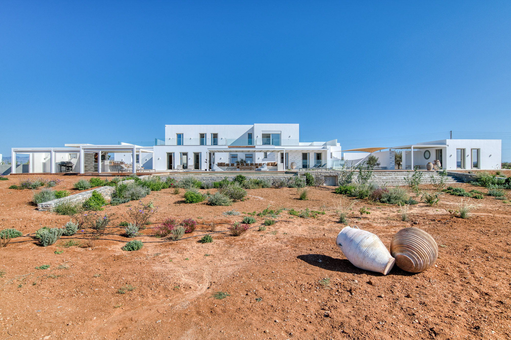 Inspired by vernacular architecture, the simple geometric forms contrast with the rugged surrounding landscape and face out to the sea, affording fantastic unobstructed views. The villa is a bright, abundant home for 12 guests, unfolding in a two-storey house and a fully separate guesthouse for two at the edge of its vast courtyard.