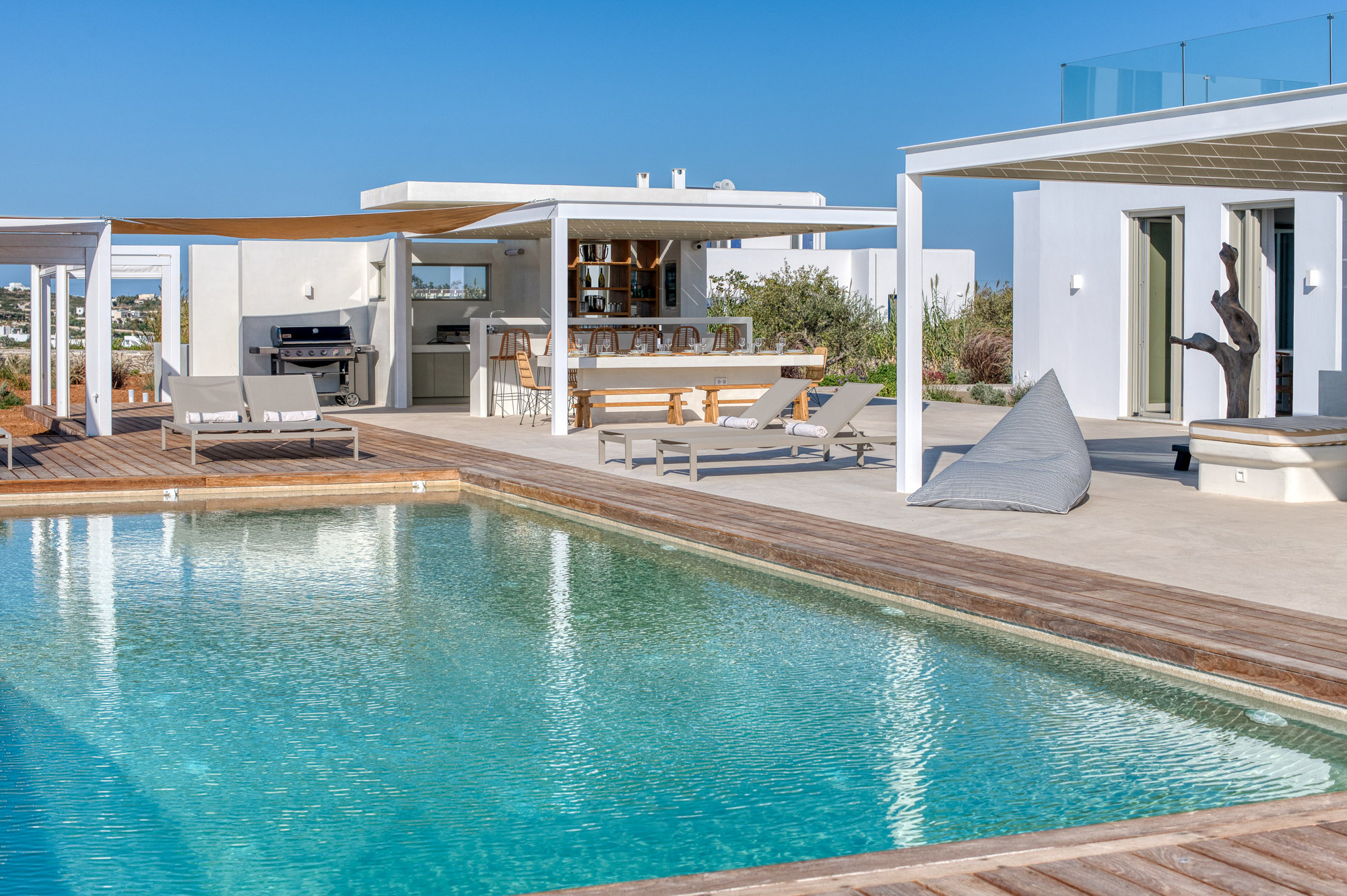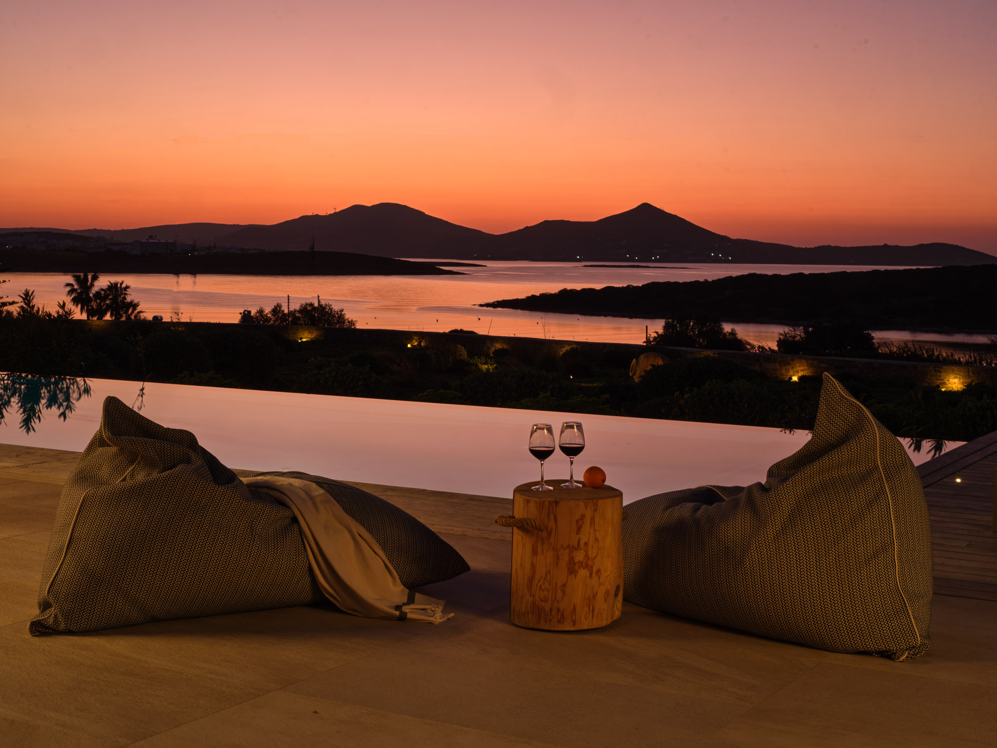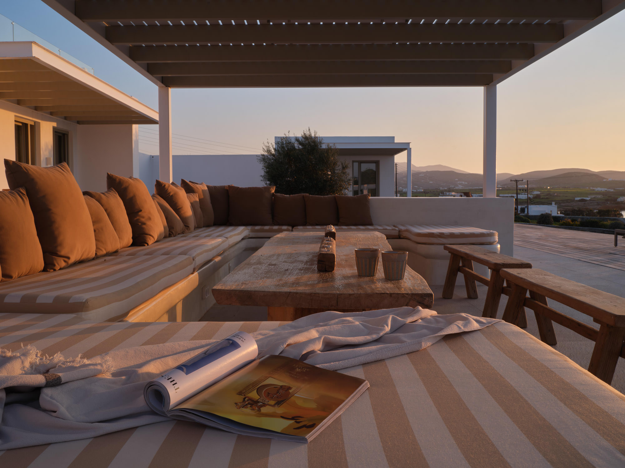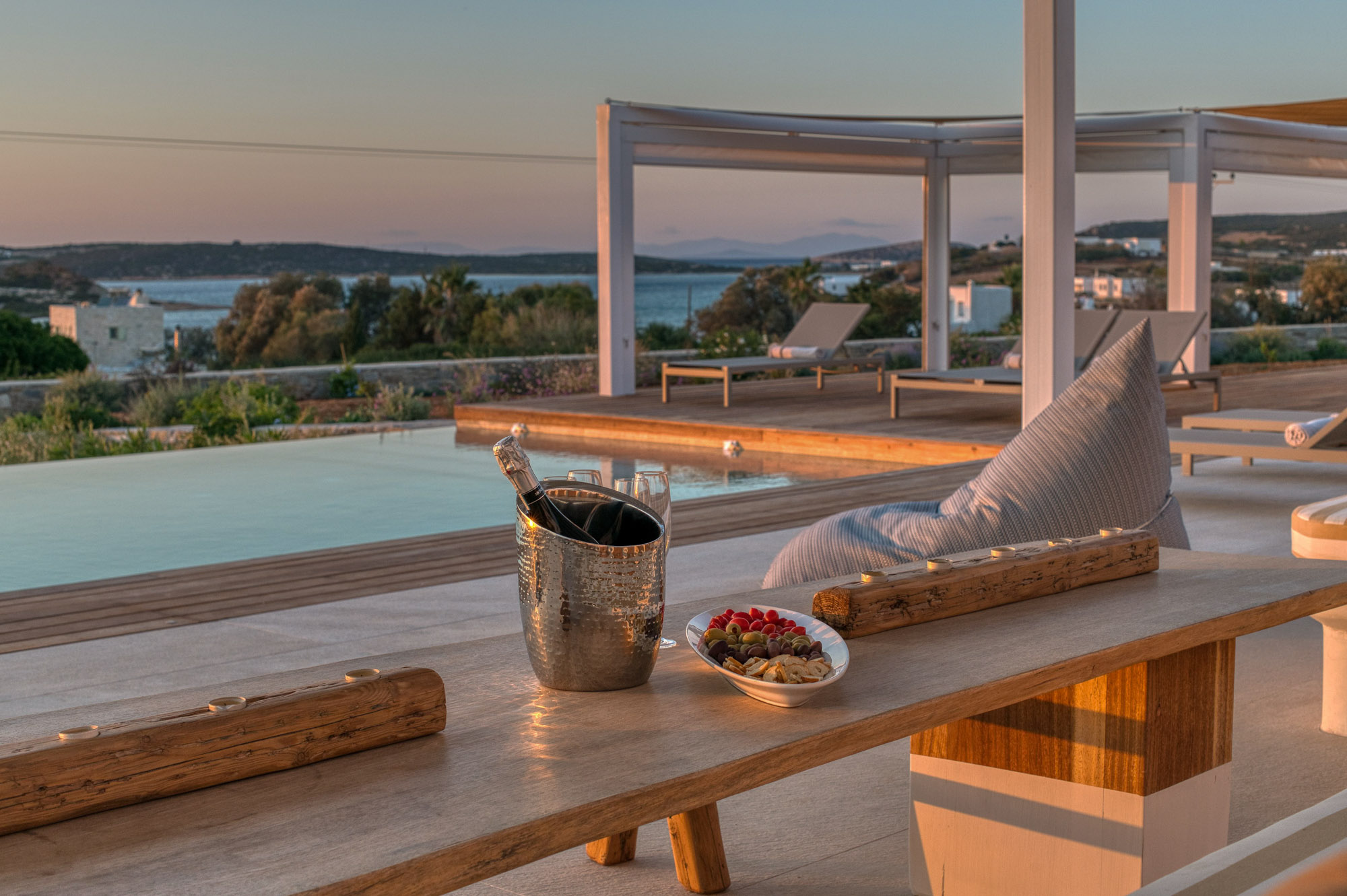 Xifara’s calm shoreline, known for its golden sands and clear waters, is ideal for swimming or windsurfing just moments from the villa. A short drive leads to Naoussa’s lively town centre, where restaurants, nightlife, and boutiques await. At the same time, nearby Santa Maria is known for its striking beaches and laid-back resort atmosphere, offering a seamless blend of quiet and local vibrancy.