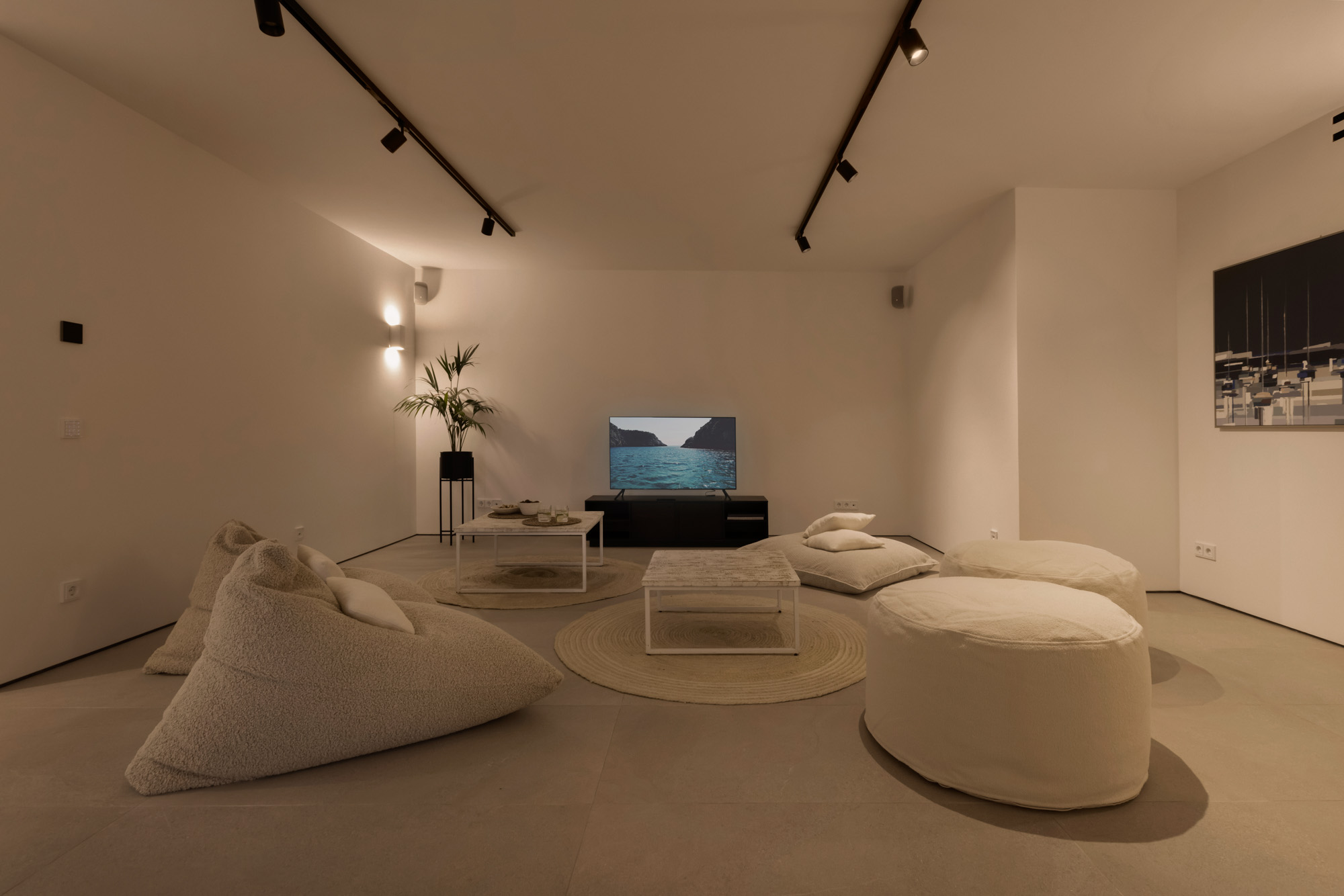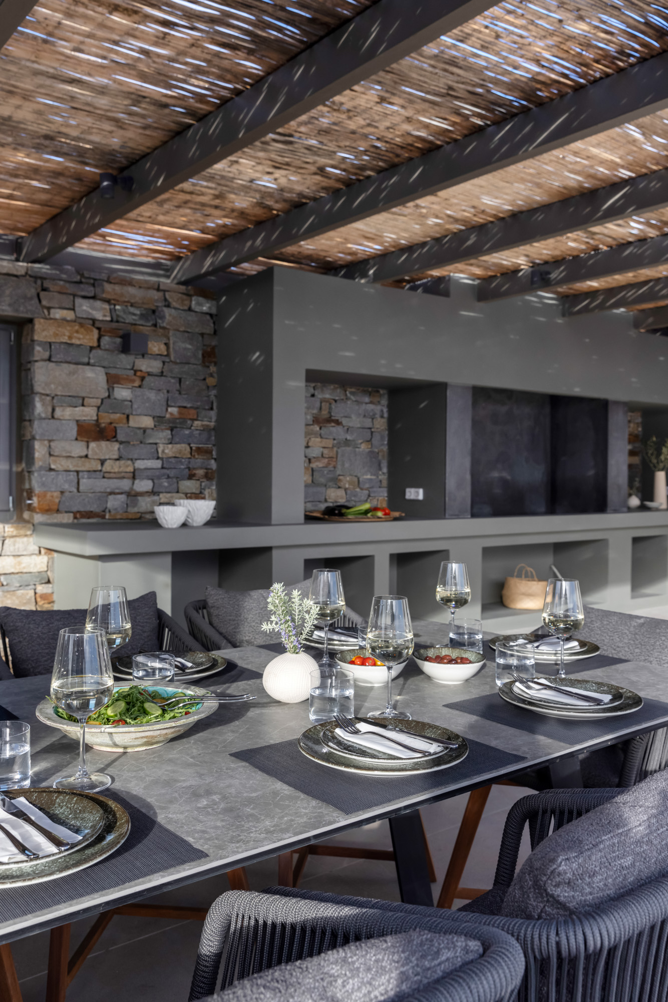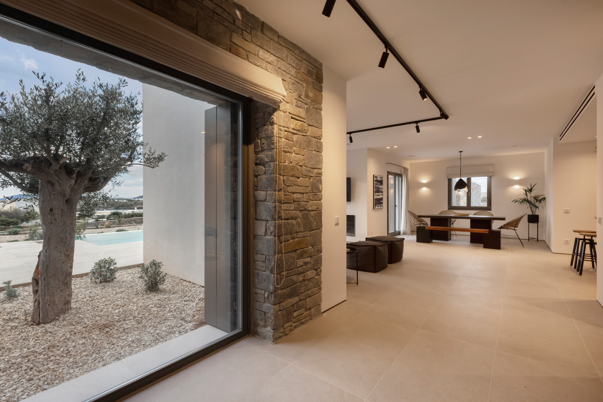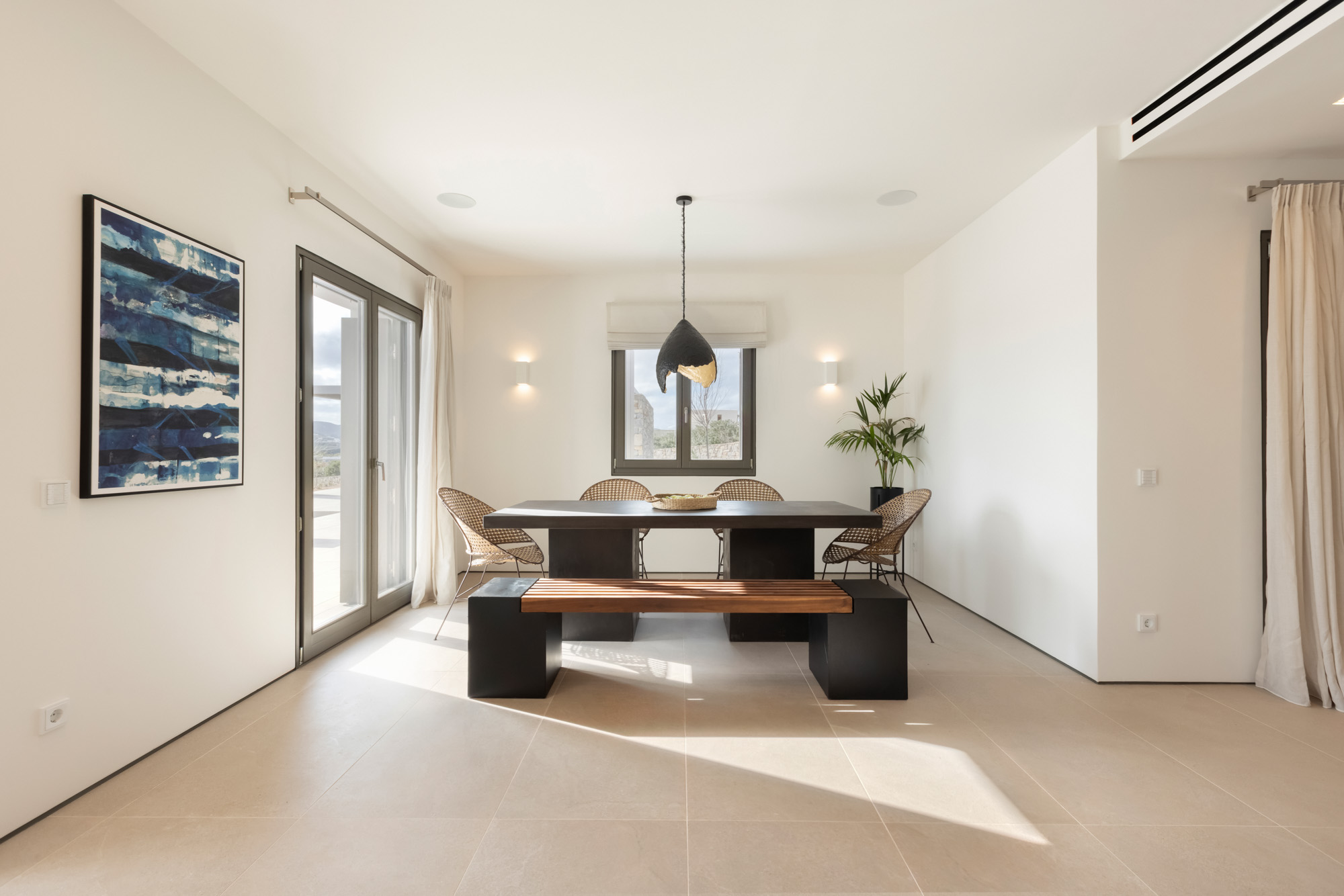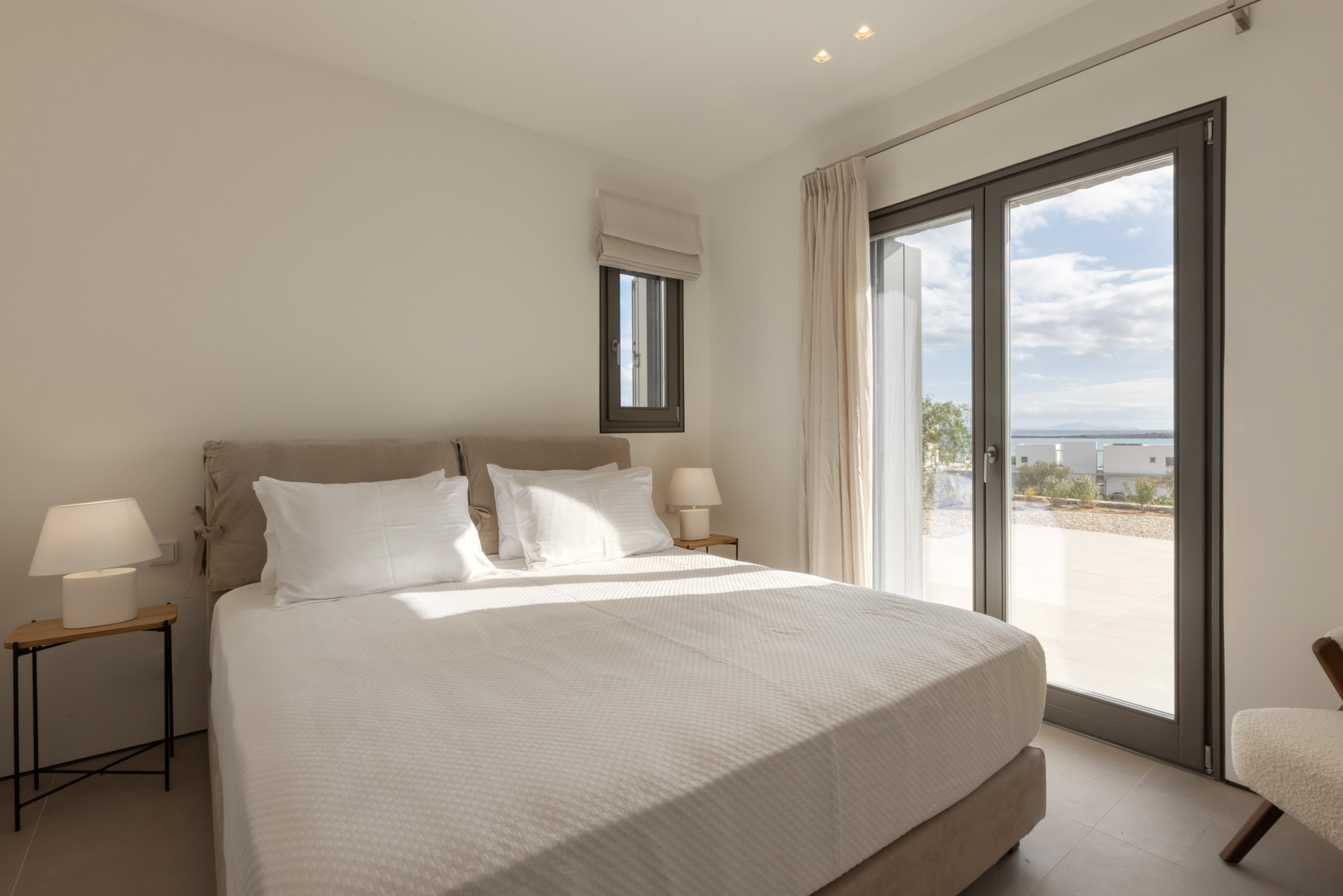 The area is complemented by a BBQ and an outdoor music system, perfect for relaxed gatherings and alfresco meals. The short walk to the beach allows guests to enjoy the sea at any time of day, while the overall design encourages a seamless flow between indoor comfort and outdoor leisure, ideal for enjoying the Paros lifestyle.
