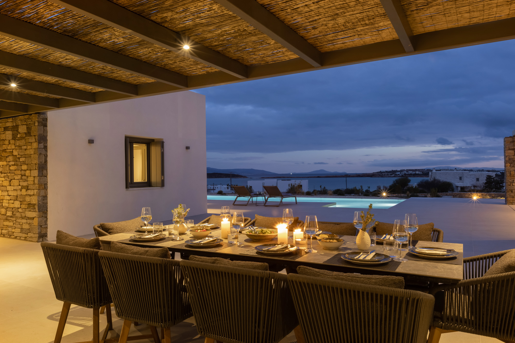 Savour Paros’s finest restaurants and bars along Santa Maria Beach, just minutes from the villa. The picturesque village of Naousa is only a 10-minute drive away, offering a vibrant mix of traditional tavernas, chic restaurants, boutiques and a lively harbour. Paros, historically known as Iliéssa, meaning “wooded,” remains rich in natural beauty, with cedar, cypress, pine, fig and olive trees shaping the island’s distinctive landscape.