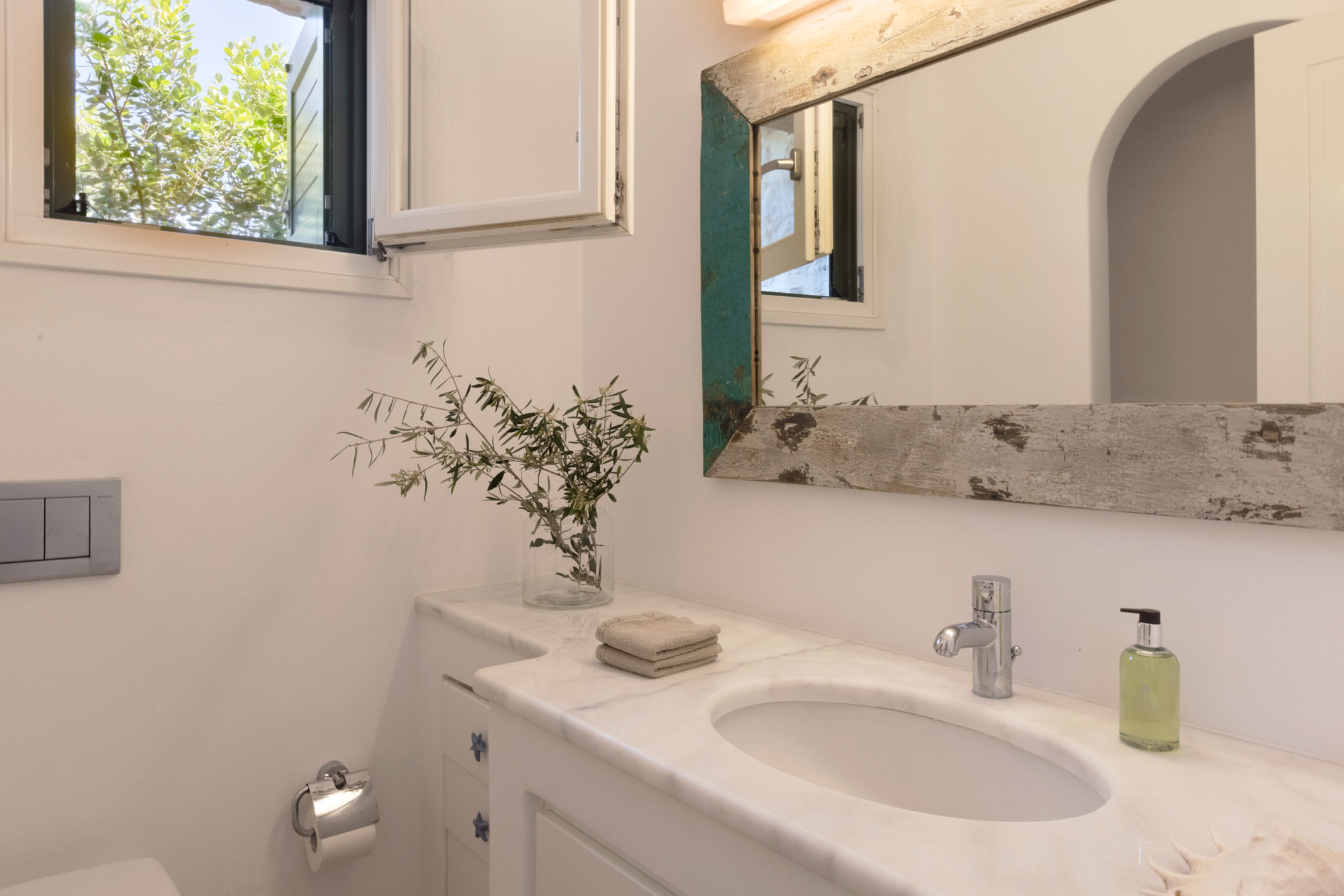 The main house is arranged over three levels and features four bedrooms. The entire first floor is dedicated to a spacious double bedroom, complete with its own sitting area and a shaded balcony with sea views. On the ground floor, two further bedrooms join a split-level living area that opens directly onto the main terrace, enhancing the sense of indoor–outdoor living. The lower ground floor hosts an additional bedroom, as well as a cosy reading room and a TV room, ideal for quiet moments or family relaxation. The separate guest house comprises three bedrooms (two en suite), offering additional privacy and comfort for guests. During peak season, both houses are rented together, while in quieter months the main house alone can be taken, accommodating up to eight guests.