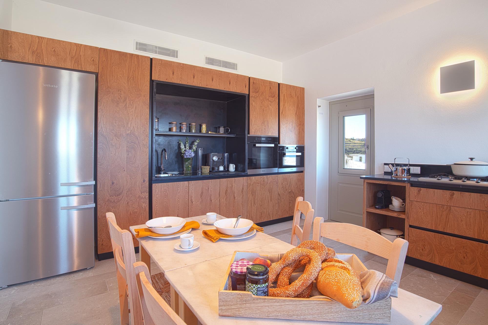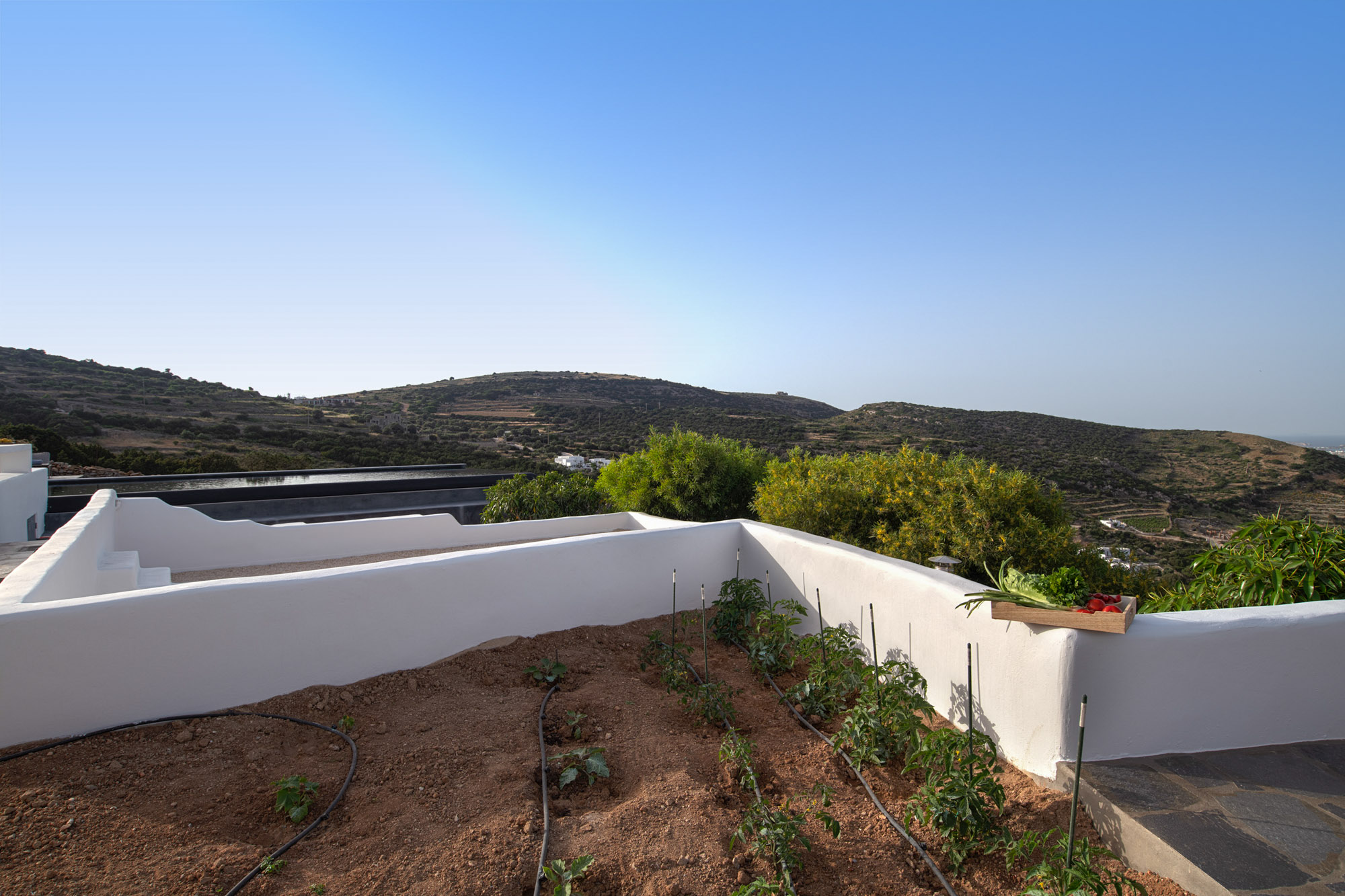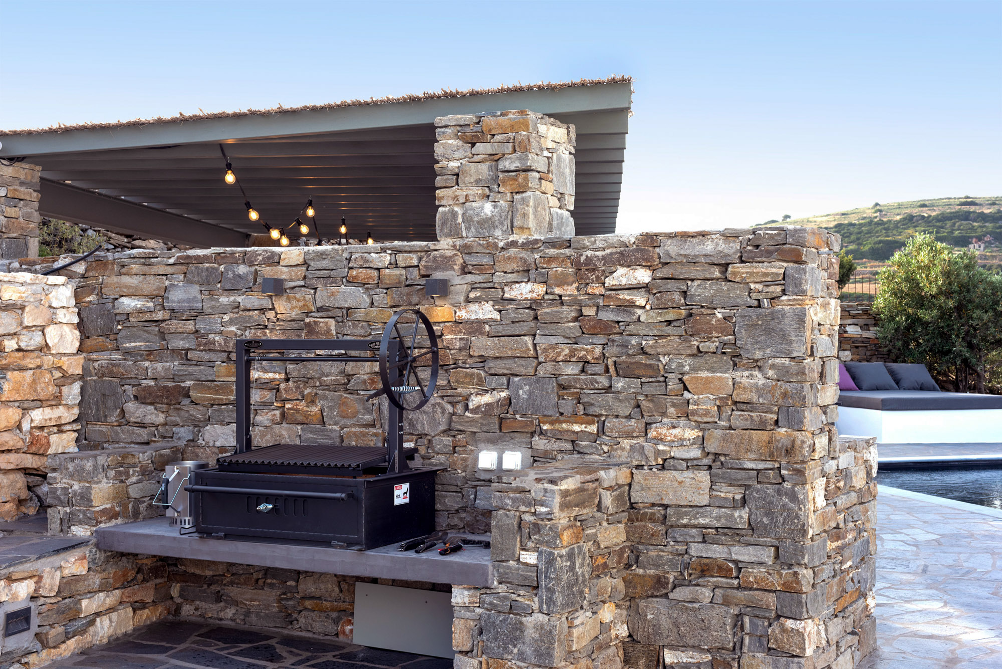 The terrace is complemented by a fully equipped outdoor kitchen and BBQ area, perfect for alfresco dining. Beyond the main terrace, the grounds unfold into secluded corners ideal for quiet reading or afternoon naps, while an orchard and herb garden invite guests to pick fresh fruit, vegetables and herbs in season. With its thoughtful landscaping, generous outdoor living spaces, and uninterrupted views, the exterior of Villa Orian offers an immersive Paros experience.