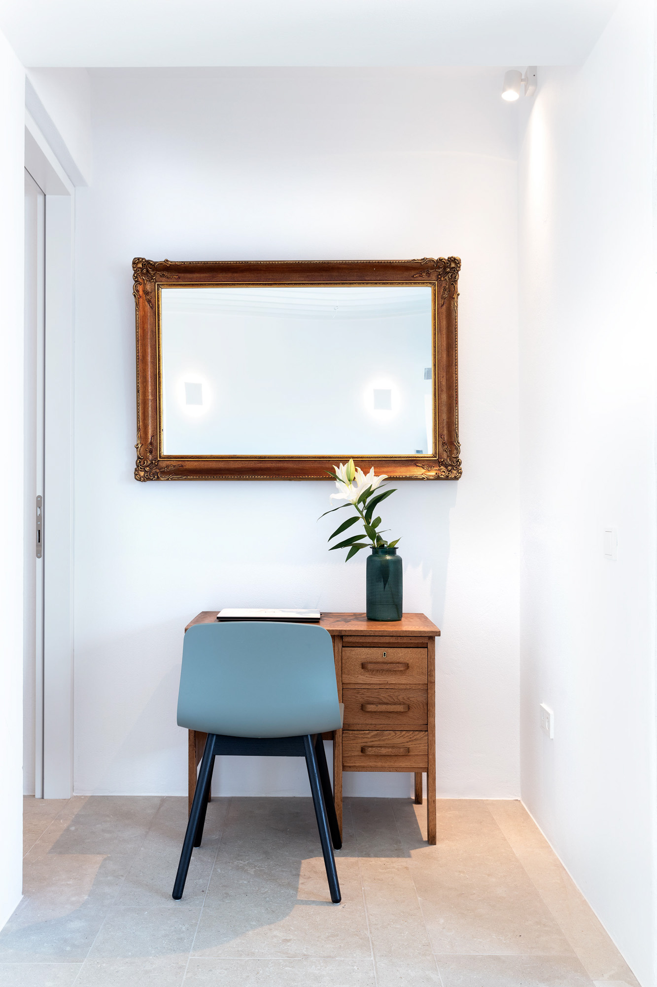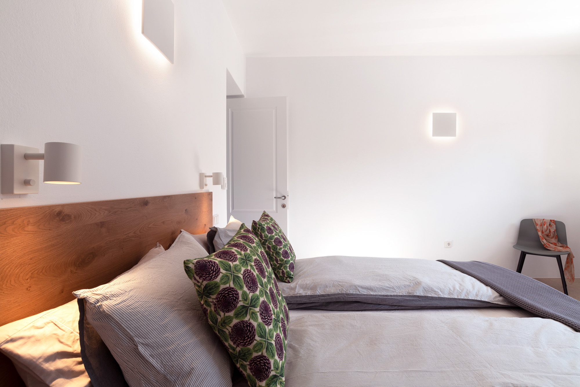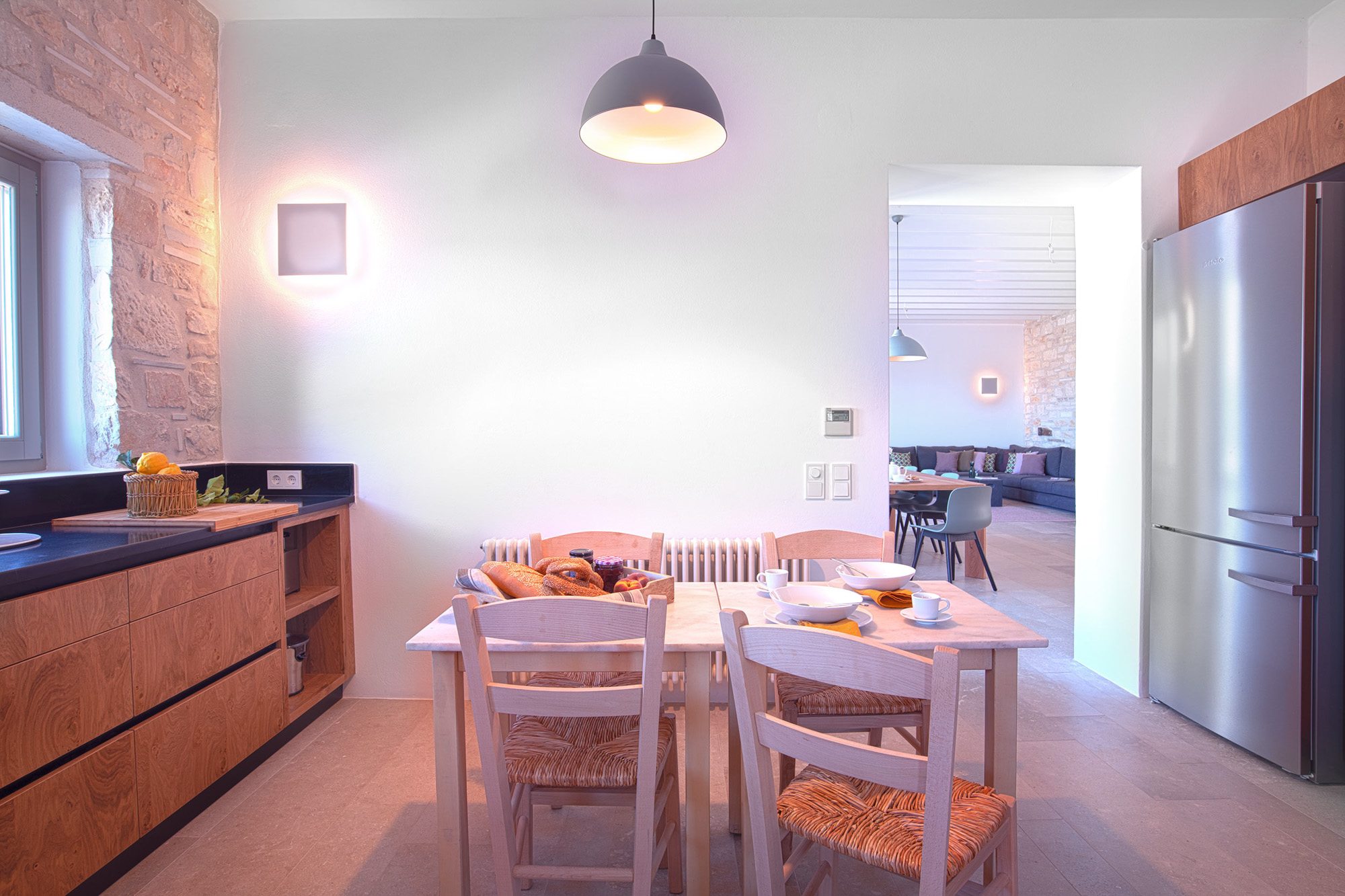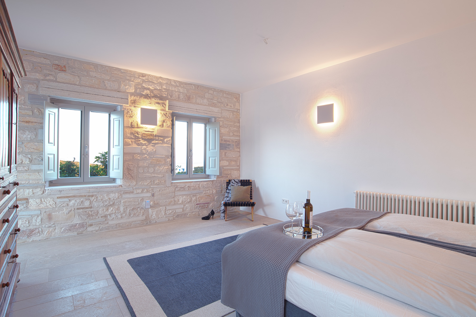 The terrace is complemented by a fully equipped outdoor kitchen and BBQ area, perfect for alfresco dining. Beyond the main terrace, the grounds unfold into secluded corners ideal for quiet reading or afternoon naps, while an orchard and herb garden invite guests to pick fresh fruit, vegetables and herbs in season. With its thoughtful landscaping, generous outdoor living spaces, and uninterrupted views, the exterior of Villa Orian offers an immersive Paros experience.