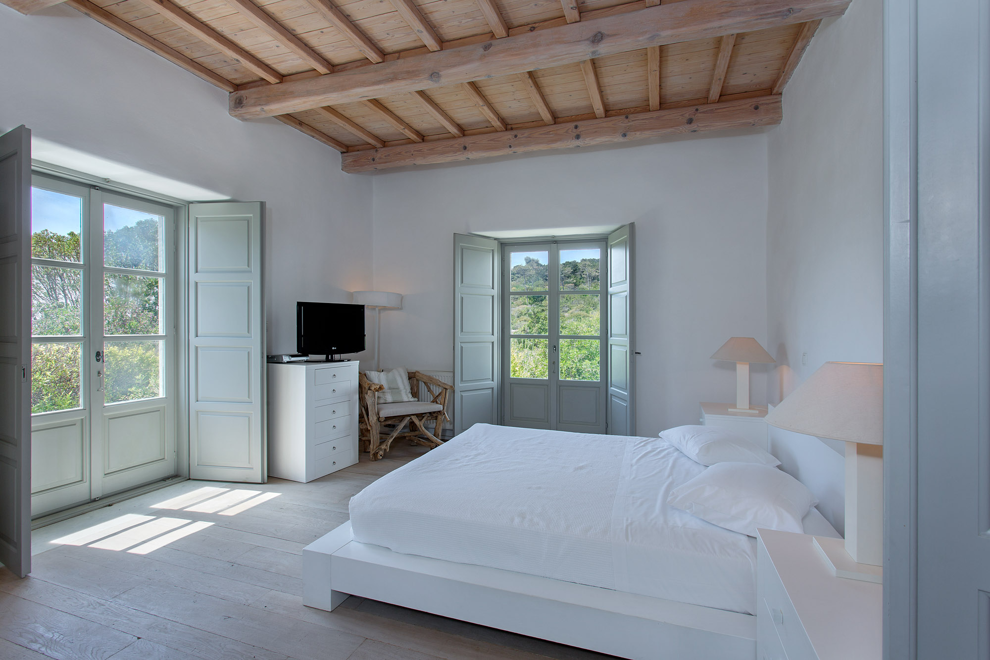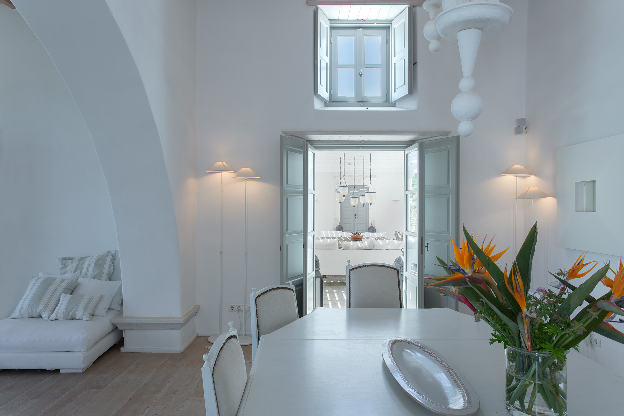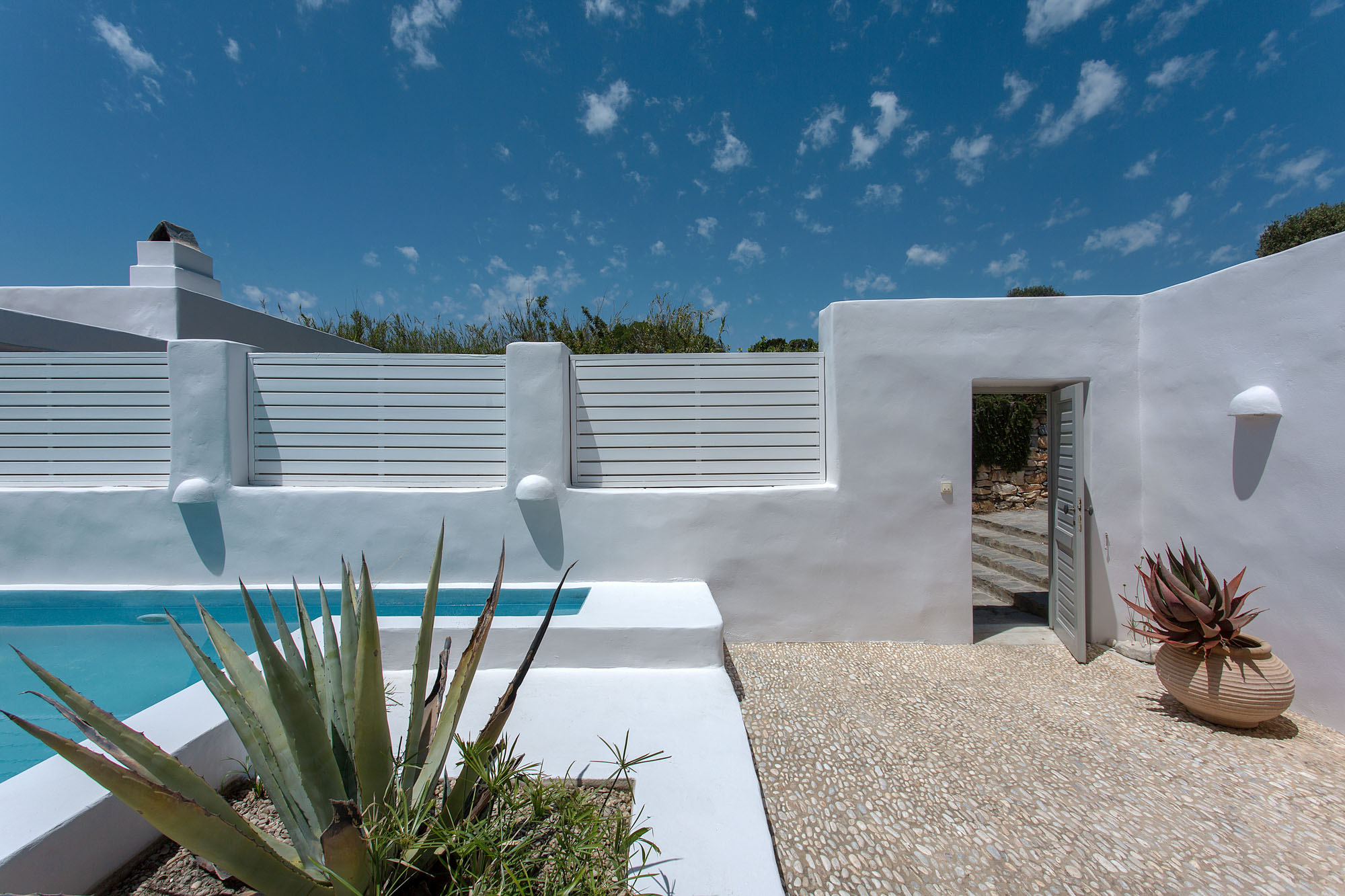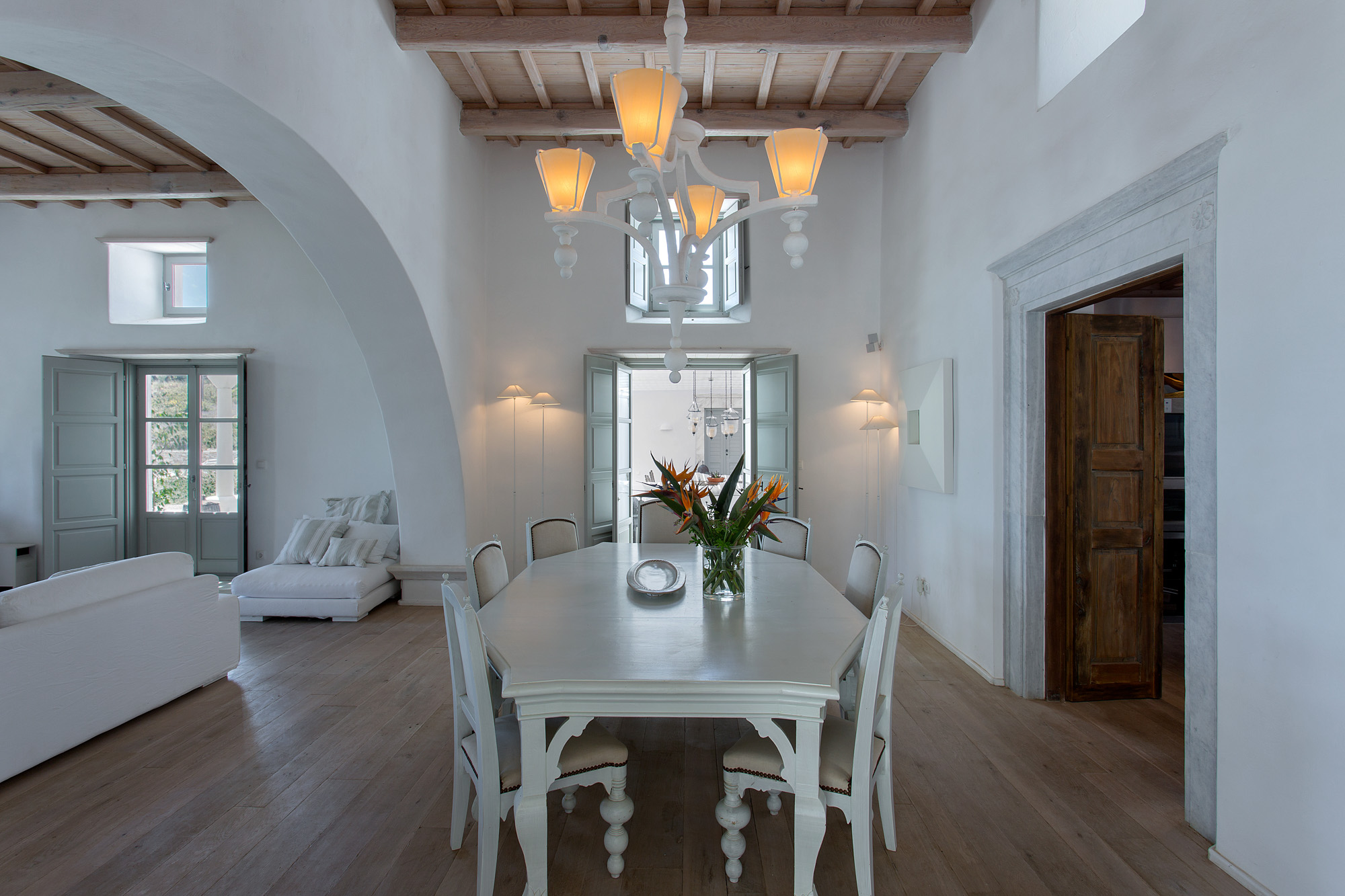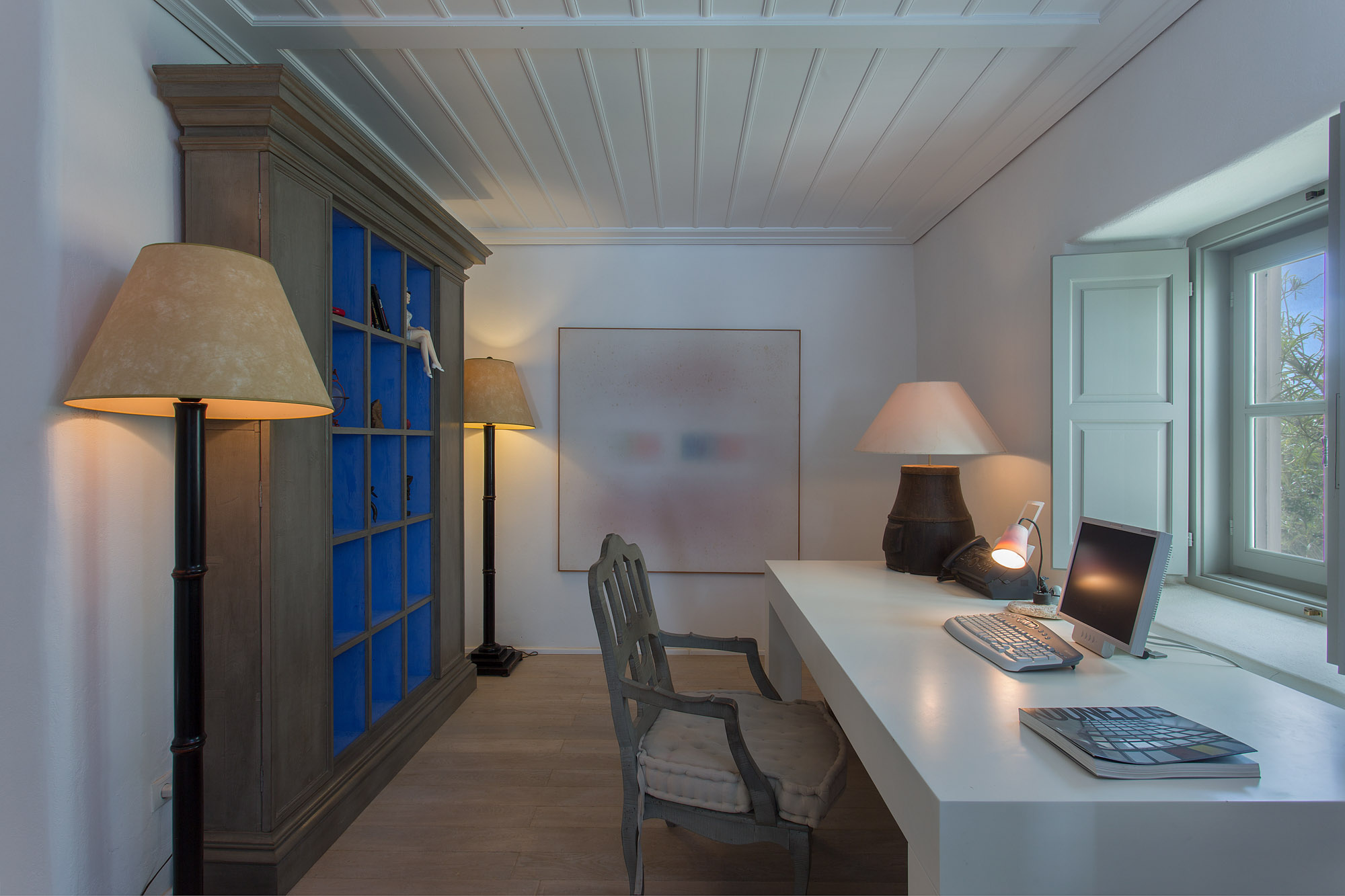 Pale oak wooden floors, elegant marble countertops, and predominantly white furnishings enhance the sense of light, calm, flowing spaces. Modern and classic pieces are paired to give a fresh but timeless aesthetic. Rooms are spread across the buildings. The main section has an airy living and dining room and a very well-equipped kitchen. An office area, master en-suite bedroom, and further bedroom with a private bathroom are in a separate building with access to the little second pool. The next three bedrooms have independent entrances, which are great for privacy.