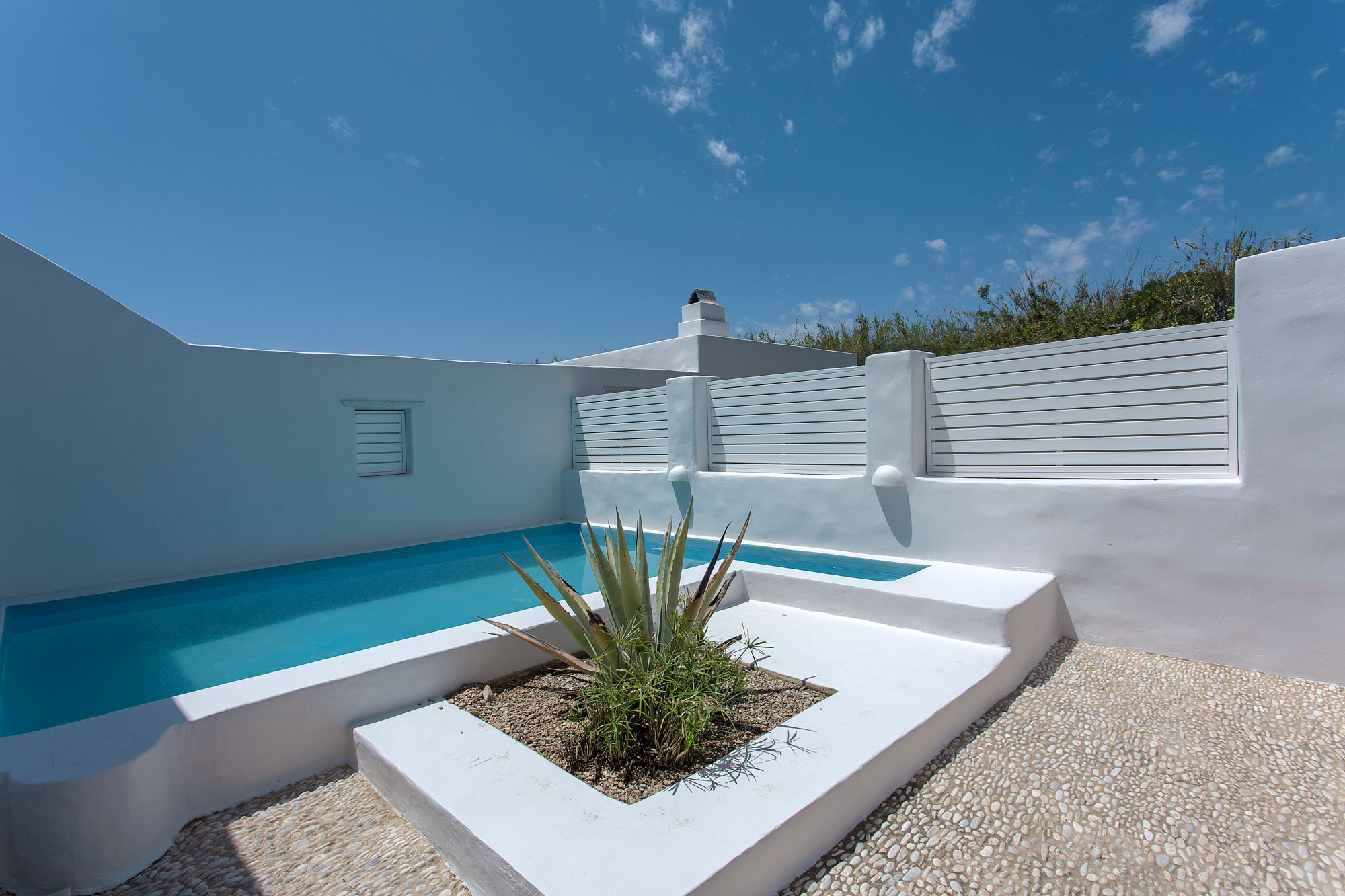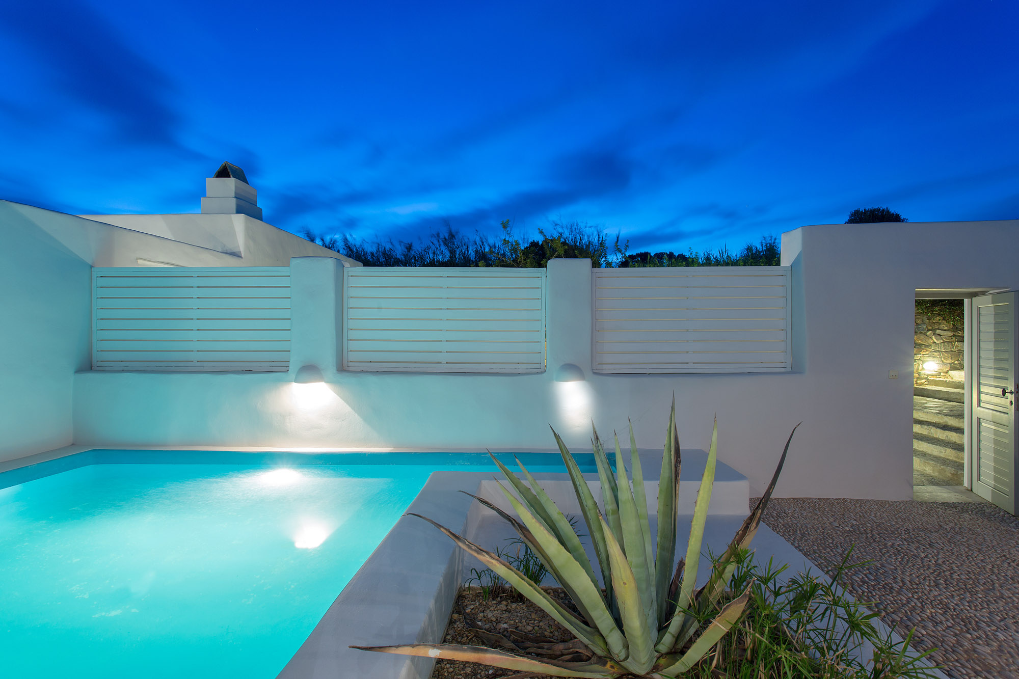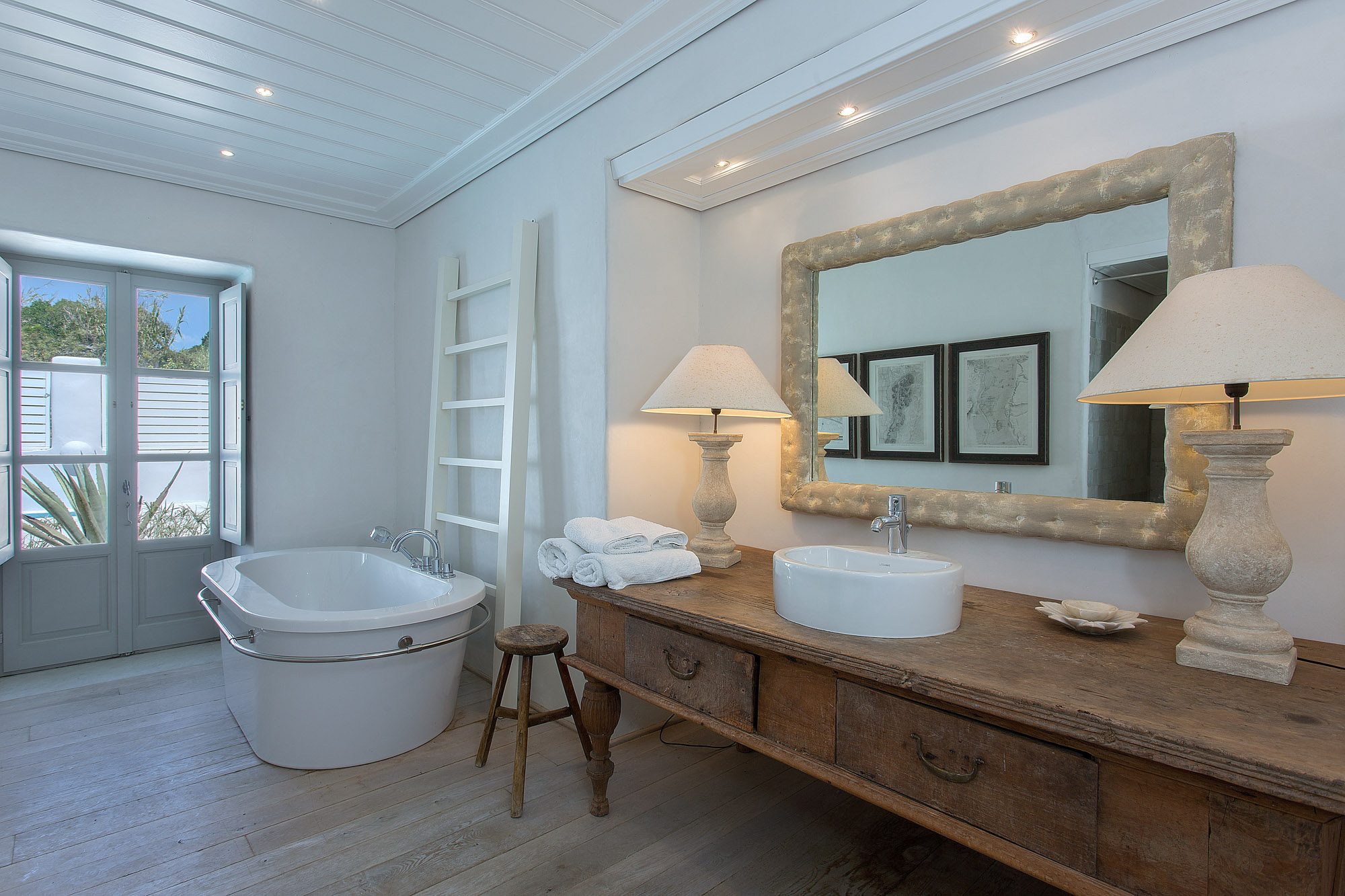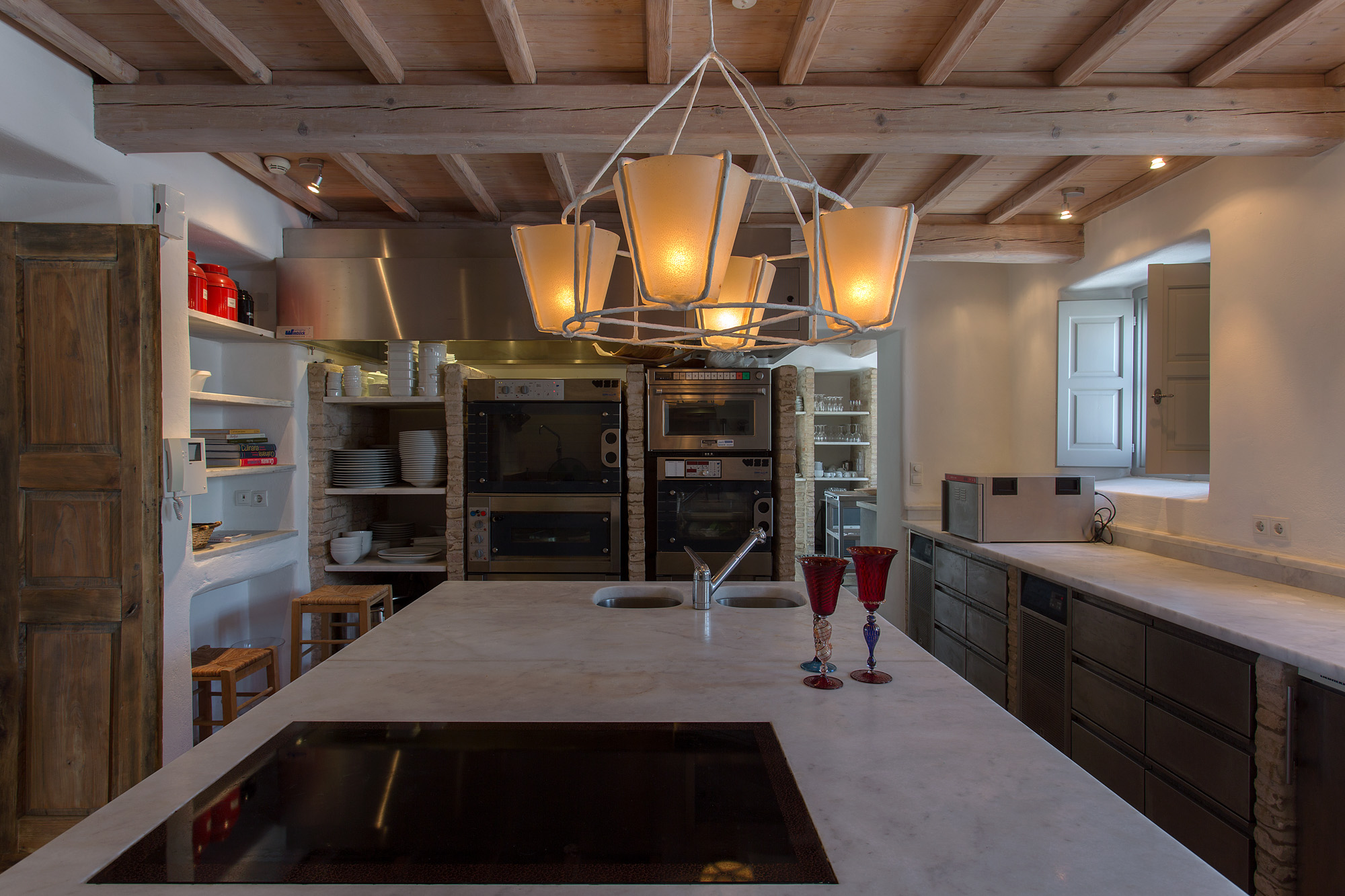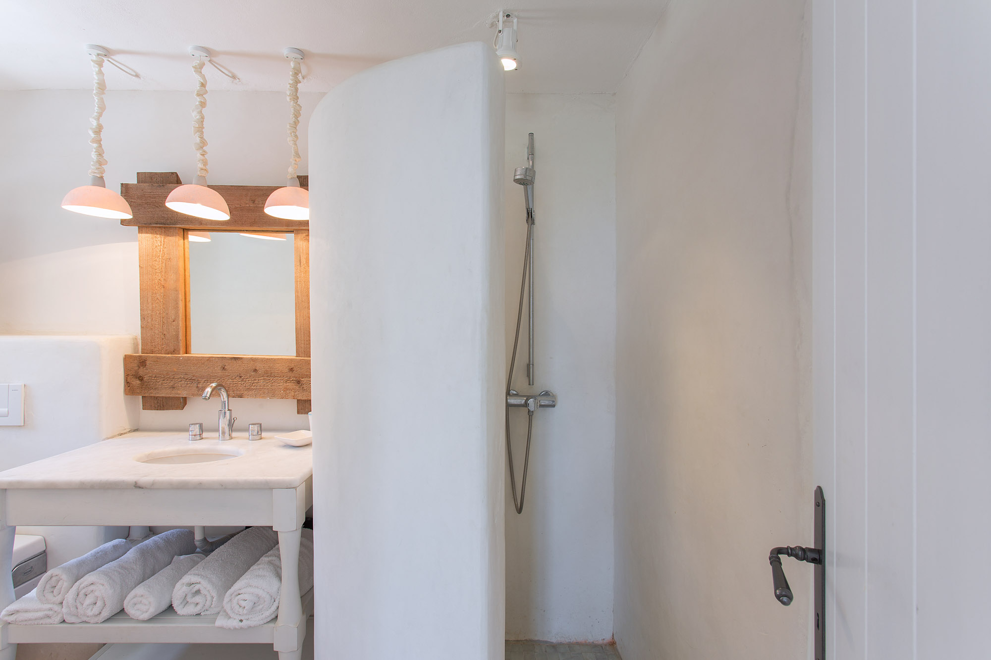 Pale oak wooden floors, elegant marble countertops, and predominantly white furnishings enhance the sense of light, calm, flowing spaces. Modern and classic pieces are paired to give a fresh but timeless aesthetic. Rooms are spread across the buildings. The main section has an airy living and dining room and a very well-equipped kitchen. An office area, master en-suite bedroom, and further bedroom with a private bathroom are in a separate building with access to the little second pool. The next three bedrooms have independent entrances, which are great for privacy.
