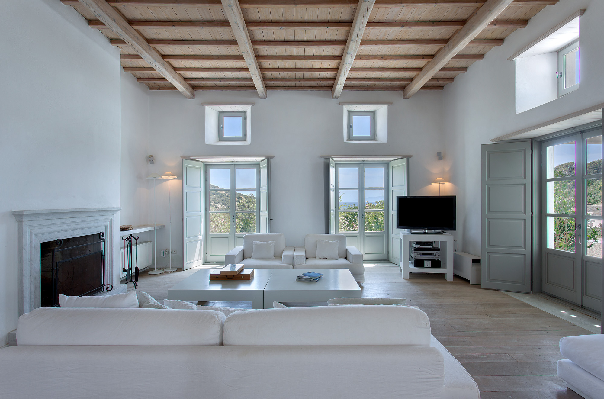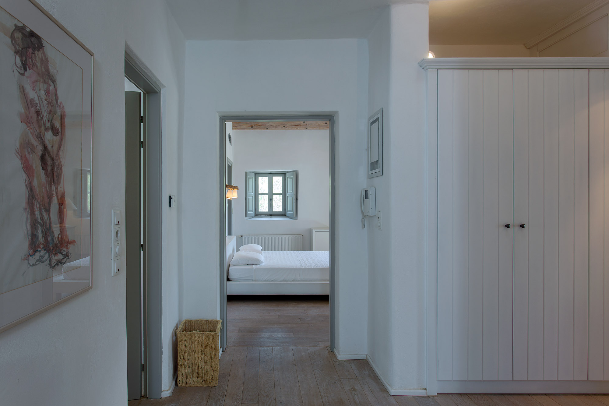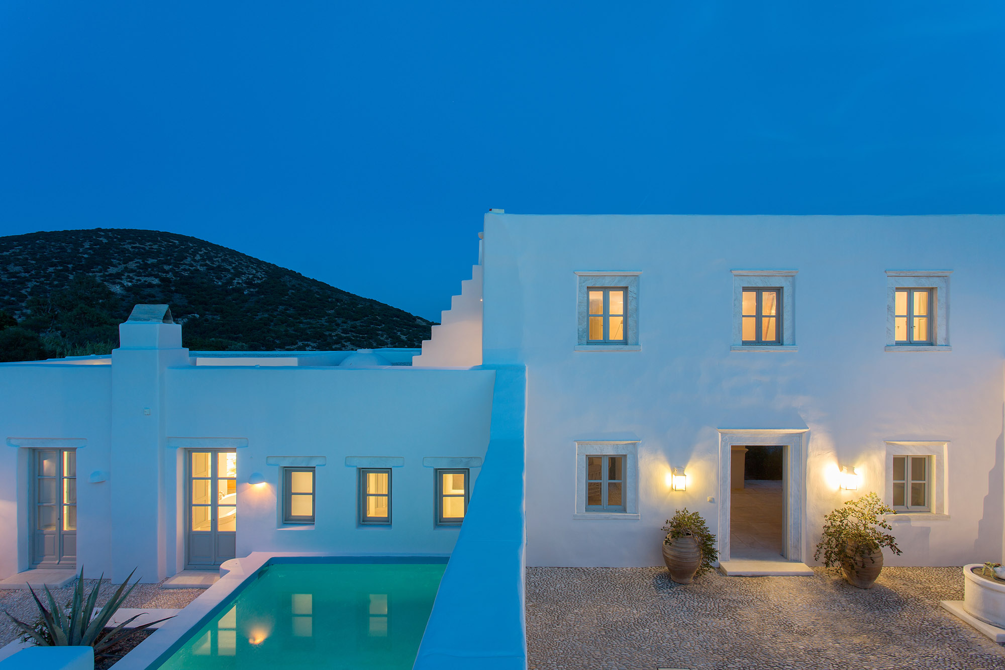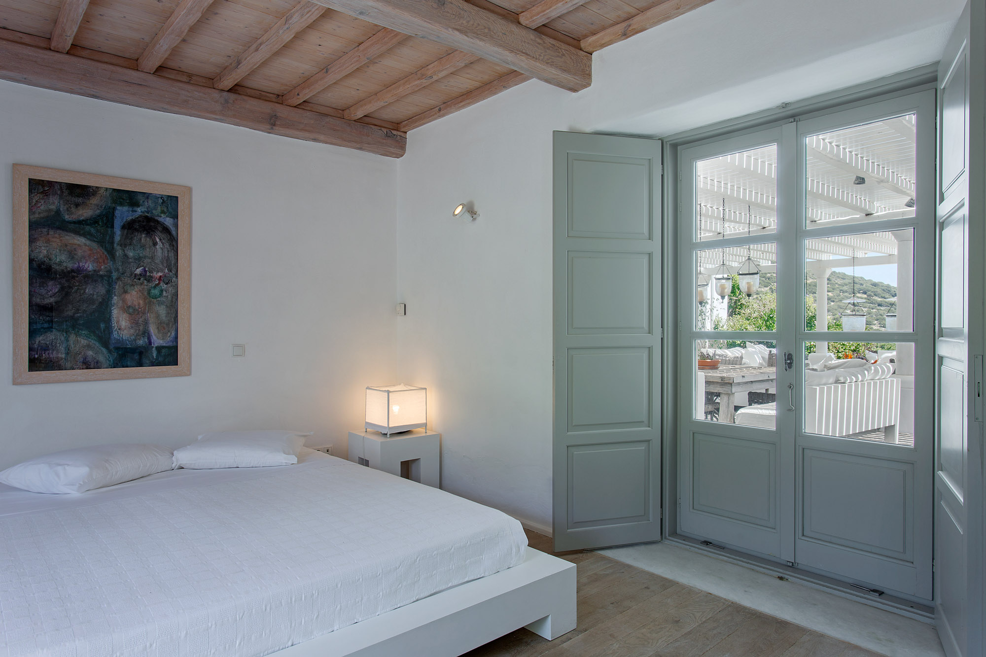 The sleek white house, surrounded by nearly six acres of land with flowers, olive, and fruit trees, looks out to the enticing waters of the Aegean. There’s lots of space, a fabulous main pool, a second smaller pool, and steps up to the roof for far-reaching views.