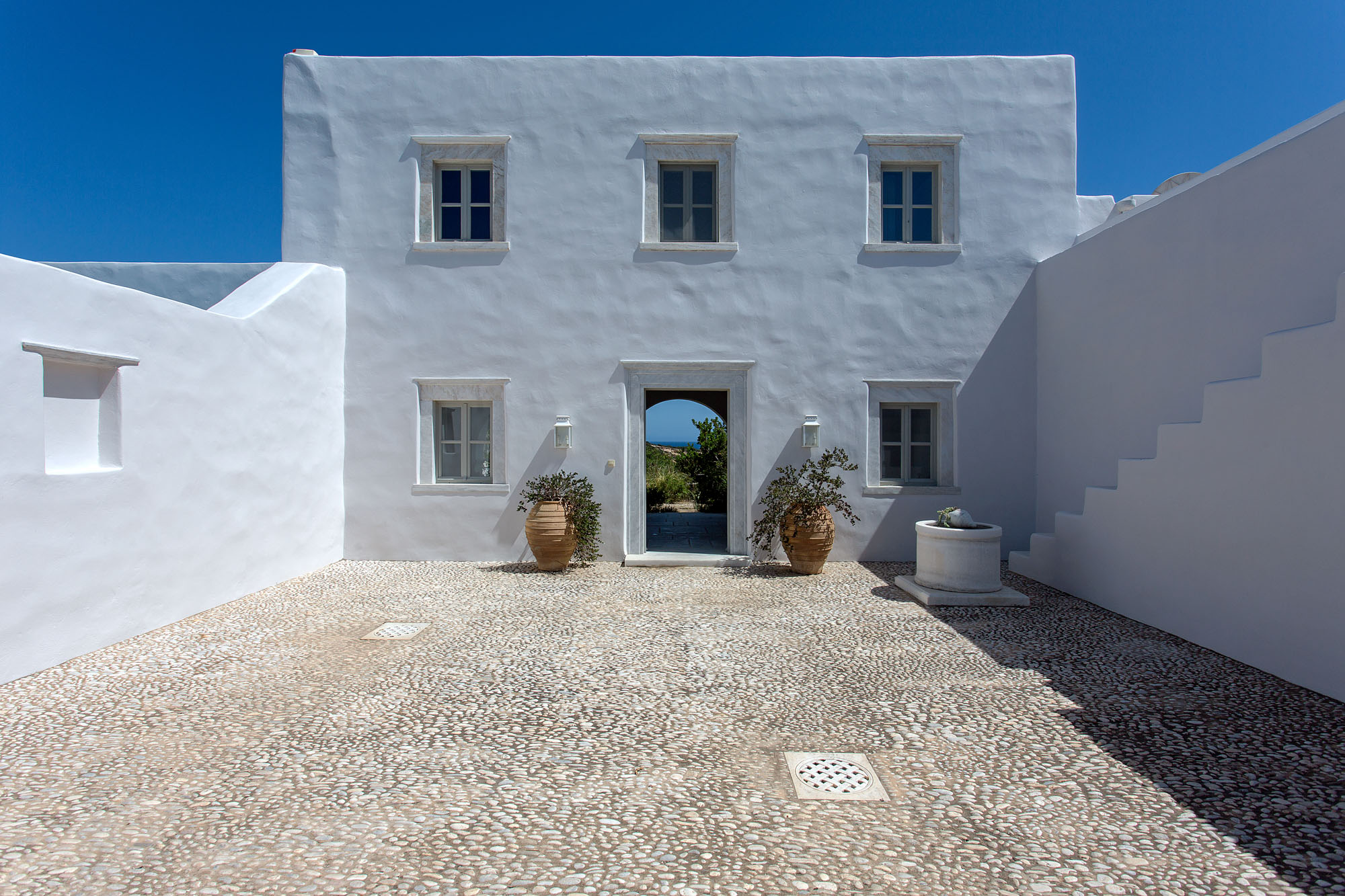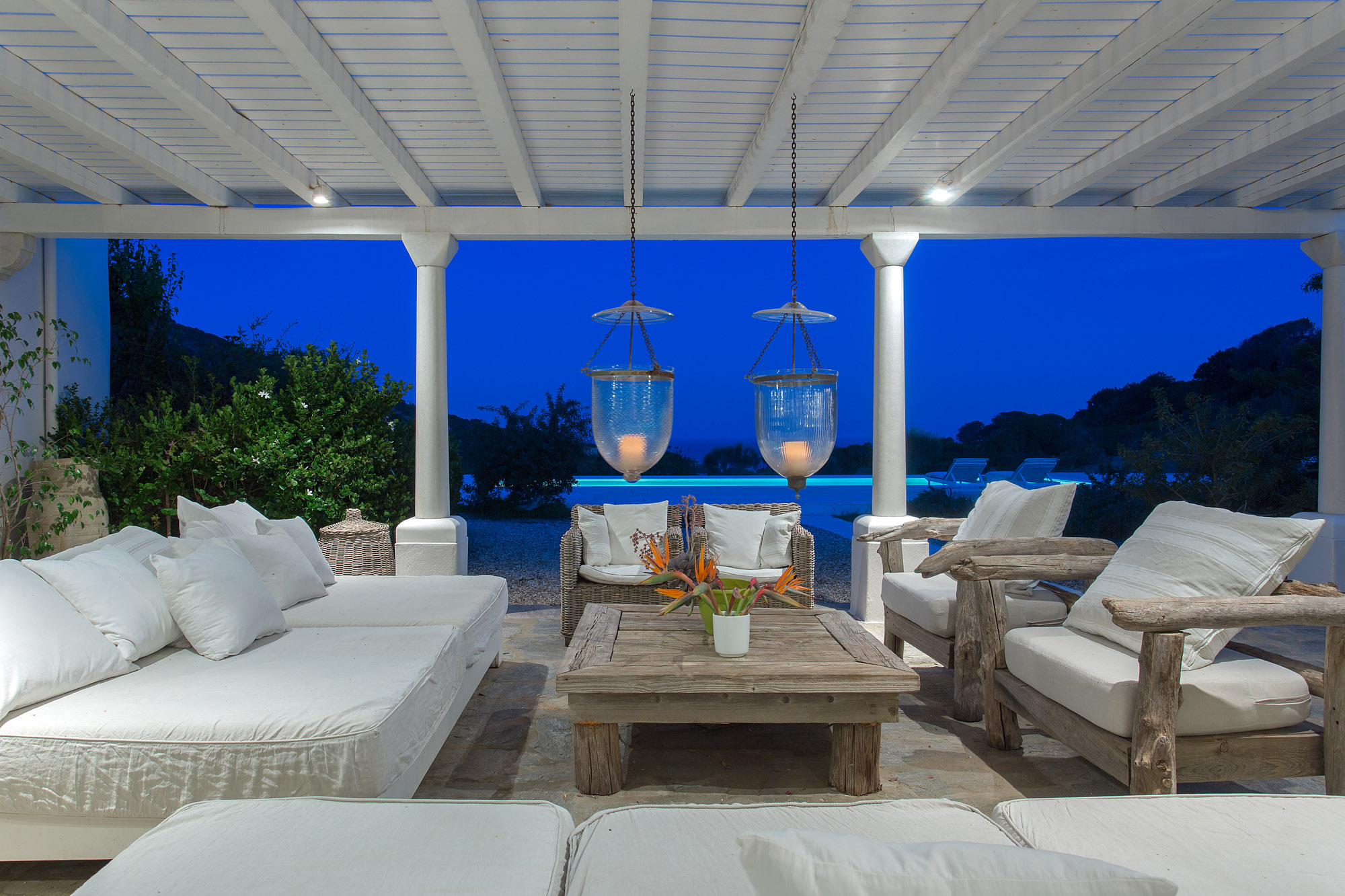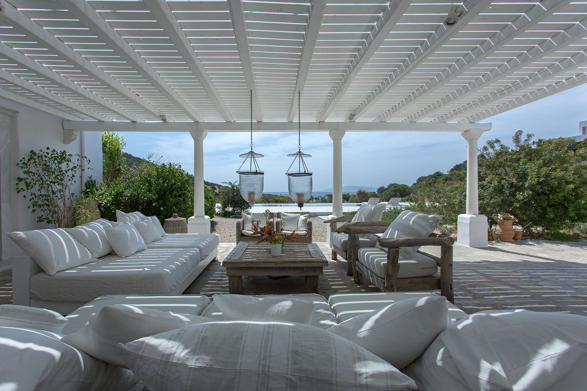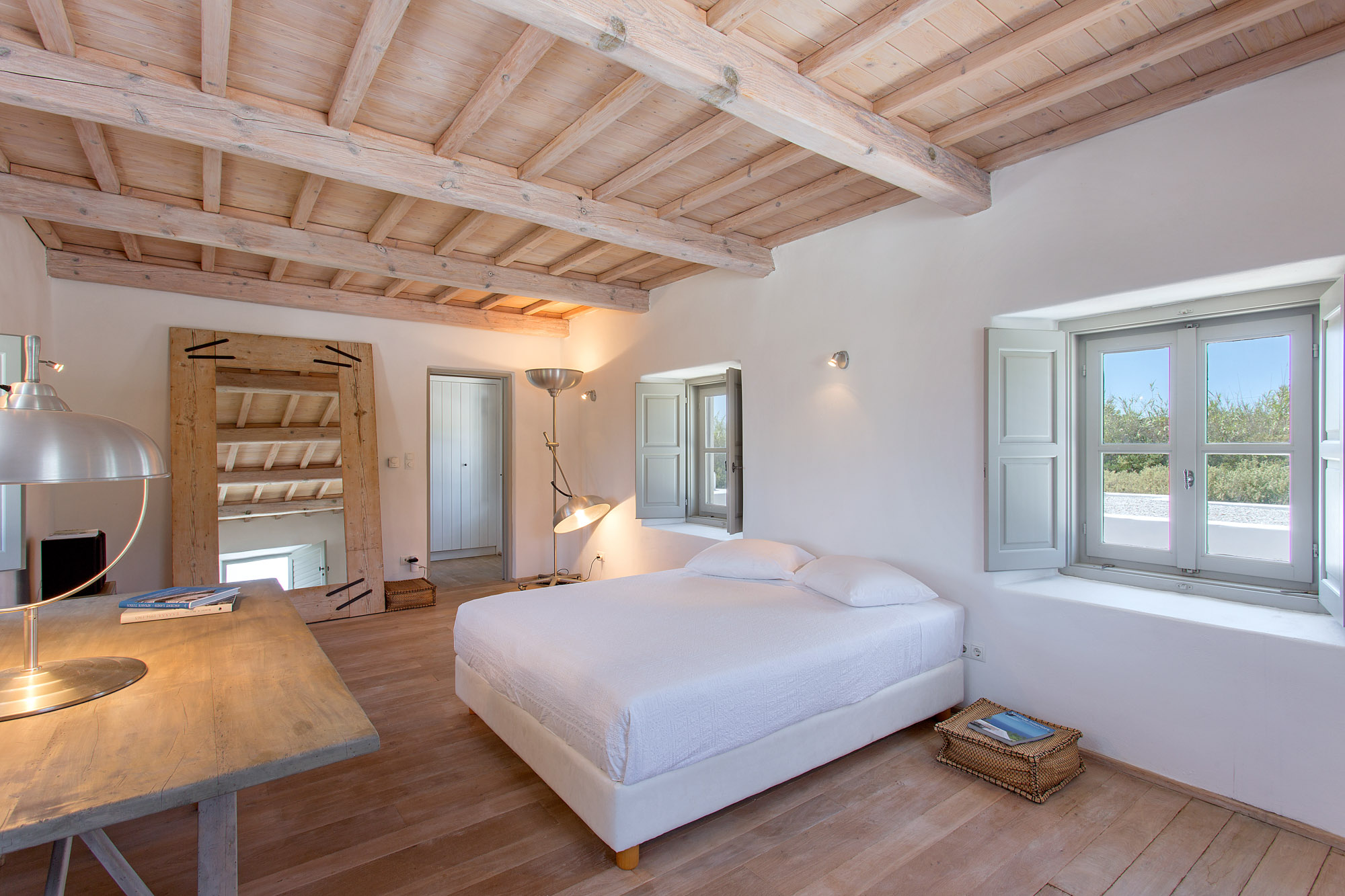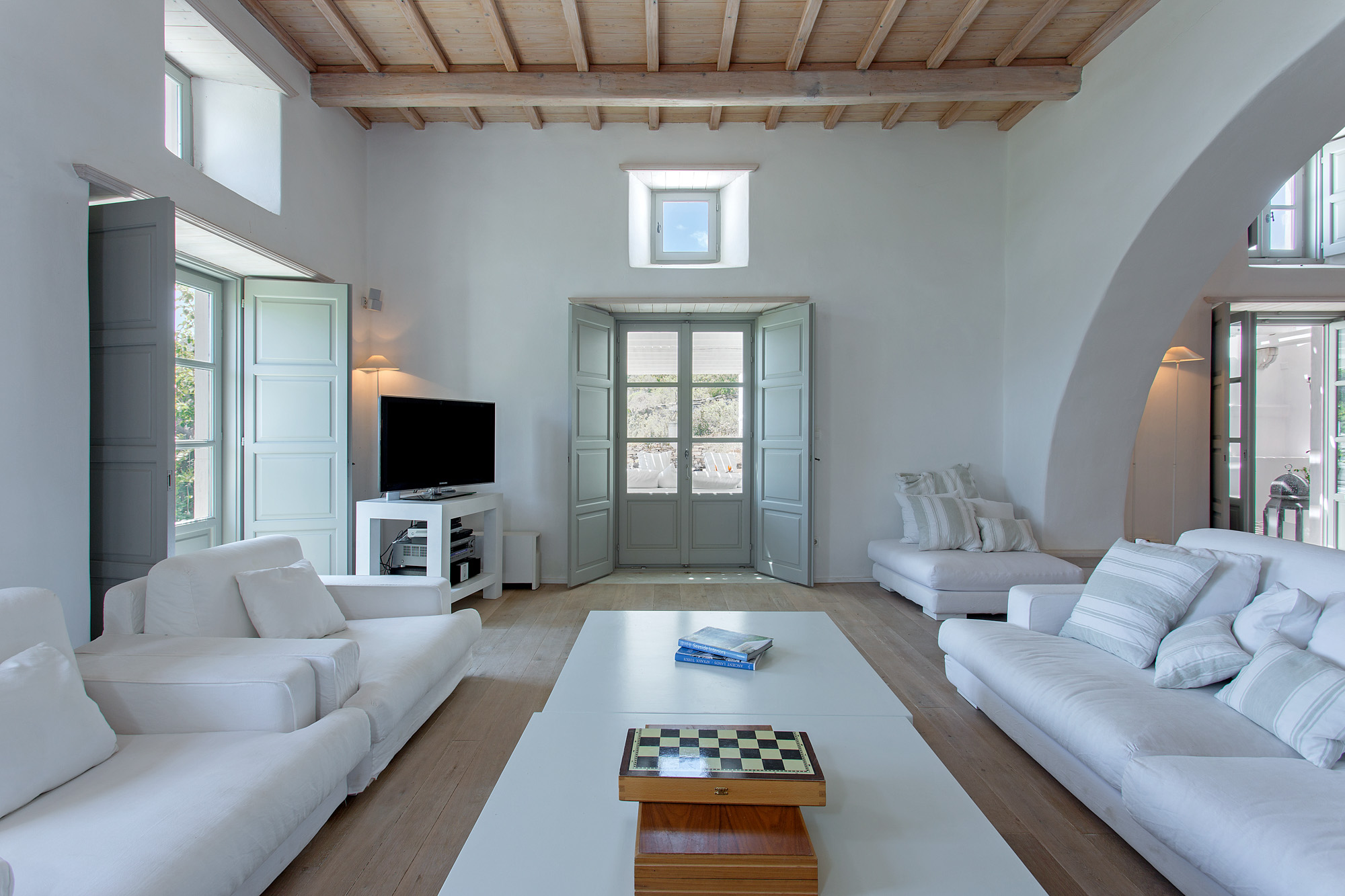 The sleek white house, surrounded by nearly six acres of land with flowers, olive, and fruit trees, looks out to the enticing waters of the Aegean. There’s lots of space, a fabulous main pool, a second smaller pool, and steps up to the roof for far-reaching views.