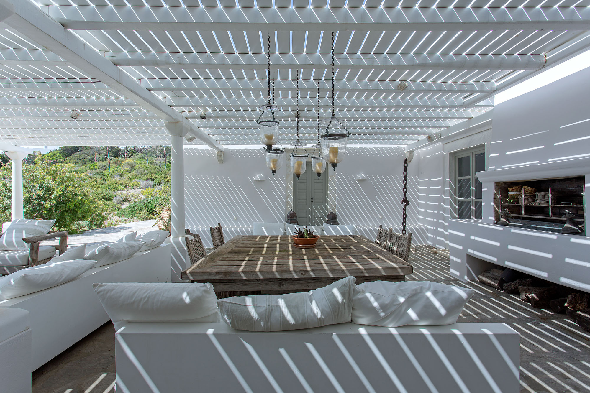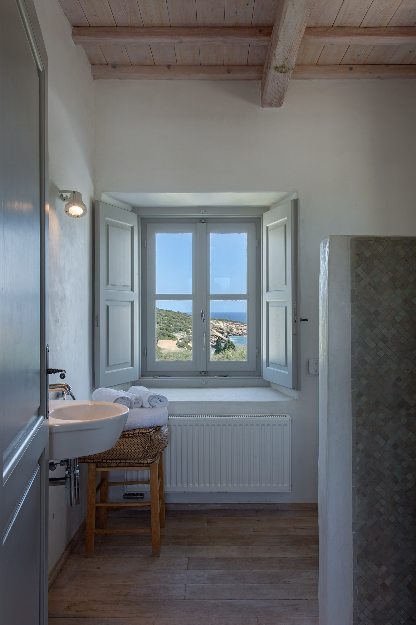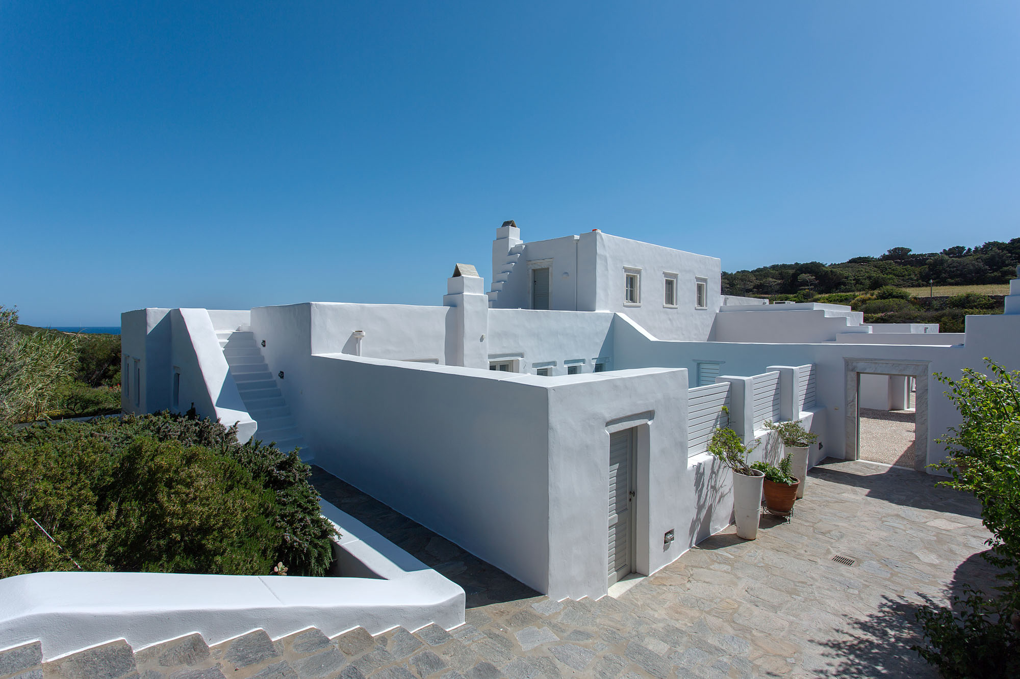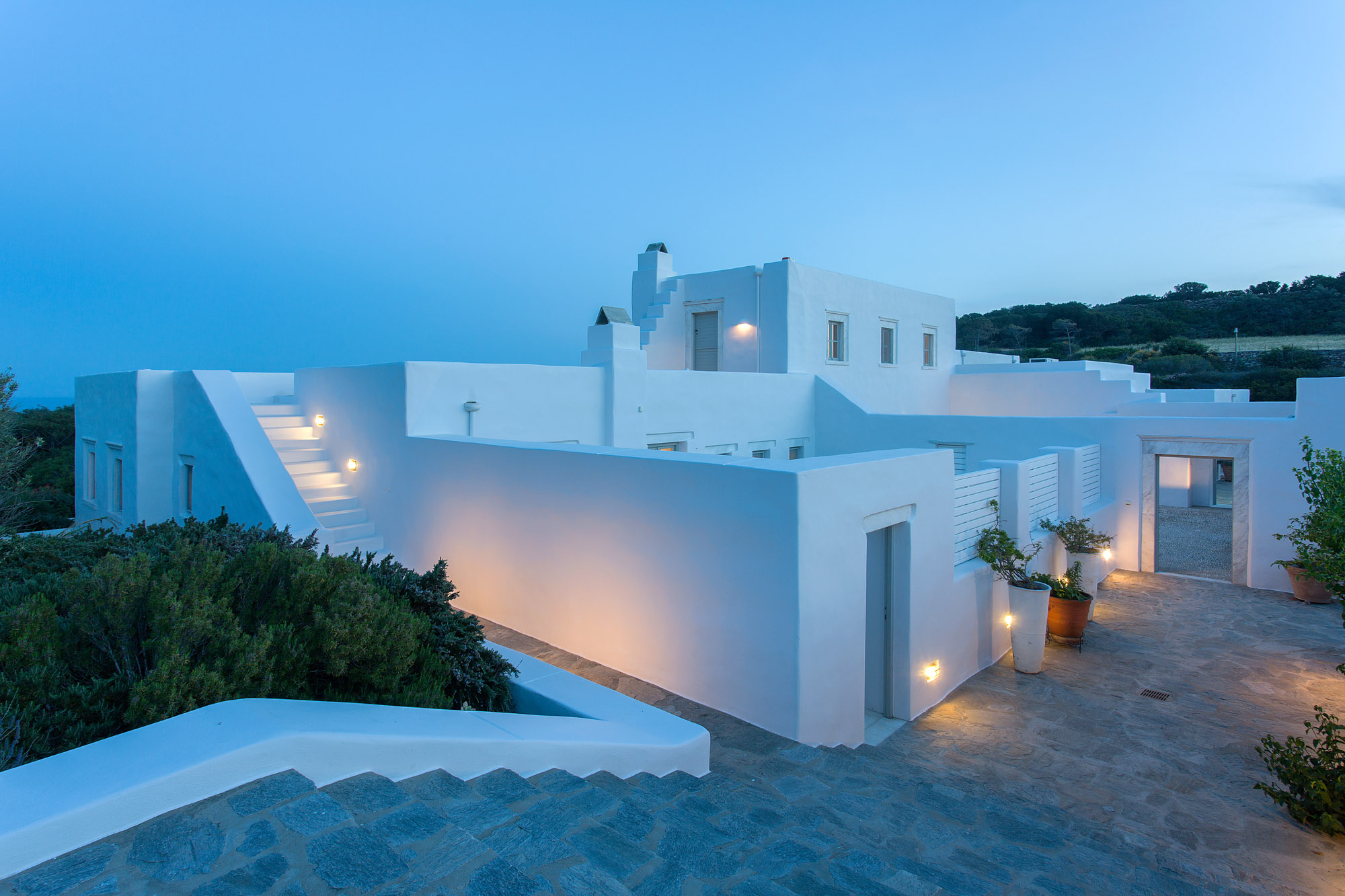 The sleek white house, surrounded by nearly six acres of land with flowers, olive, and fruit trees, looks out to the enticing waters of the Aegean. There’s lots of space, a fabulous main pool, a second smaller pool, and steps up to the roof for far-reaching views.