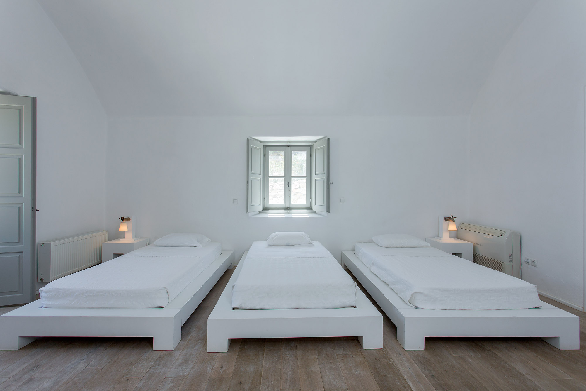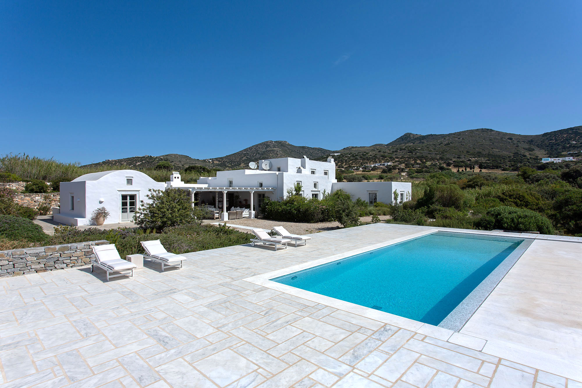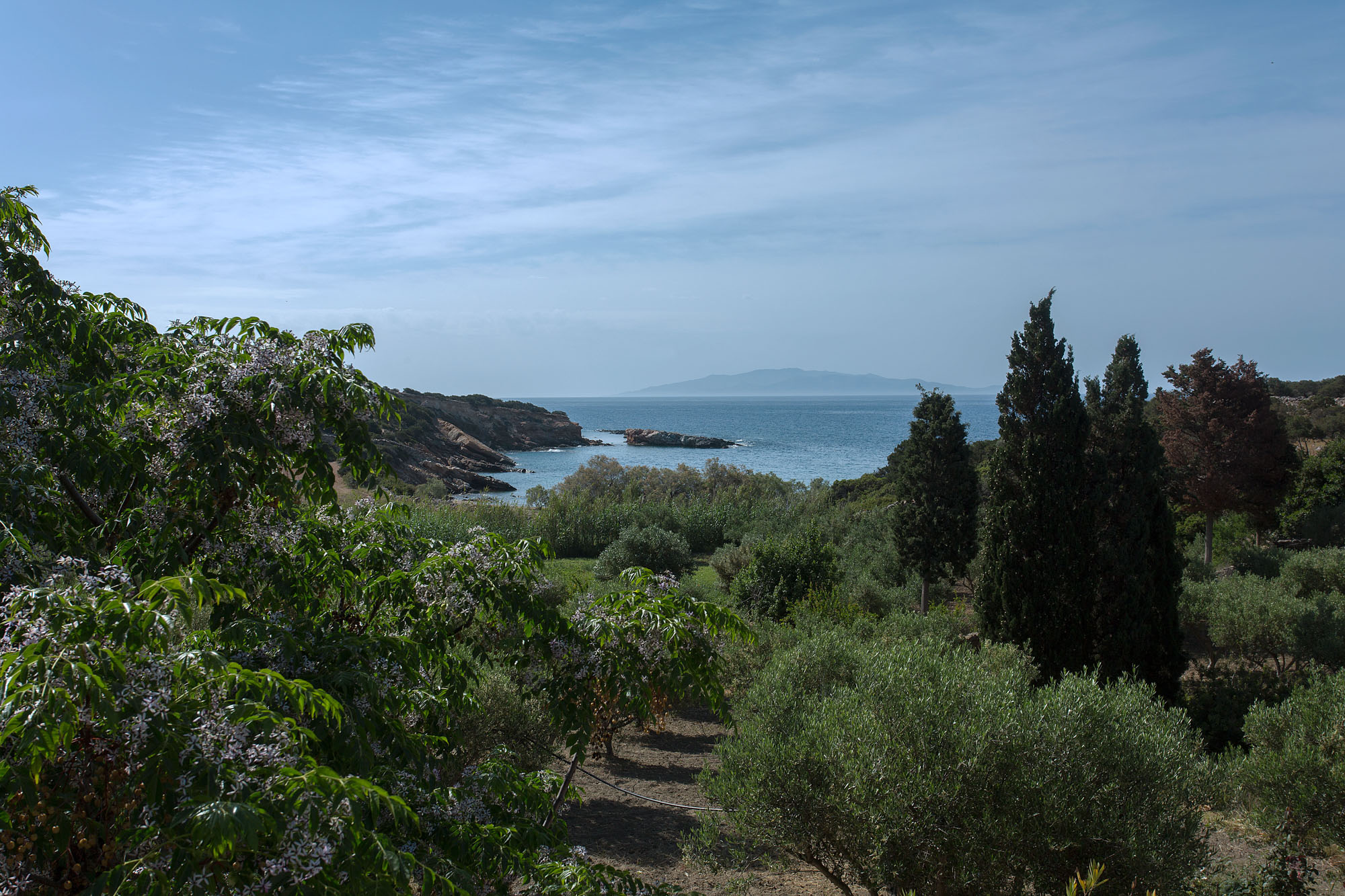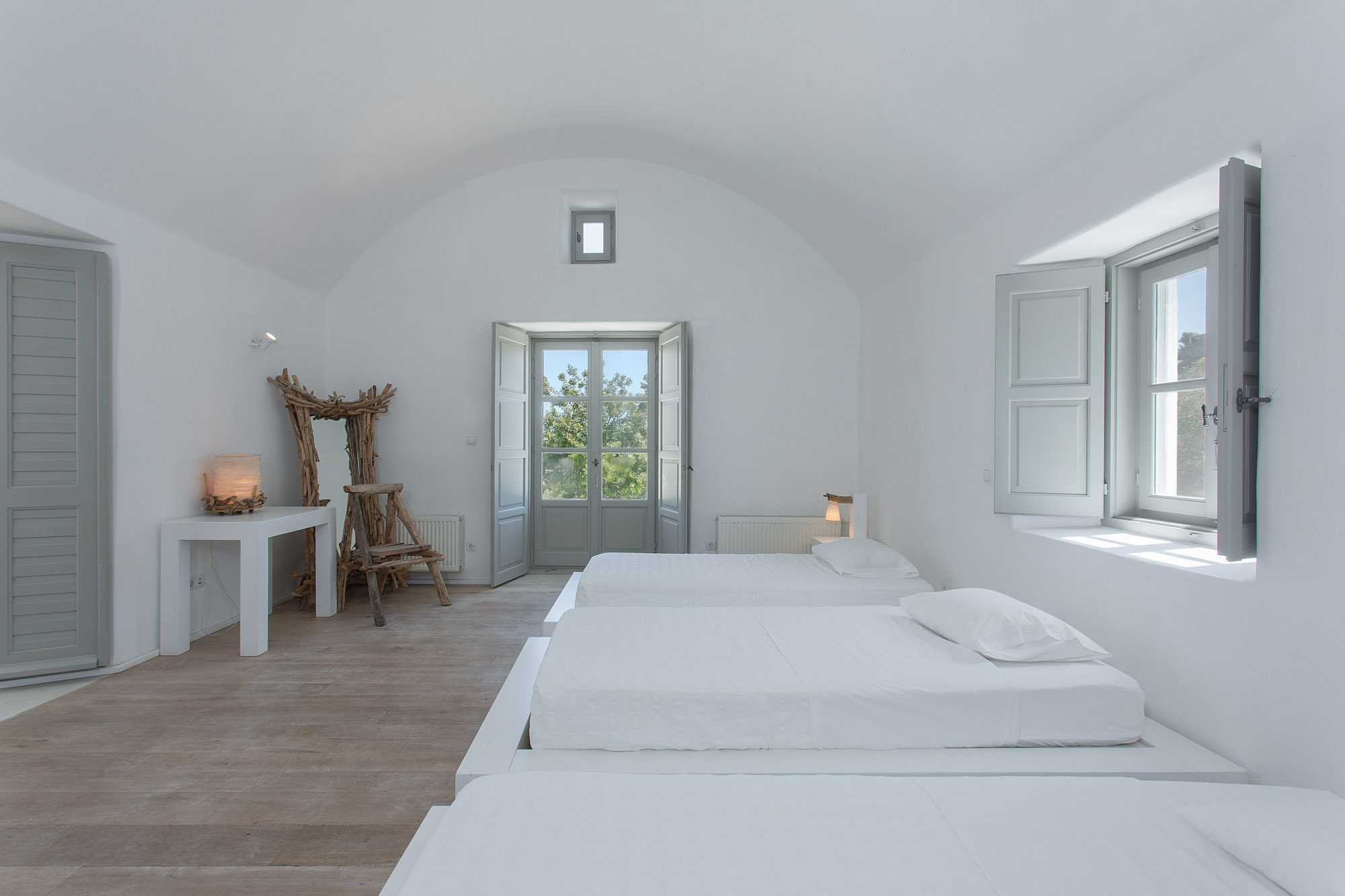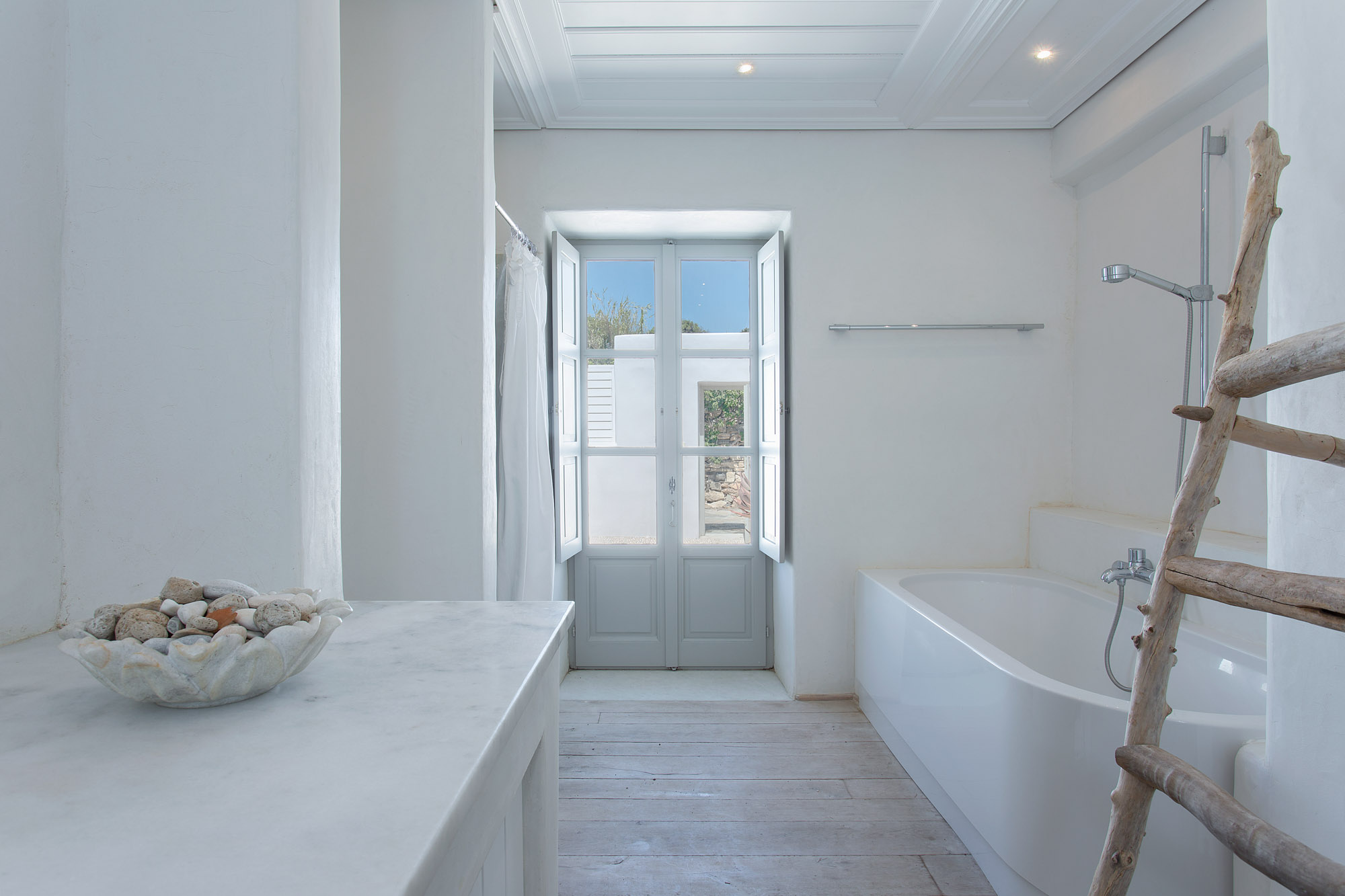 The sleek white house, surrounded by nearly six acres of land with flowers, olive, and fruit trees, looks out to the enticing waters of the Aegean. There’s lots of space, a fabulous main pool, a second smaller pool, and steps up to the roof for far-reaching views.