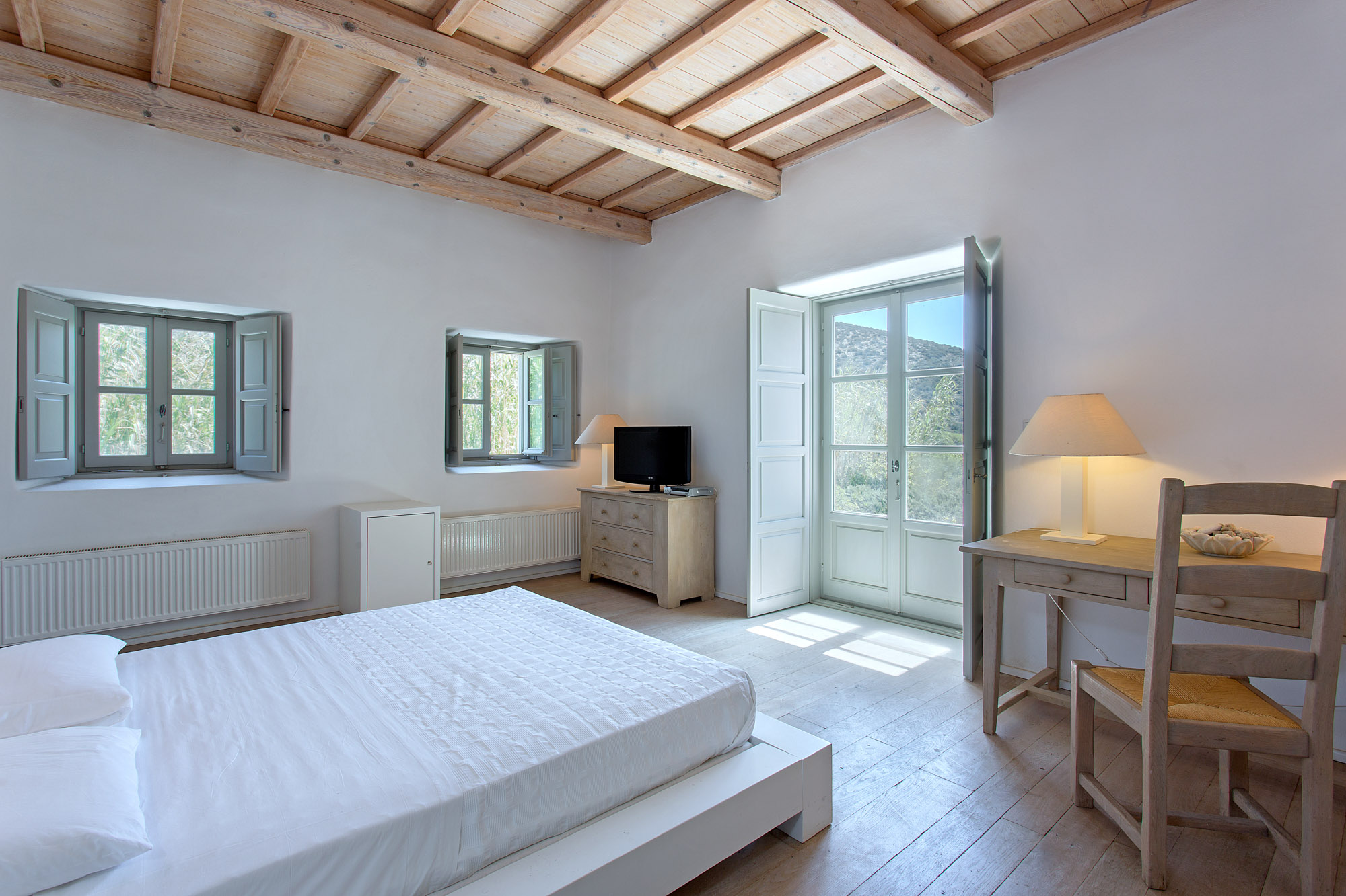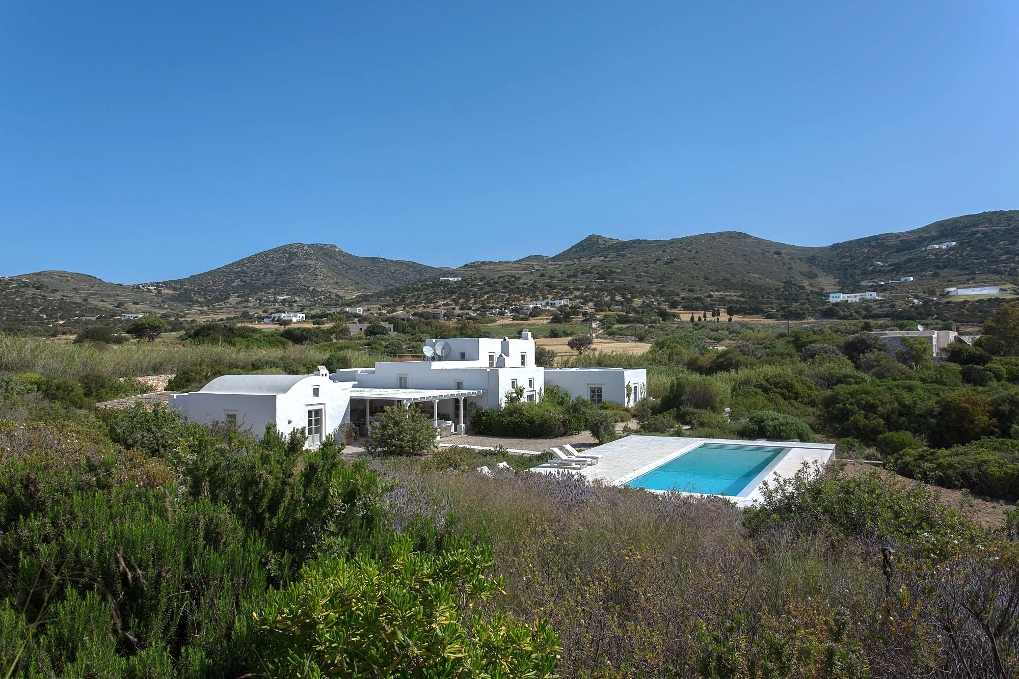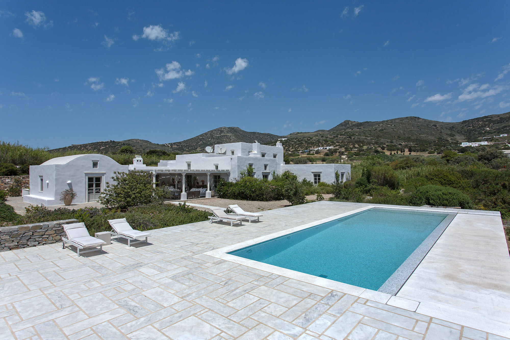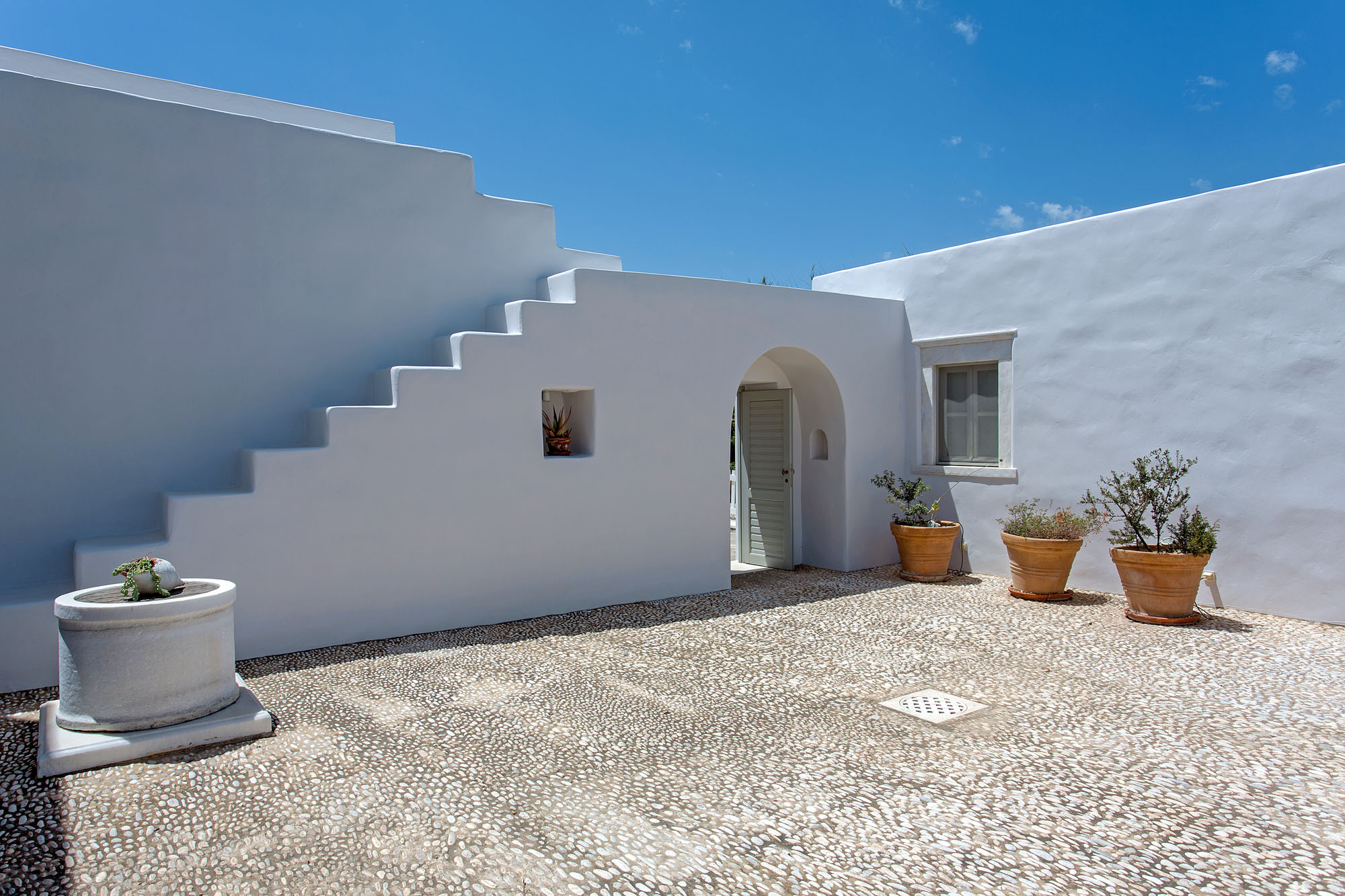 The sleek white house, surrounded by nearly six acres of land with flowers, olive, and fruit trees, looks out to the enticing waters of the Aegean. There’s lots of space, a fabulous main pool, a second smaller pool, and steps up to the roof for far-reaching views.