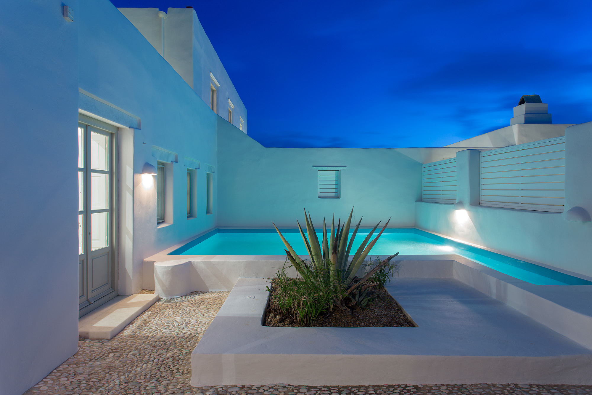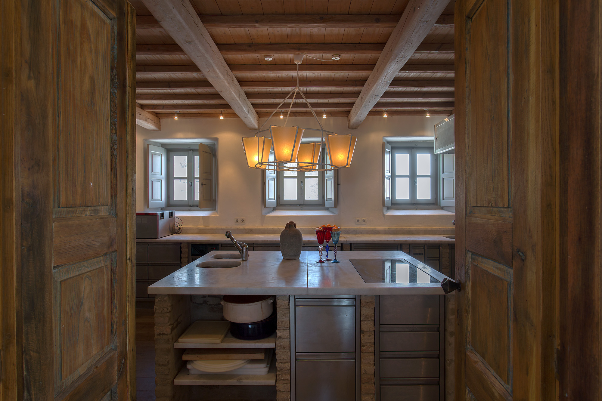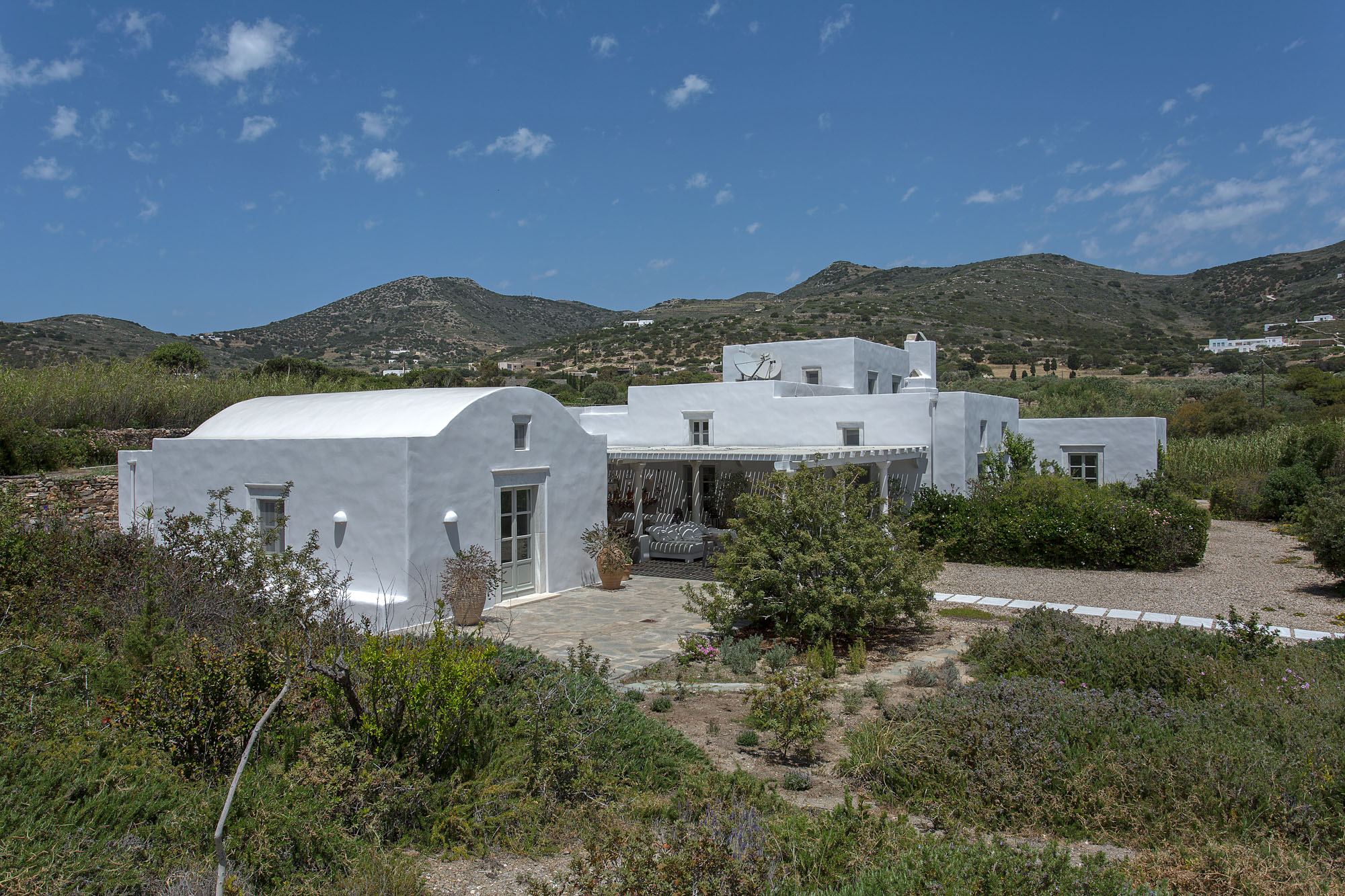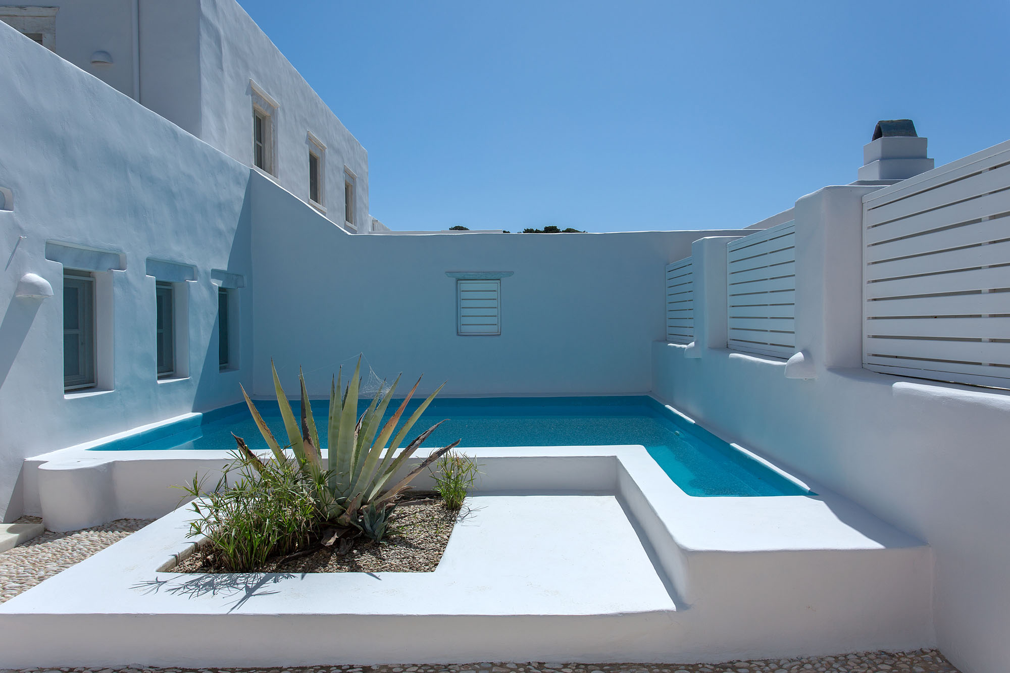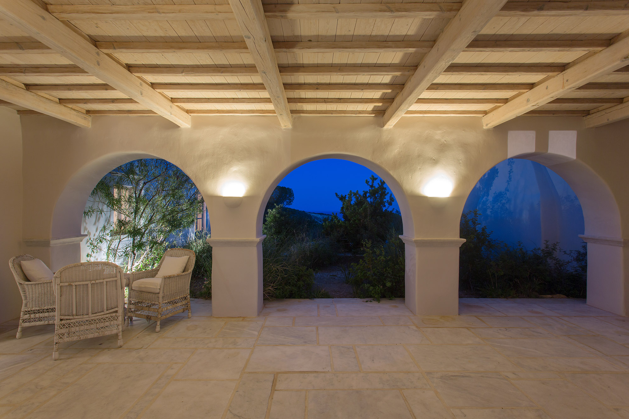 The sleek white house, surrounded by nearly six acres of land with flowers, olive, and fruit trees, looks out to the enticing waters of the Aegean. There’s lots of space, a fabulous main pool, a second smaller pool, and steps up to the roof for far-reaching views.