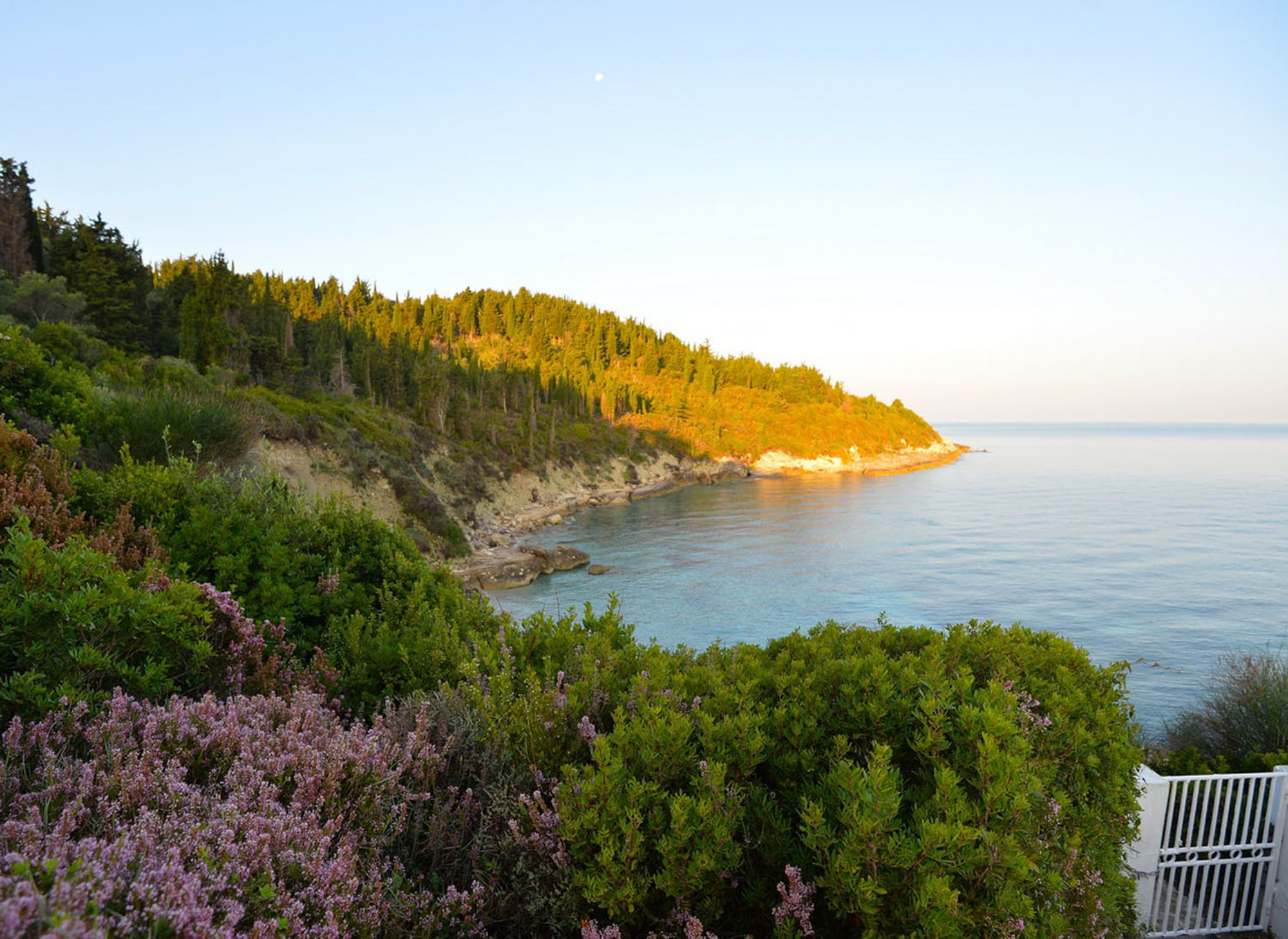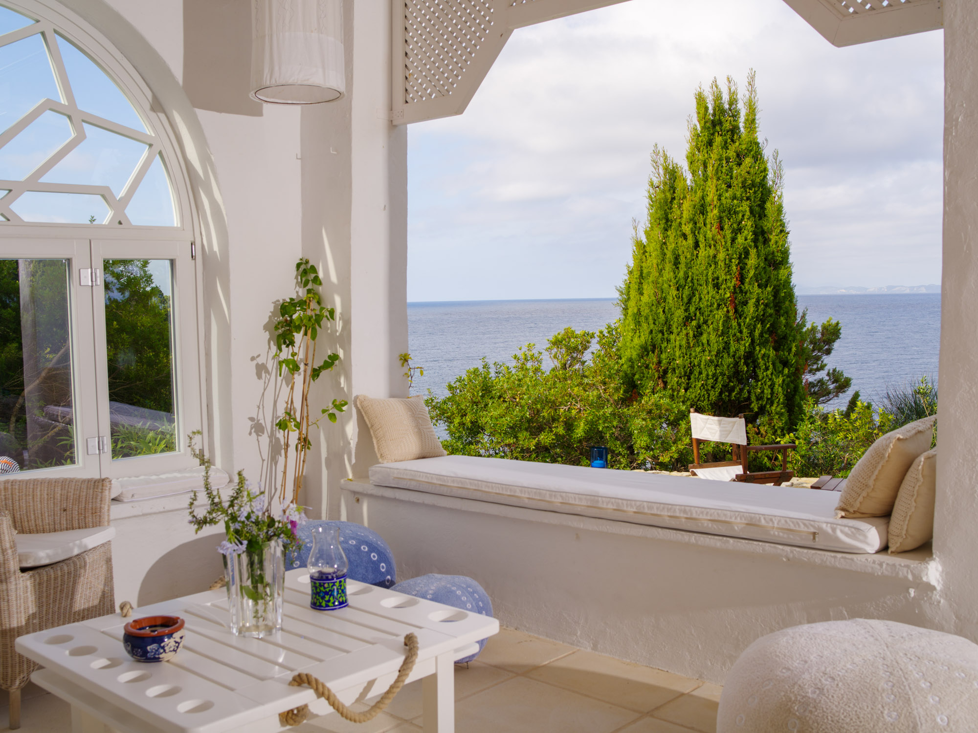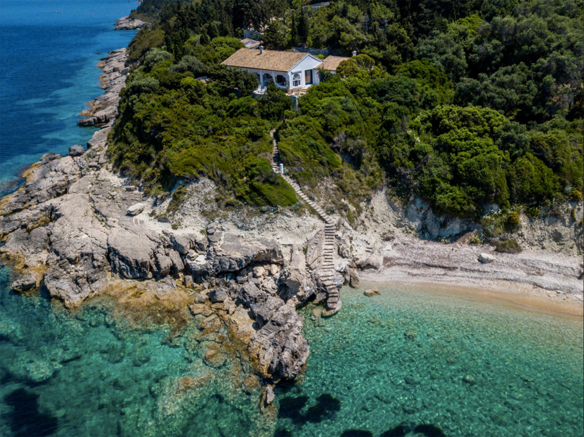 With the beach just steps away, there’s no need for a swimming pool, as the inviting waters of the Ionian Sea are always within reach. The property features two dining areas, a breakfast table, and numerous sitting areas and lounges, offering ample room for both shared gatherings and peaceful retreats.The landscaped gardens, filled with fragrant Mediterranean shrubs and shaded by tall cypress trees, create a tranquil ambiance. Down by the sea, a chic sunbathing terrace with shaded sails and plentiful seating provides the perfect place for unwinding, whether enjoying pre-dinner drinks or simply soaking up the views.