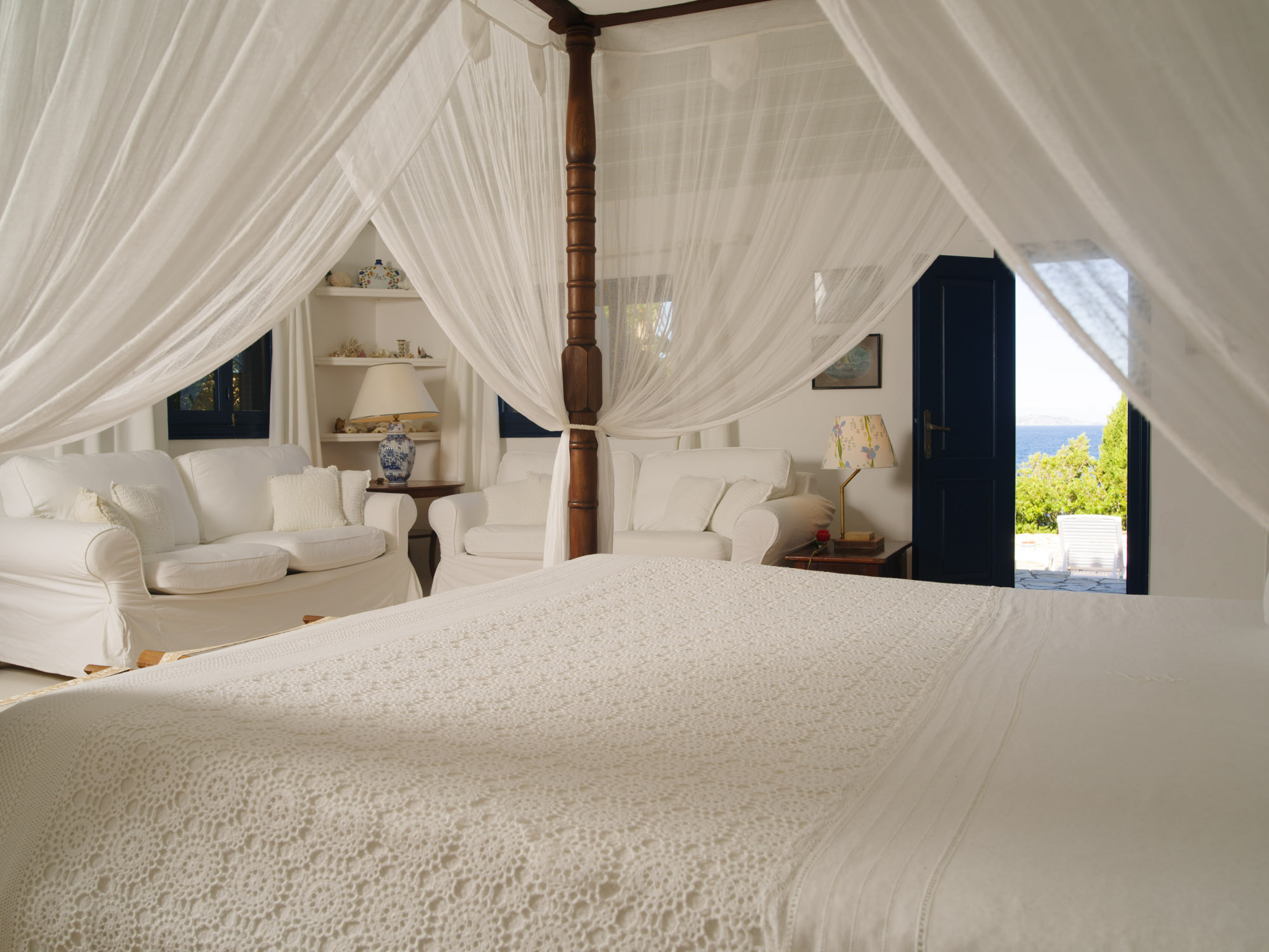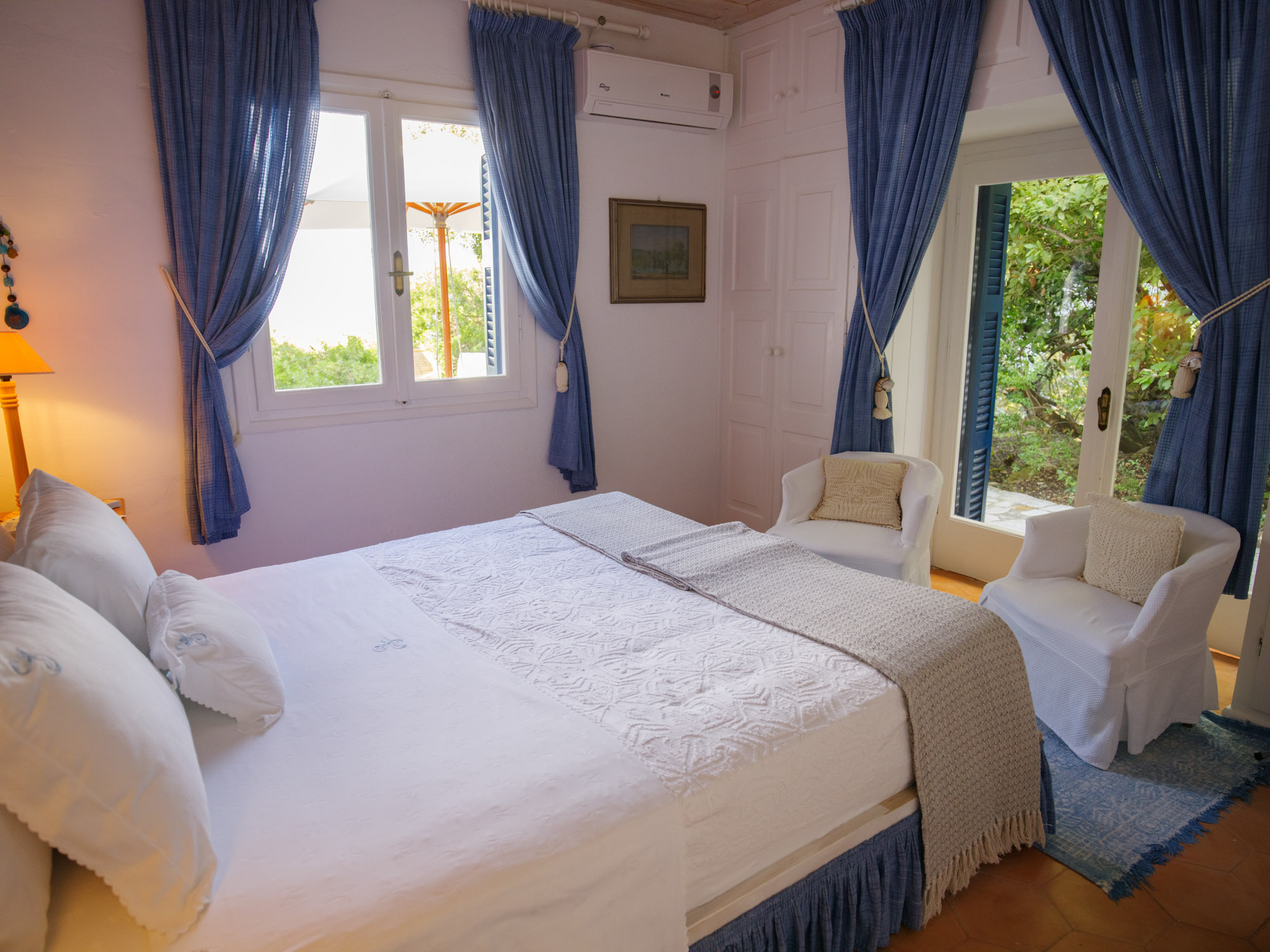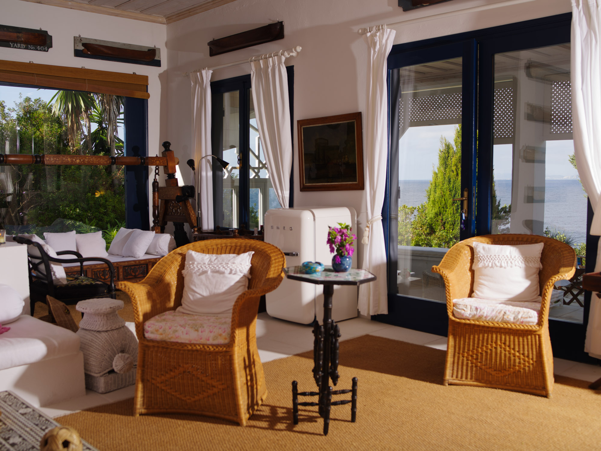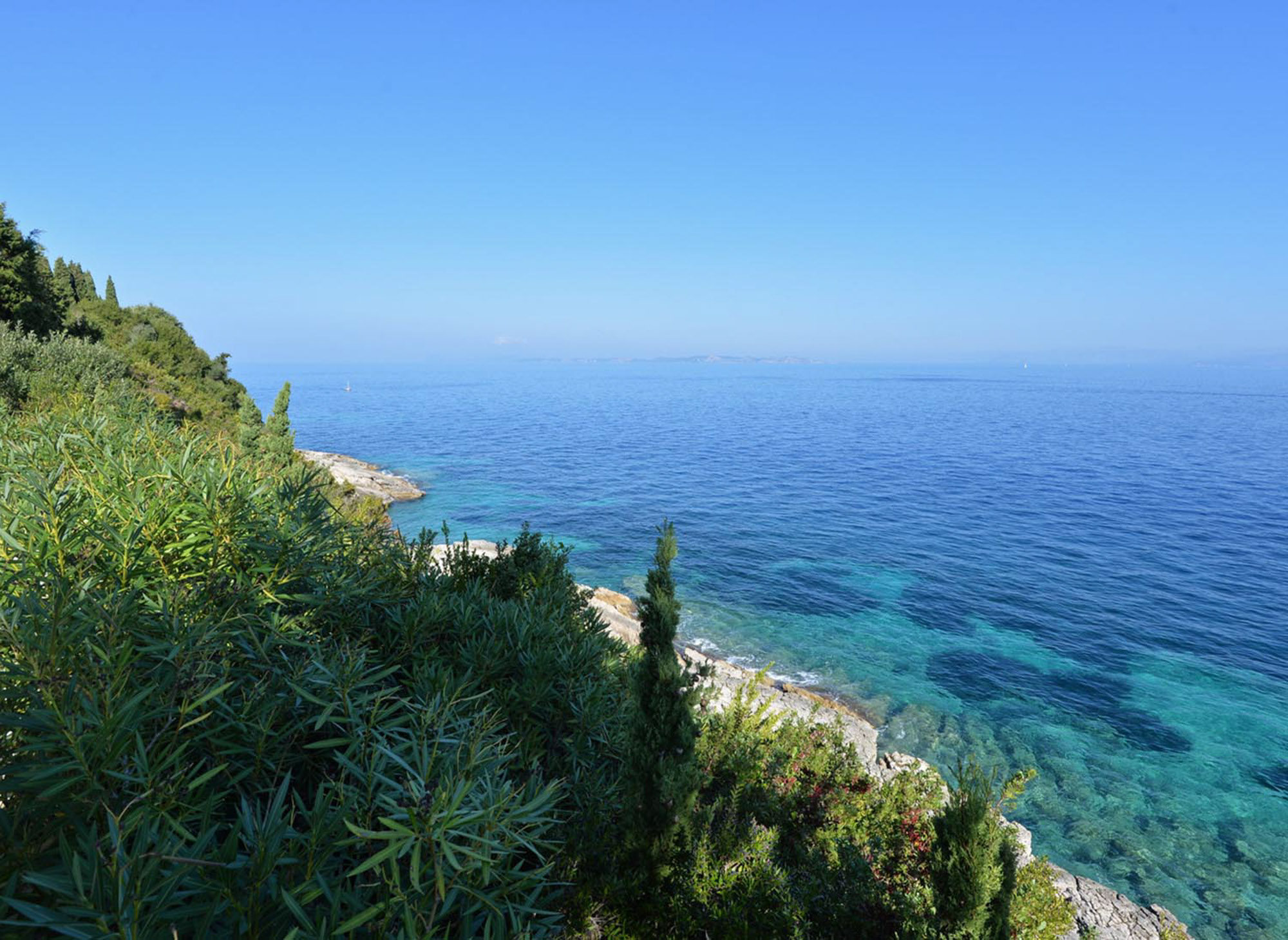 With the beach just steps away, there’s no need for a swimming pool, as the inviting waters of the Ionian Sea are always within reach. The property features two dining areas, a breakfast table, and numerous sitting areas and lounges, offering ample room for both shared gatherings and peaceful retreats.The landscaped gardens, filled with fragrant Mediterranean shrubs and shaded by tall cypress trees, create a tranquil ambiance. Down by the sea, a chic sunbathing terrace with shaded sails and plentiful seating provides the perfect place for unwinding, whether enjoying pre-dinner drinks or simply soaking up the views.